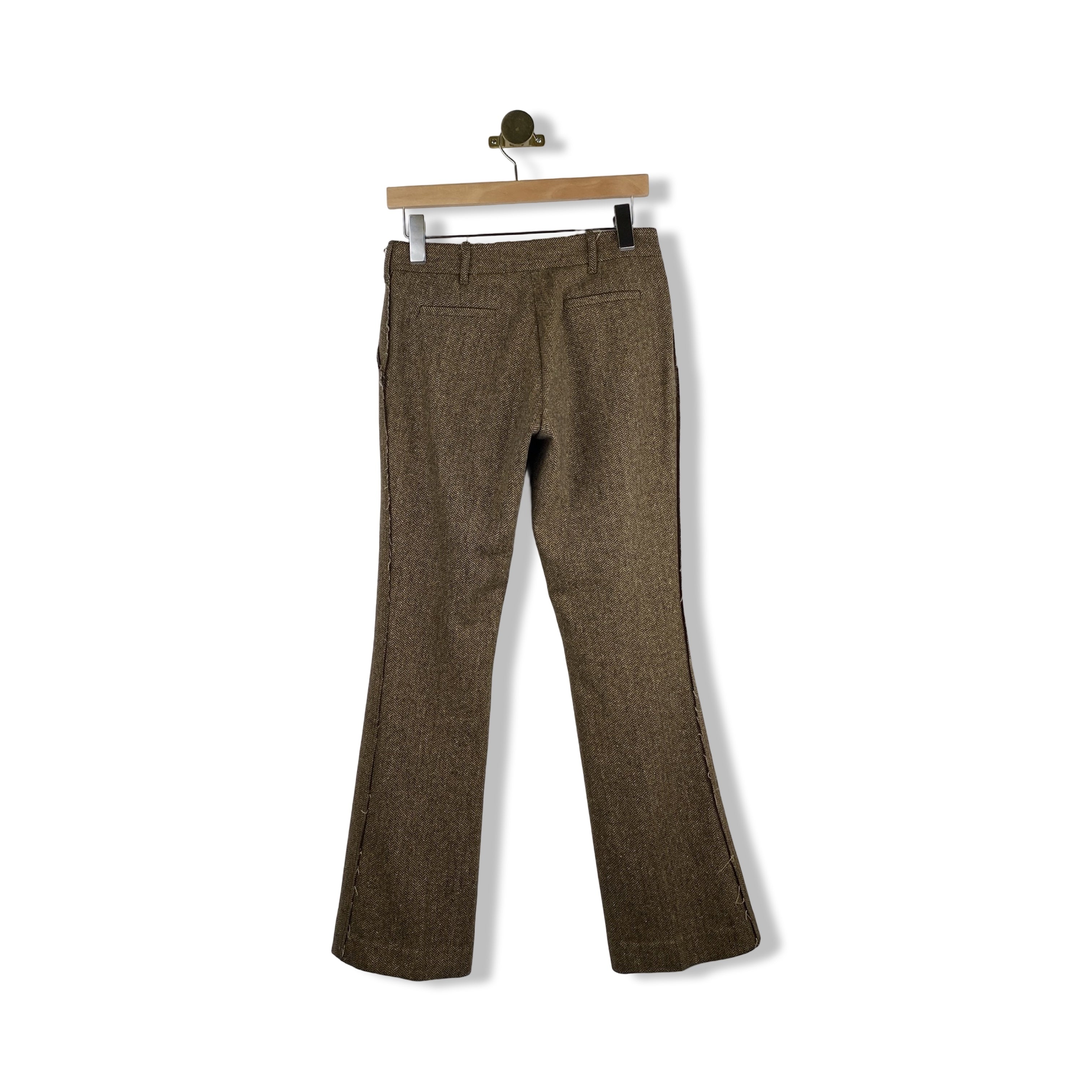 - Low rise, raw edge herring bone pants