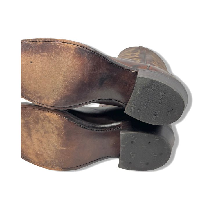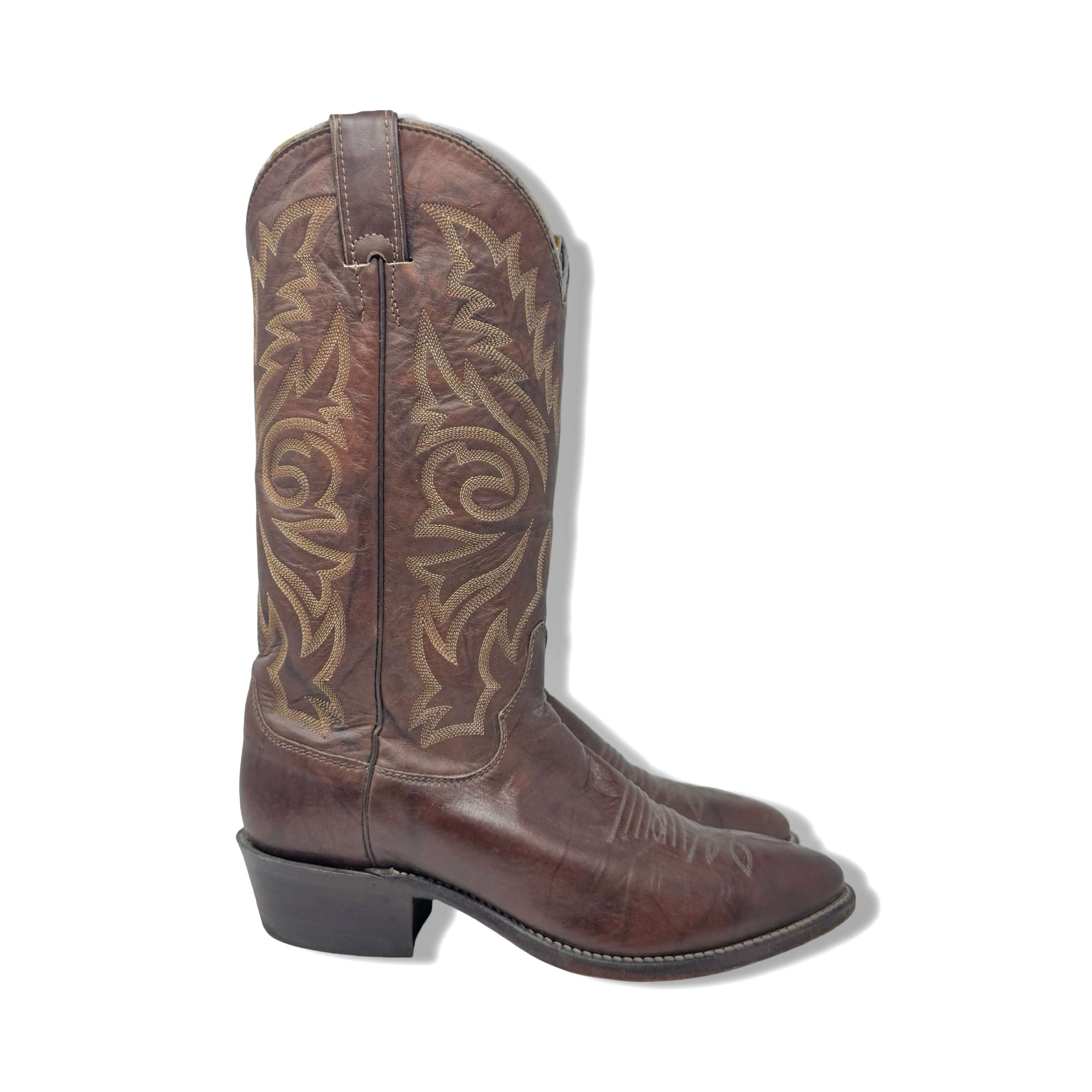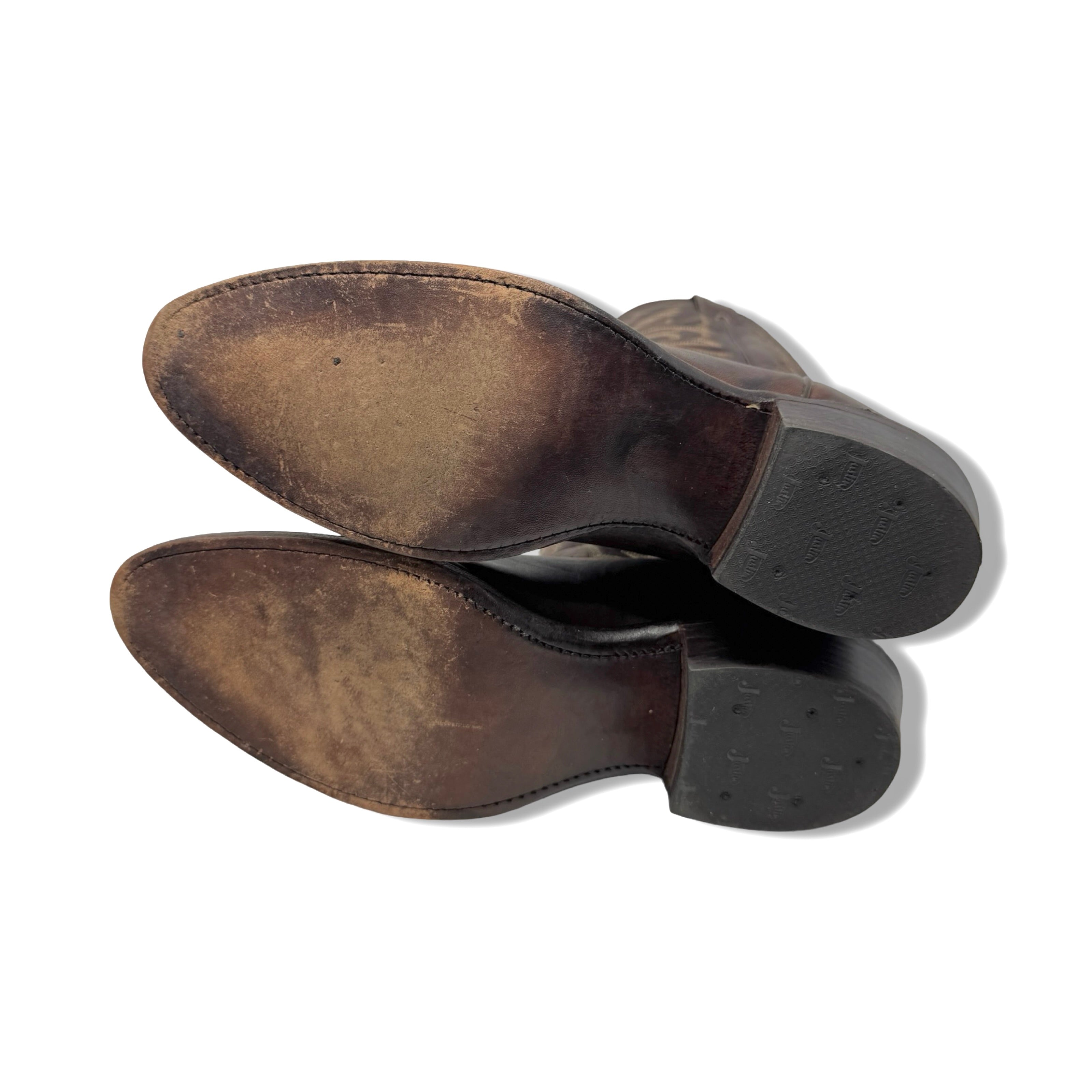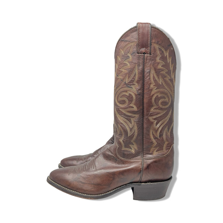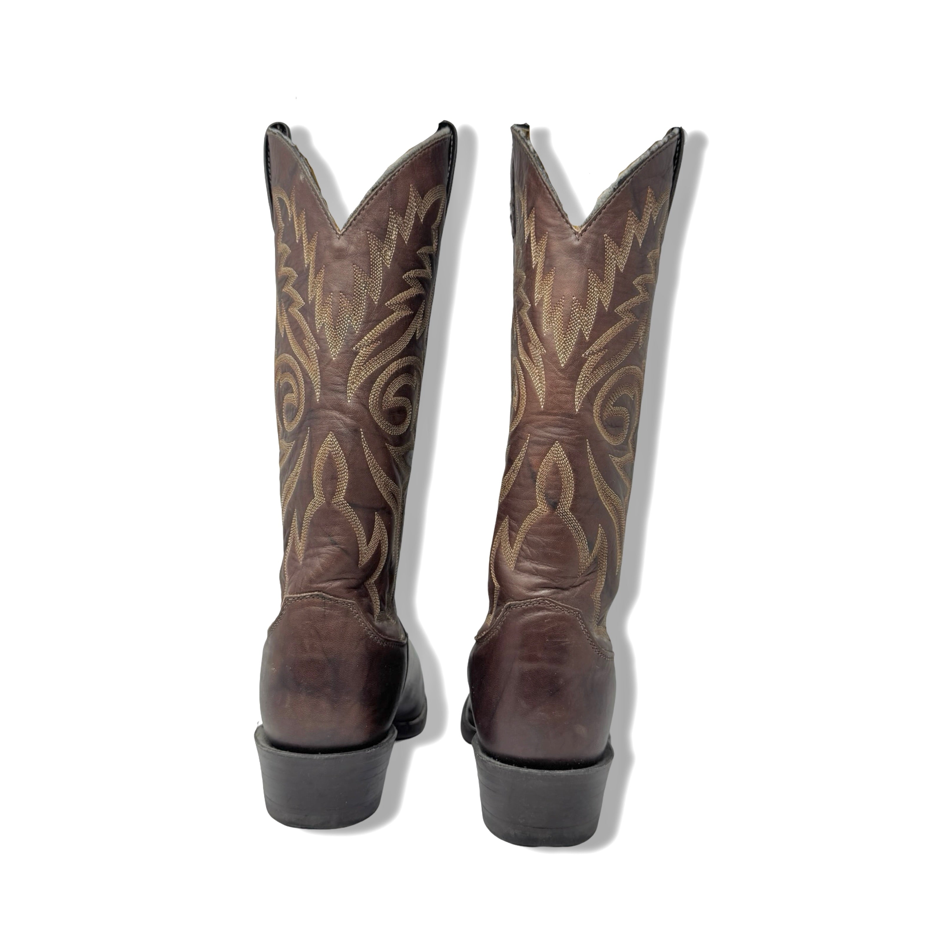 - Slip on boots with pointed toe and stitch detailing throughout. Pull tabs on sides. Labeled size 7.5D. Some signs of wear.