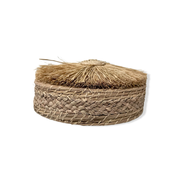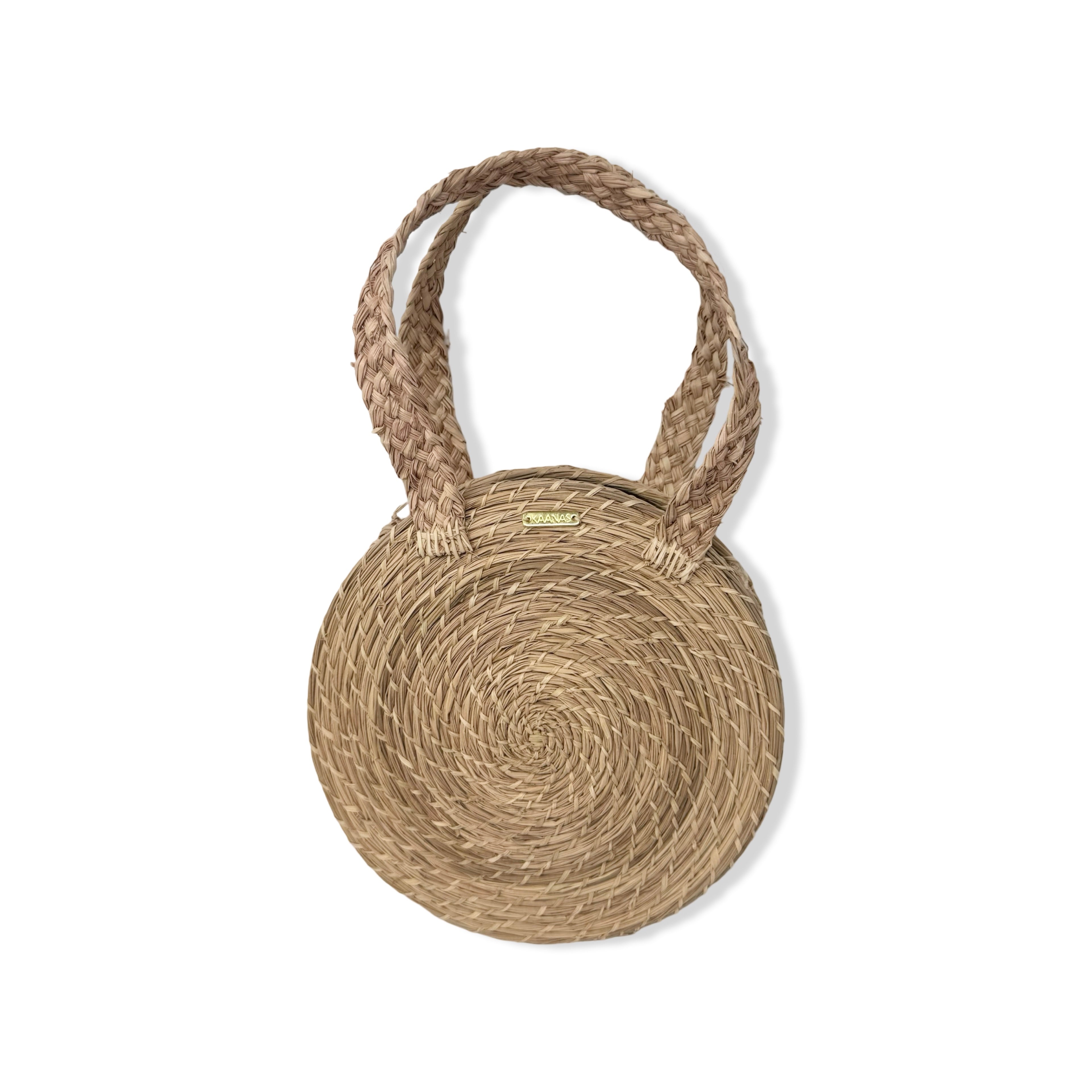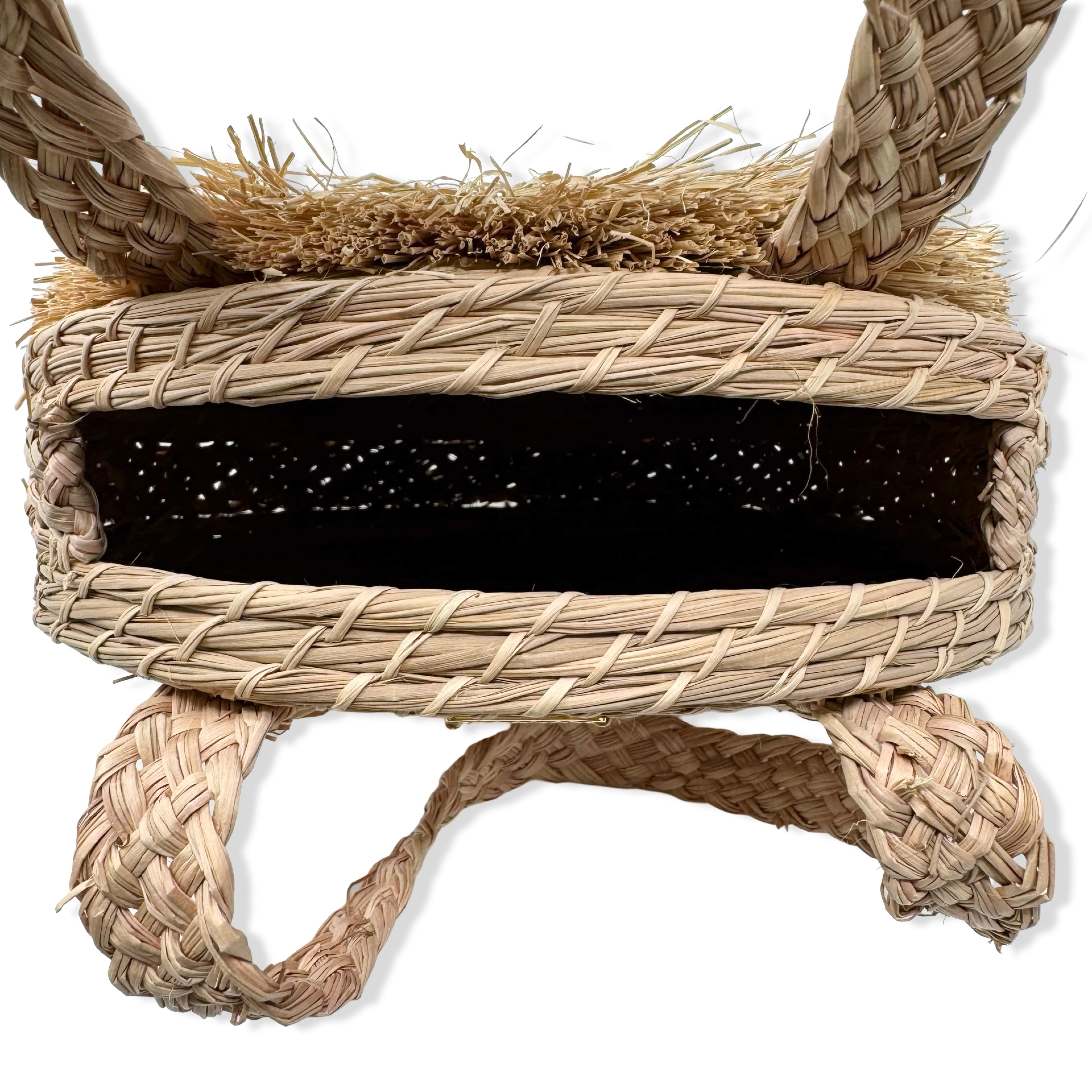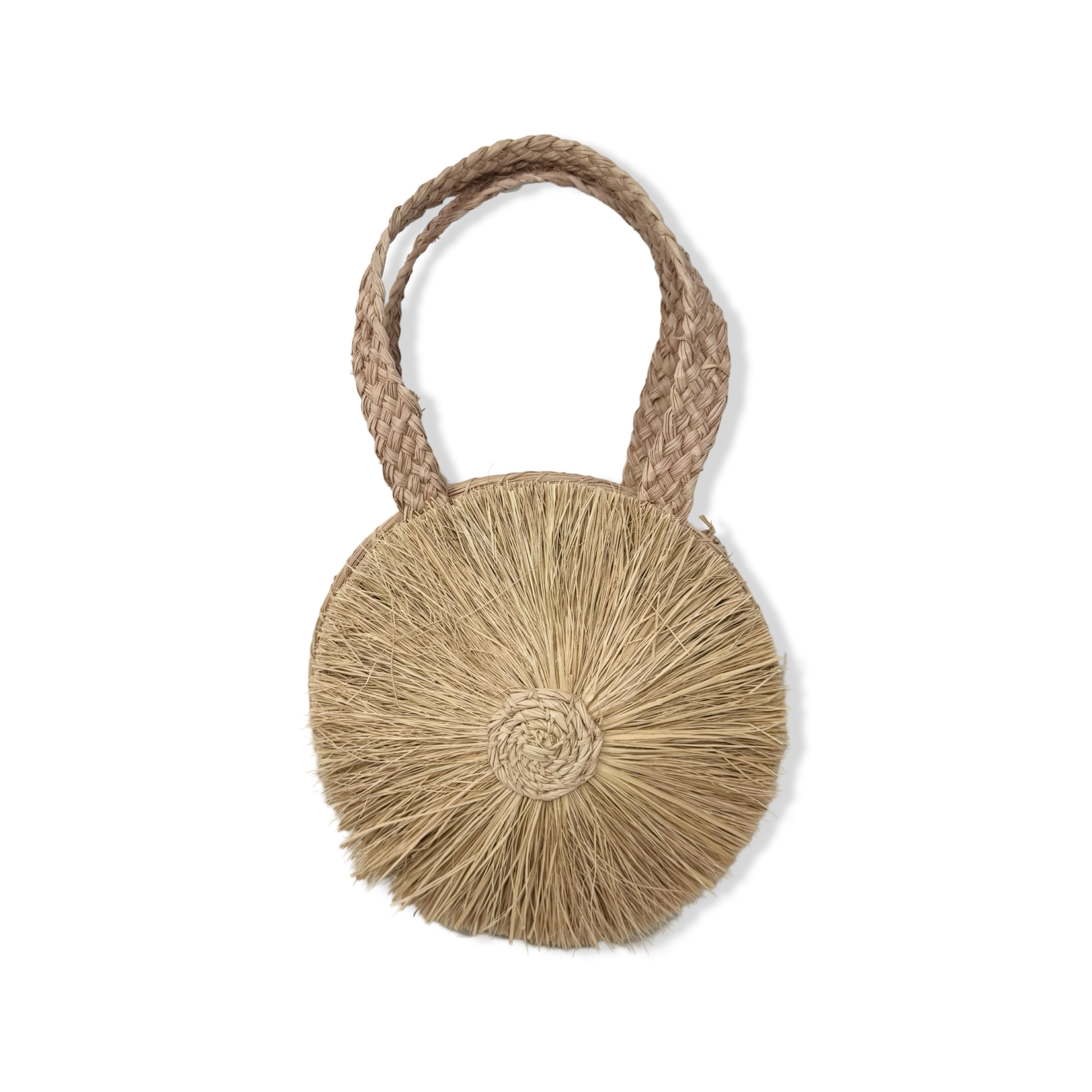 - Circular straw bag with open top.
