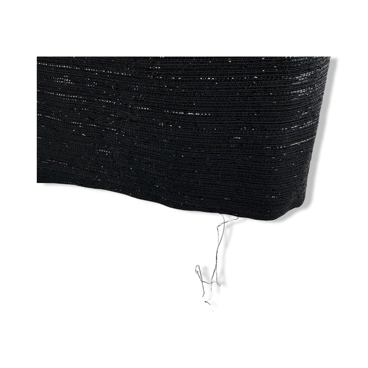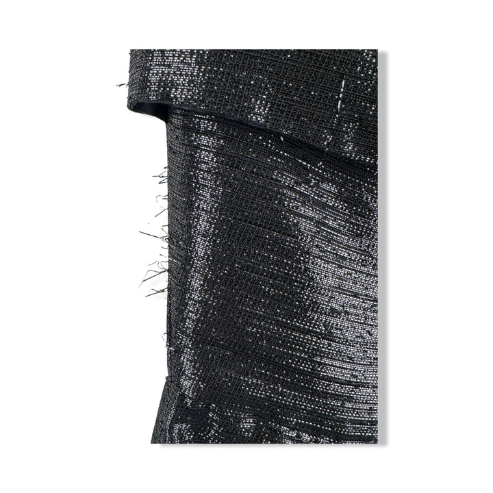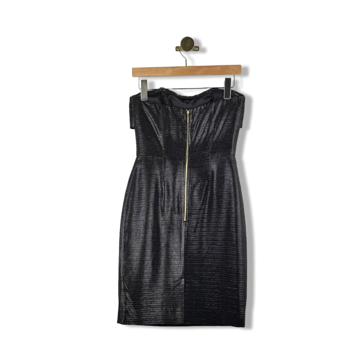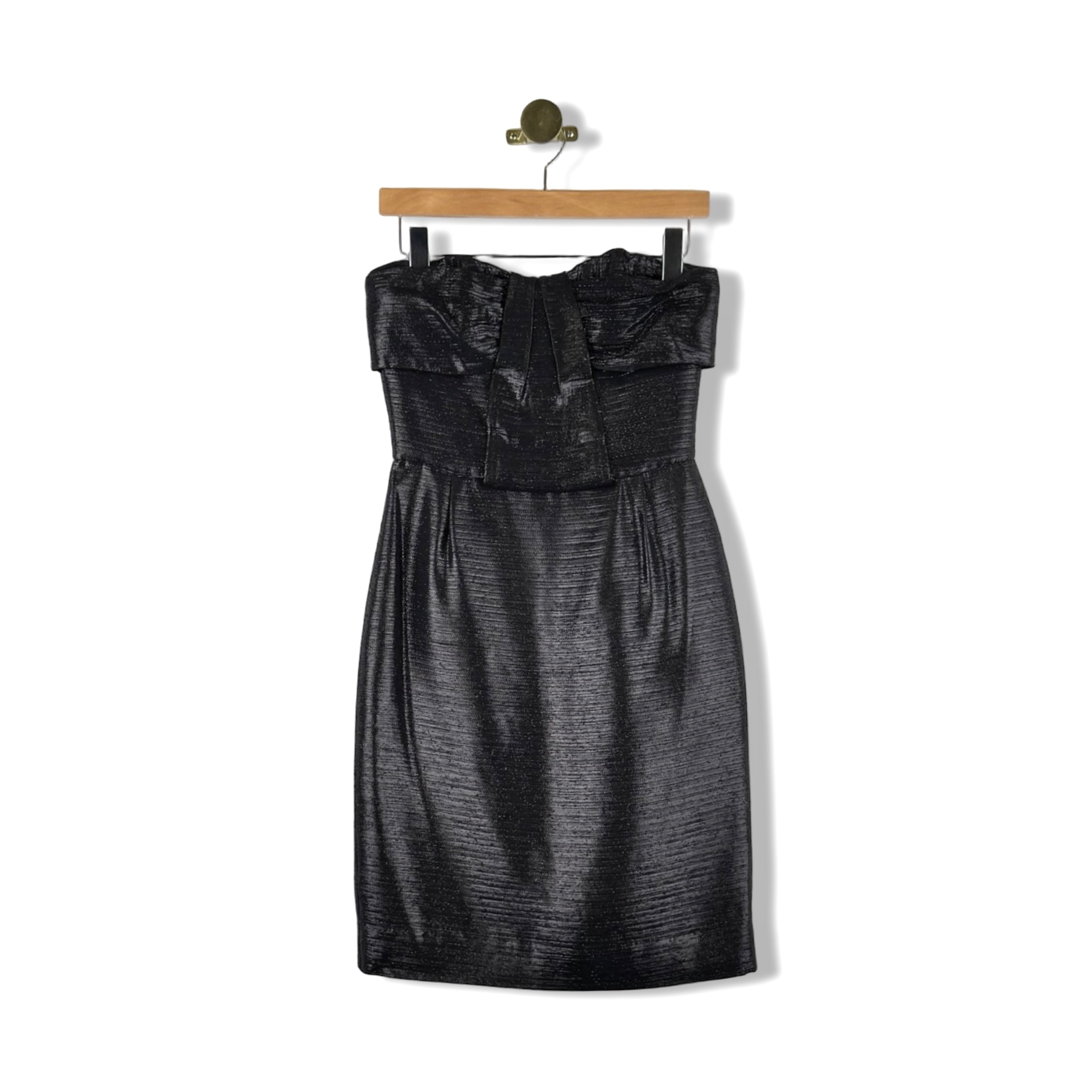 - Strapless metallic thread cocktail dress with zip closure on back and pleated detail on front. Some signs of wear.