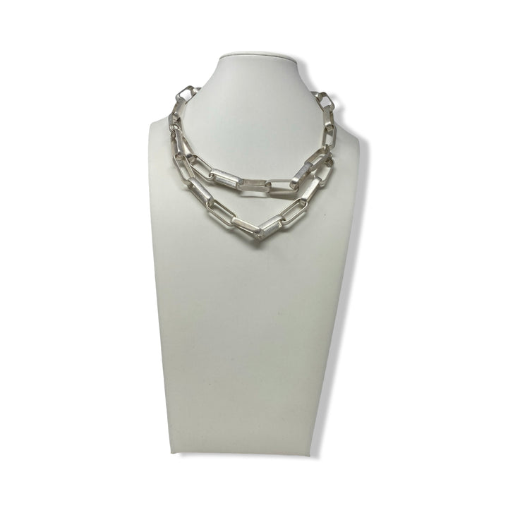- Long link chain necklace with layered detail and lobster claw clasp. "KC" Marking.