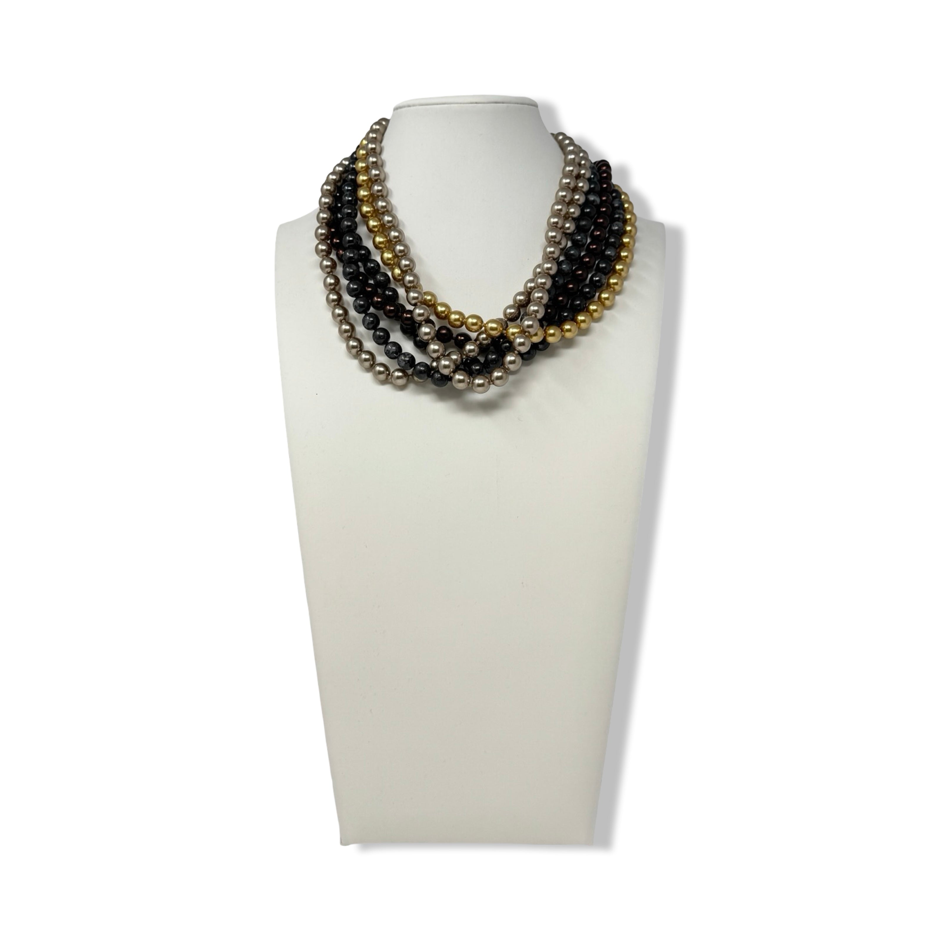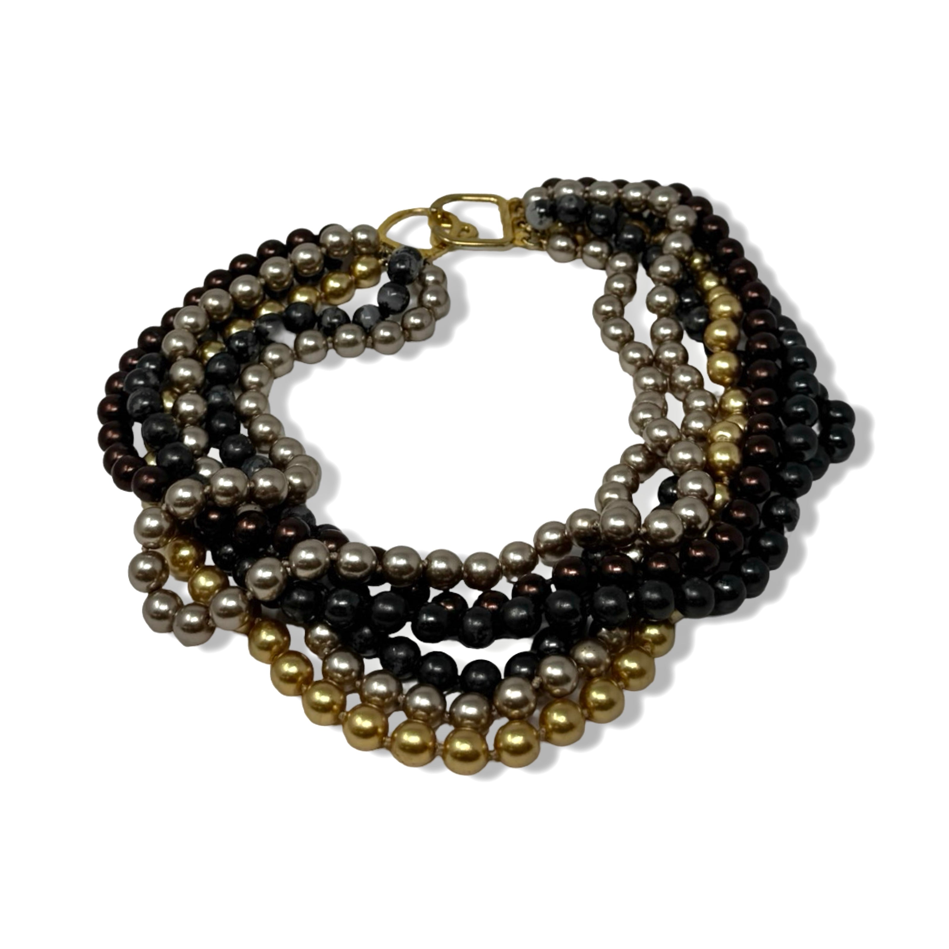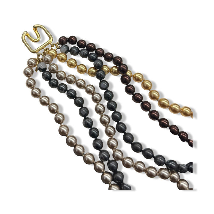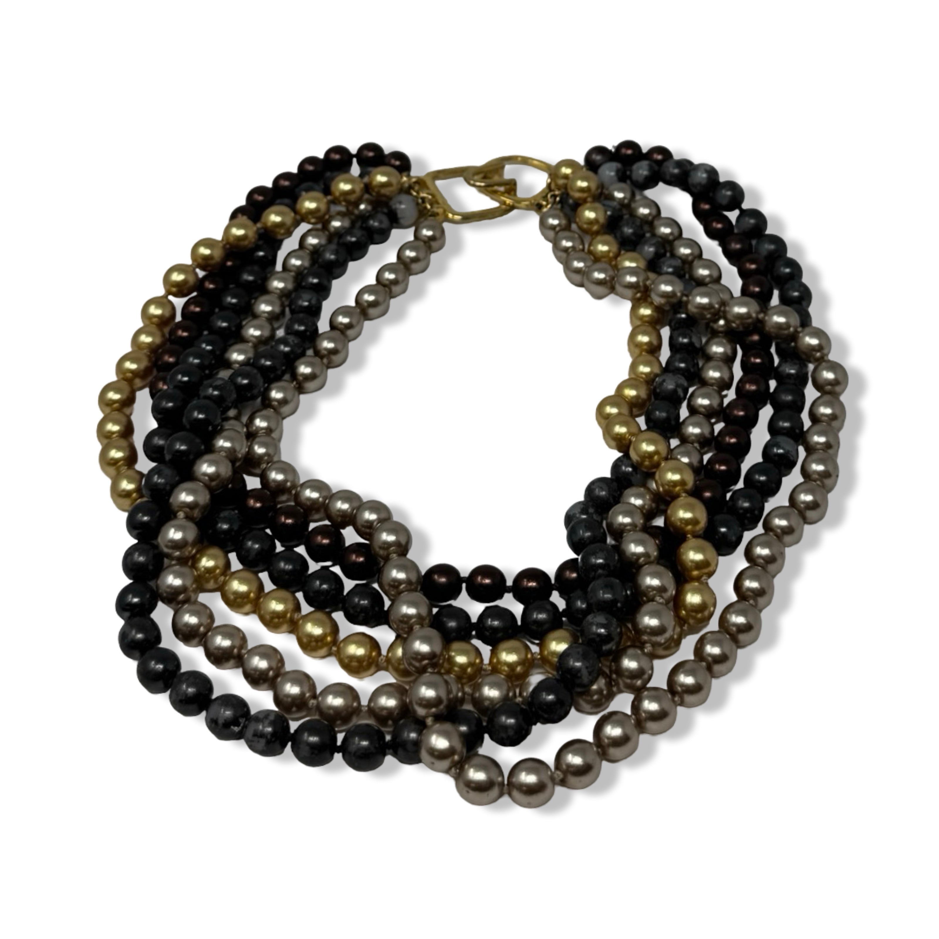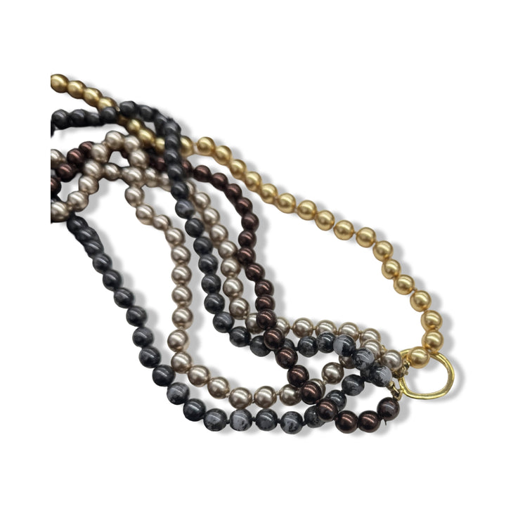 - Multistrand bead necklace with hook closure. Signs of wear throughout.