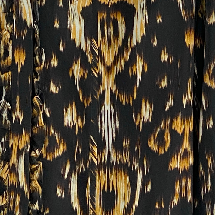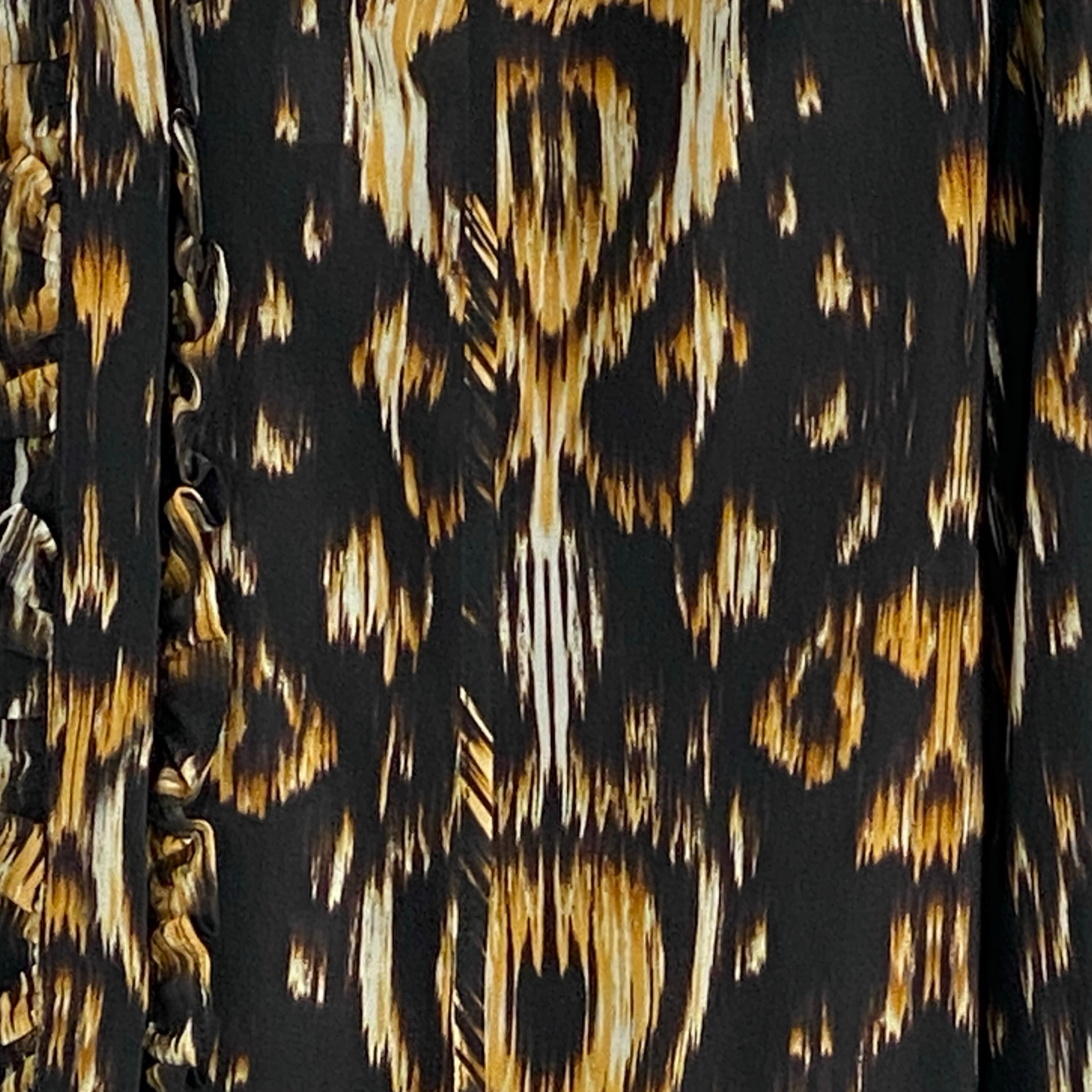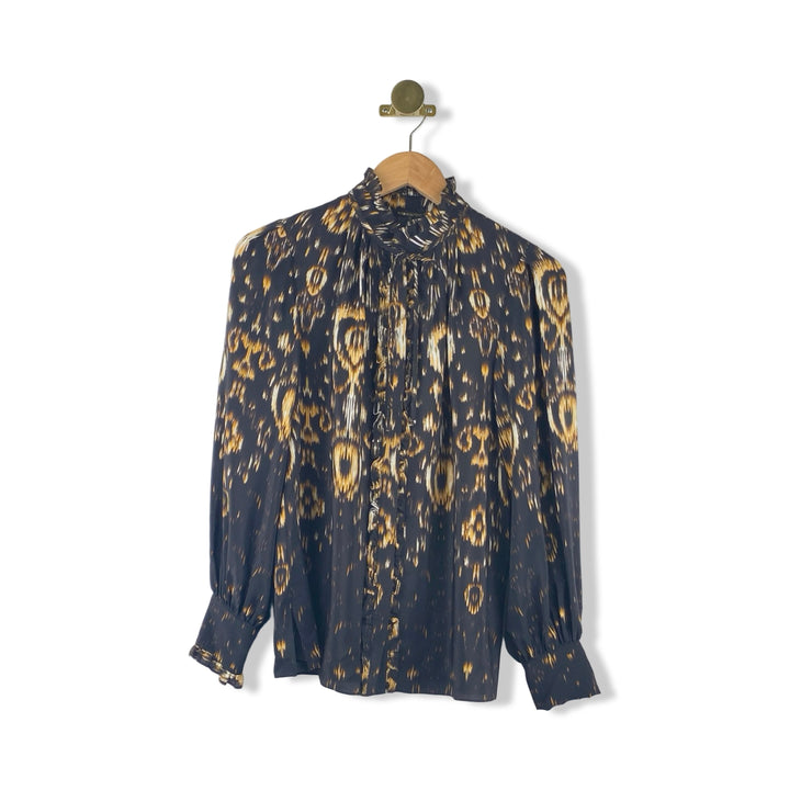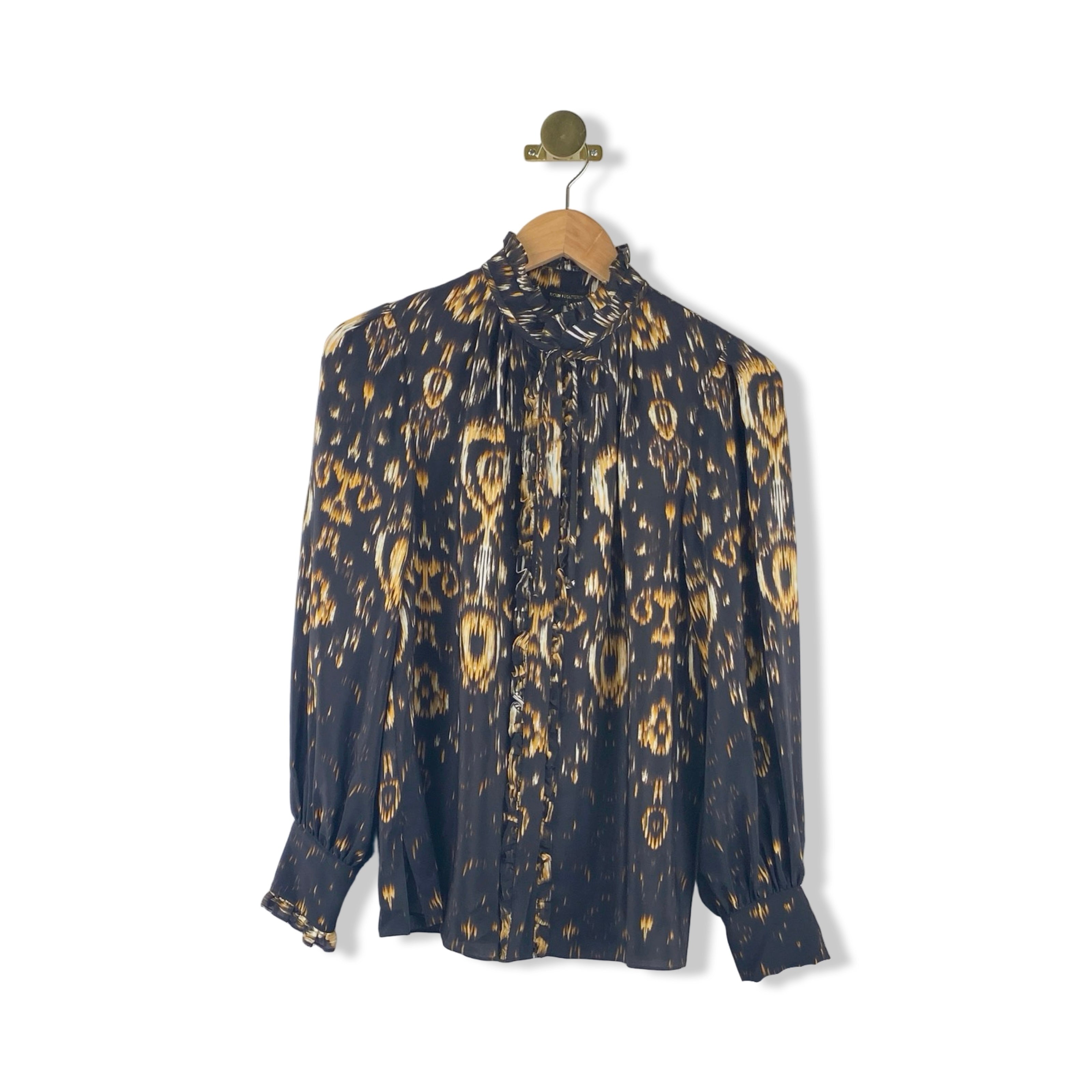 - Ruffled mandarin collar top with shell-button closure, extended cuffs with ruffle trim