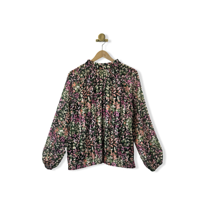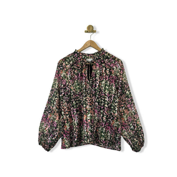- Ruffle collared tie front blouse with cinched balloon sleeves