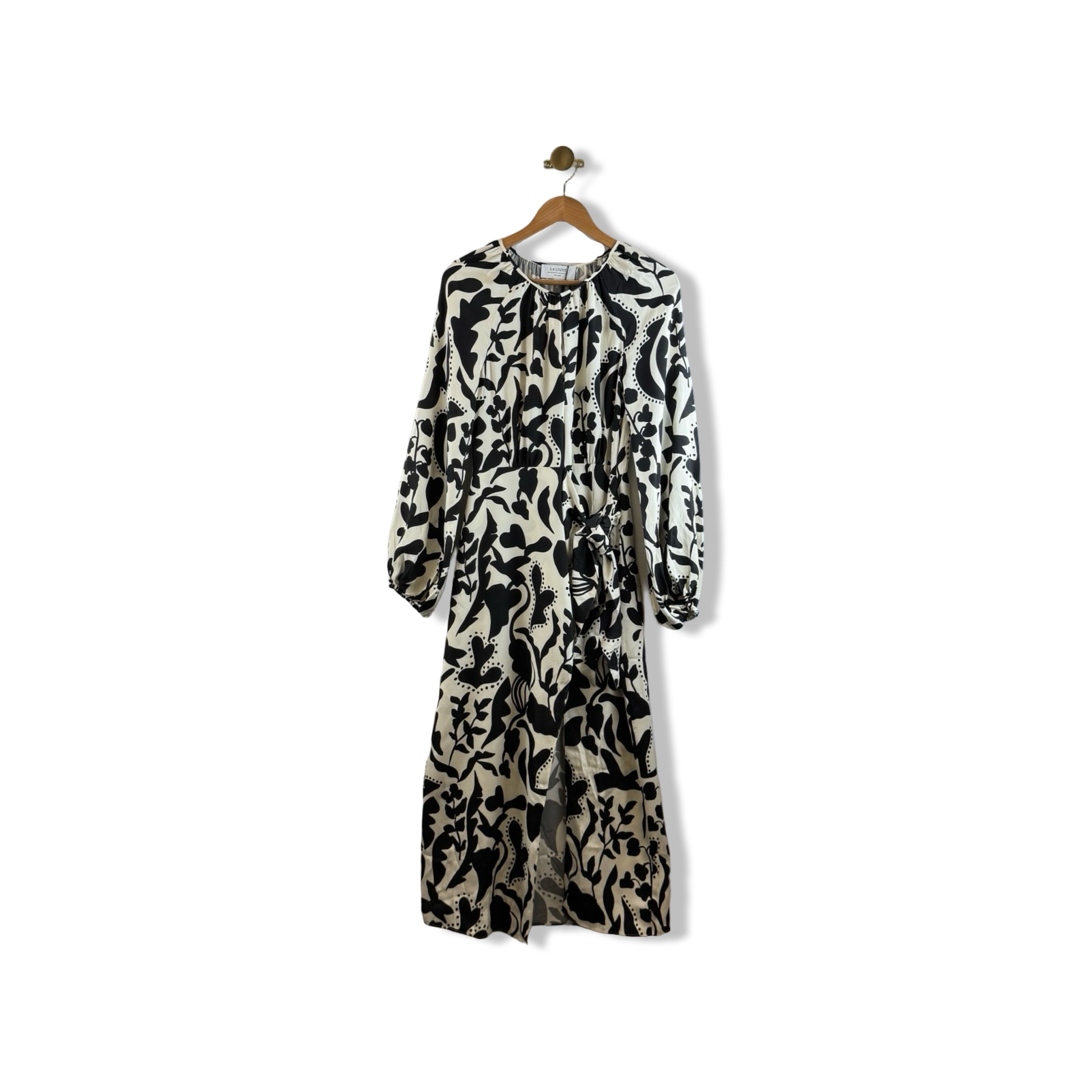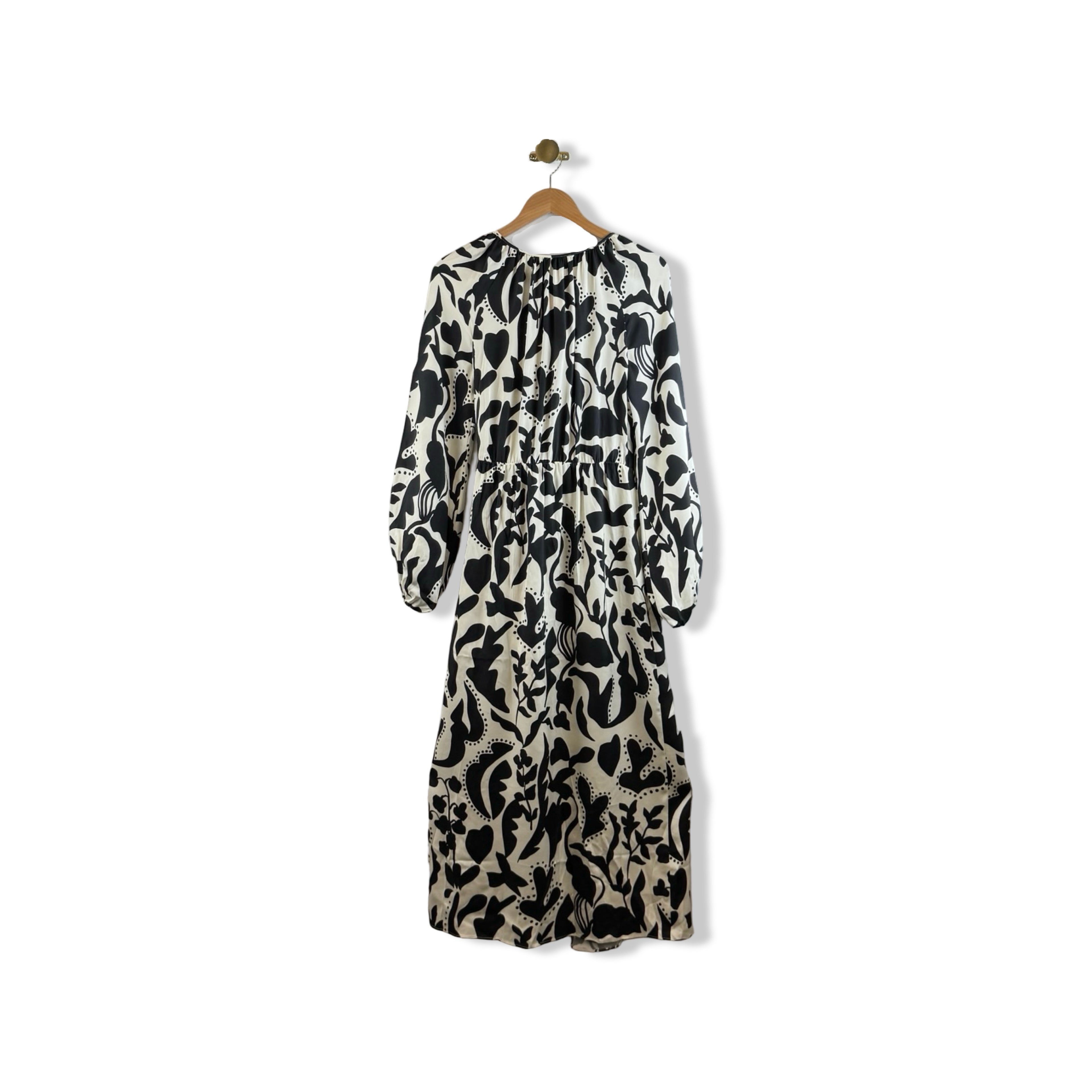 - Floral maxi dress with hooked bodice, front slit, tie at waist, and side zip closure