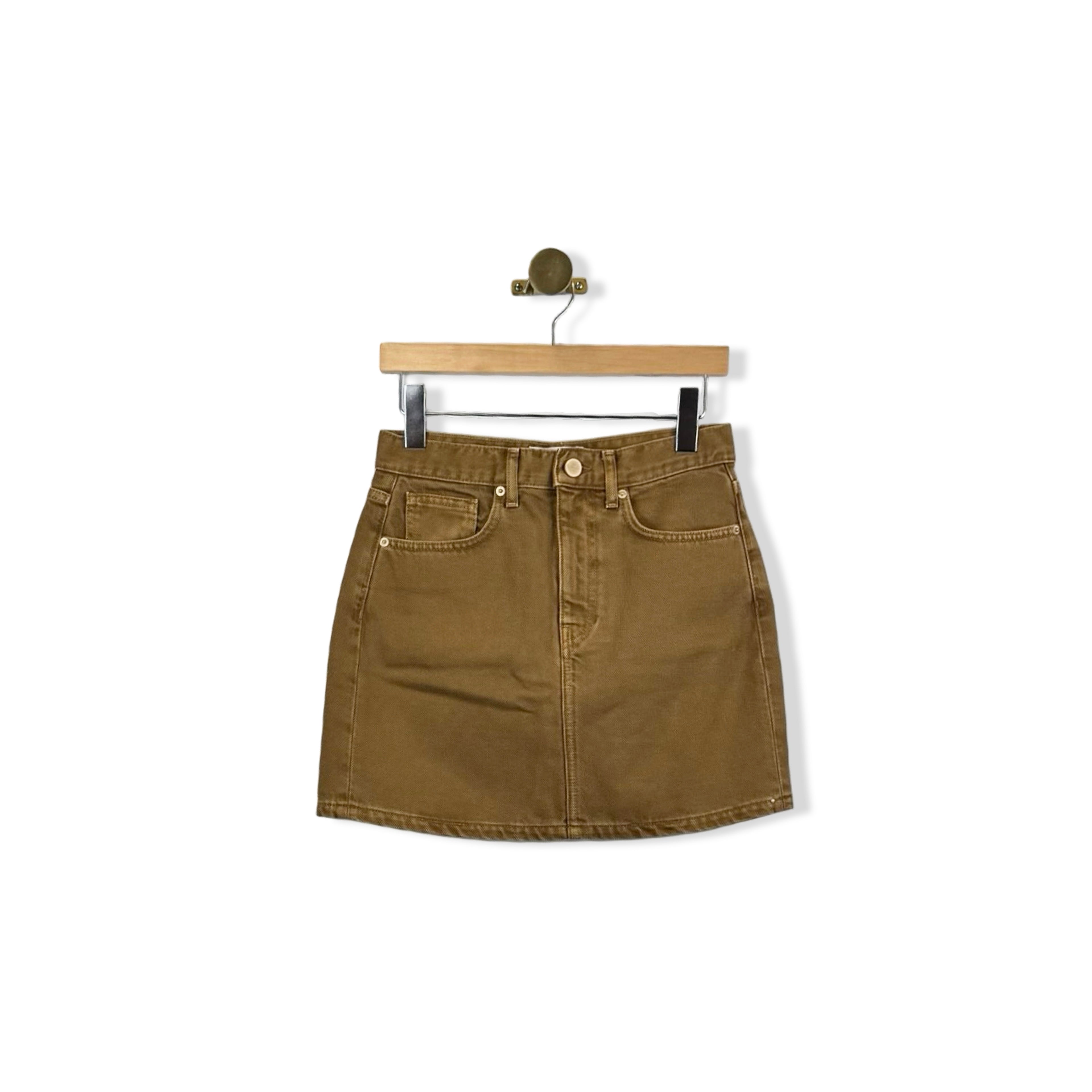 - Five pocket style mini skirt with button zip fly