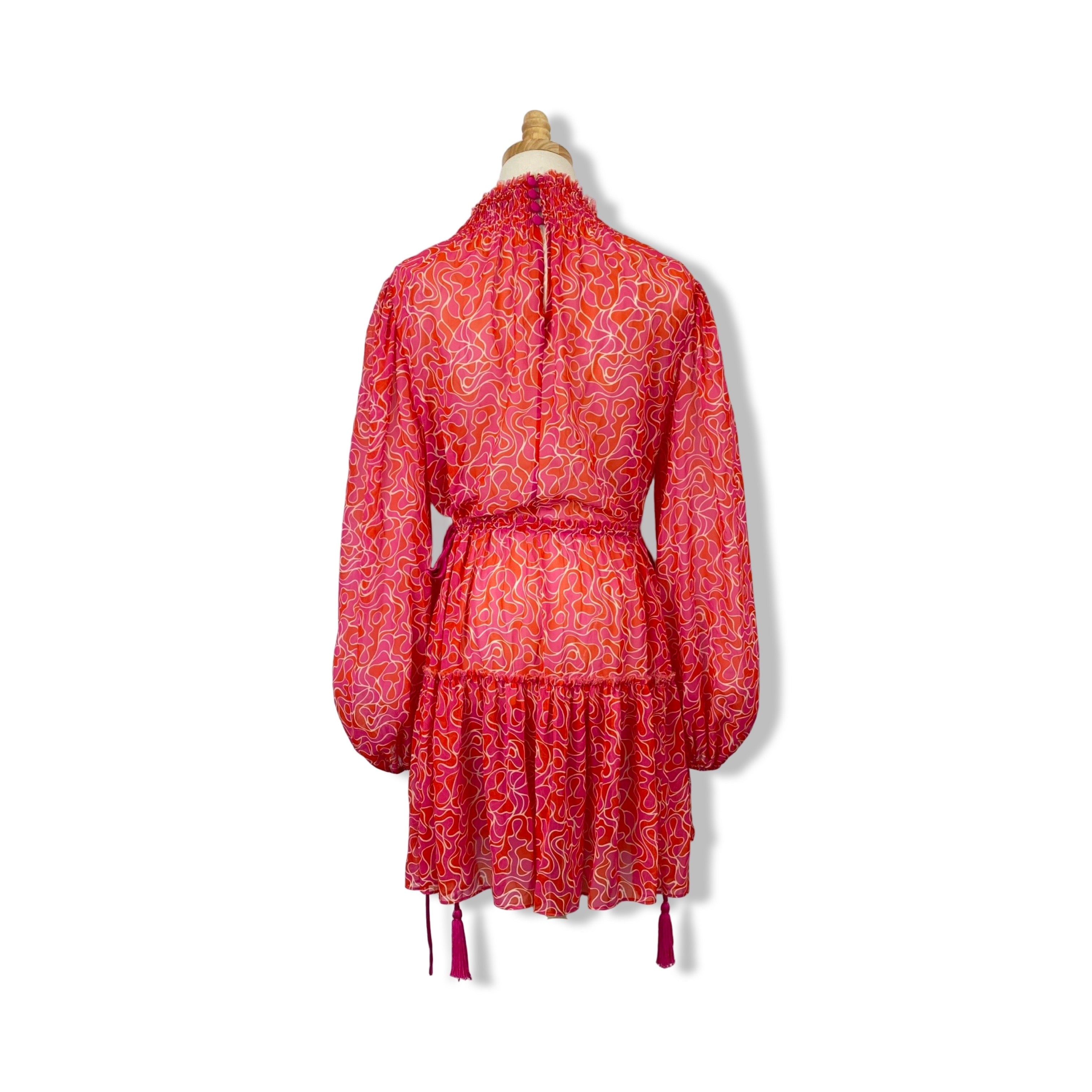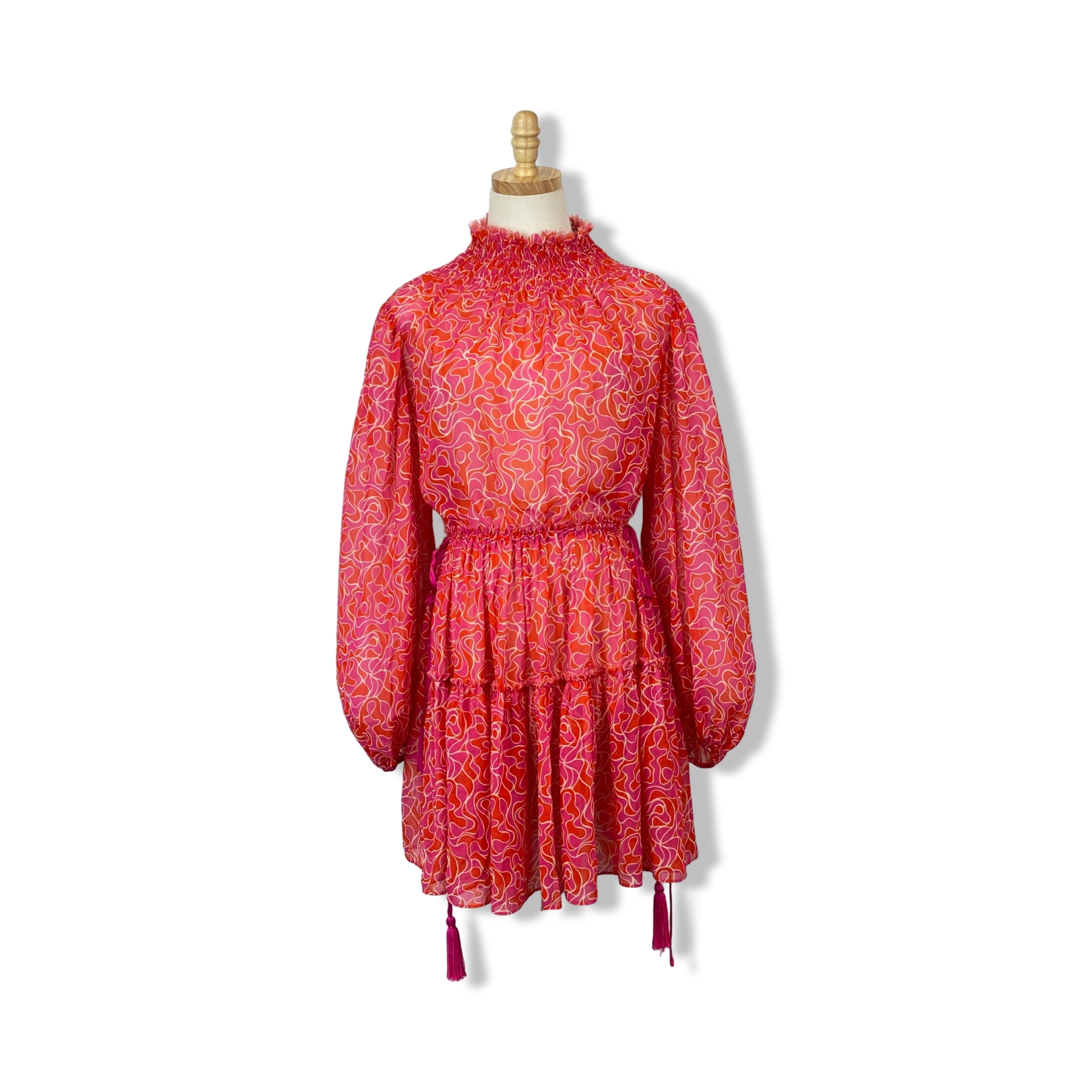 - Mock neck sheer long sleeve dress with drawstring on waist. Frayed trim with elastic cuffs.
