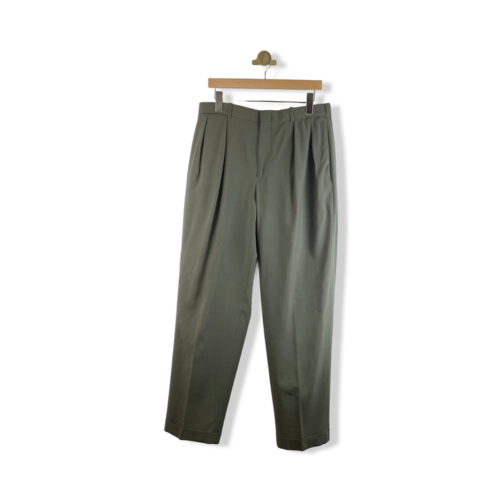- Pleat front pants with dual front and back pockets. Hook and bar closure
