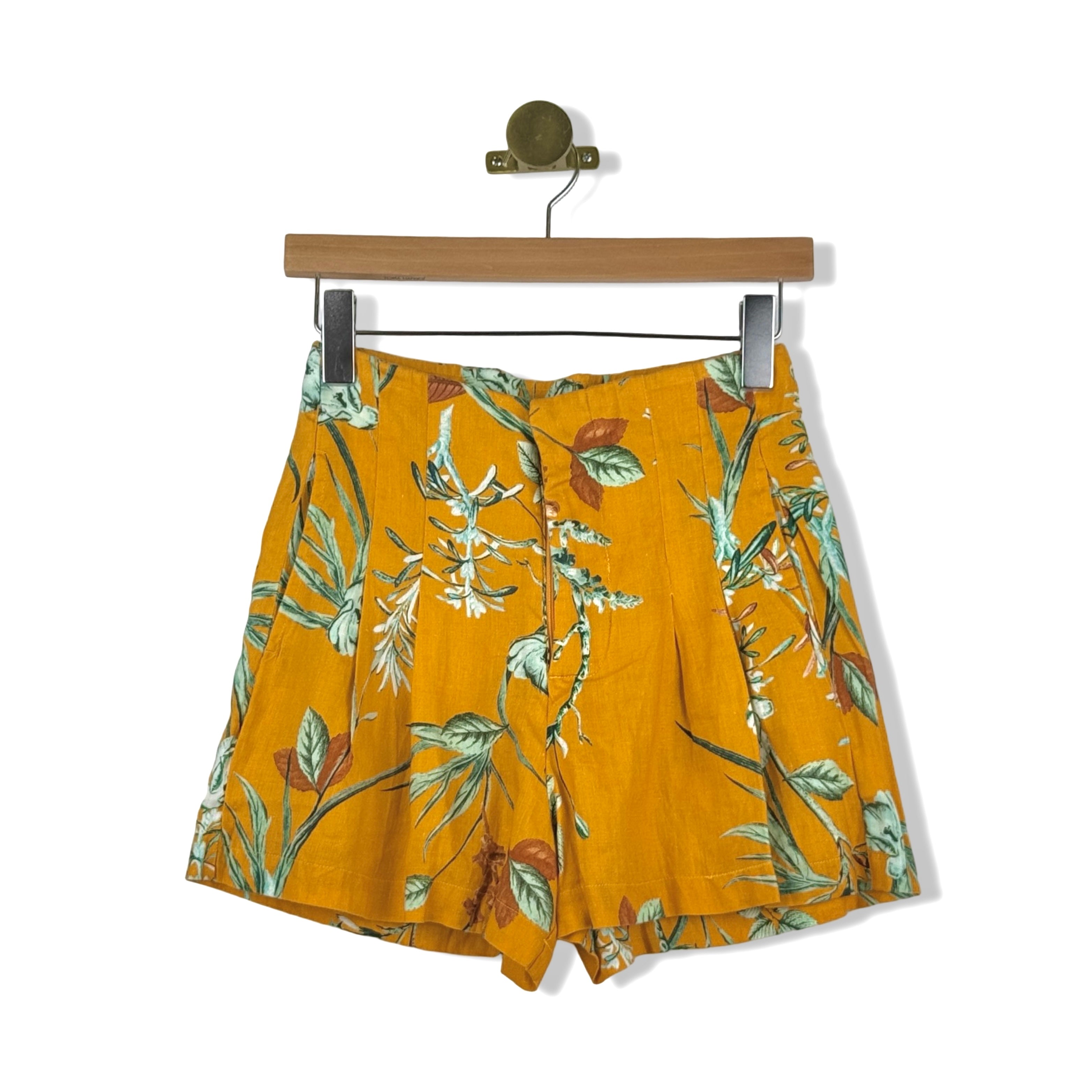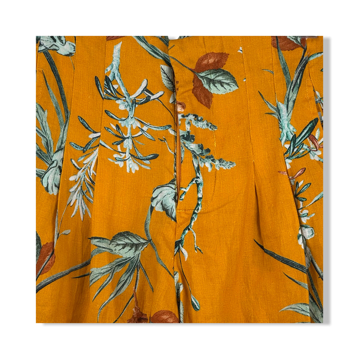 - Floral print shorts with pleated detail on front, side seam pockets, back pockets and a zip fly with a hook-and-bar closure.