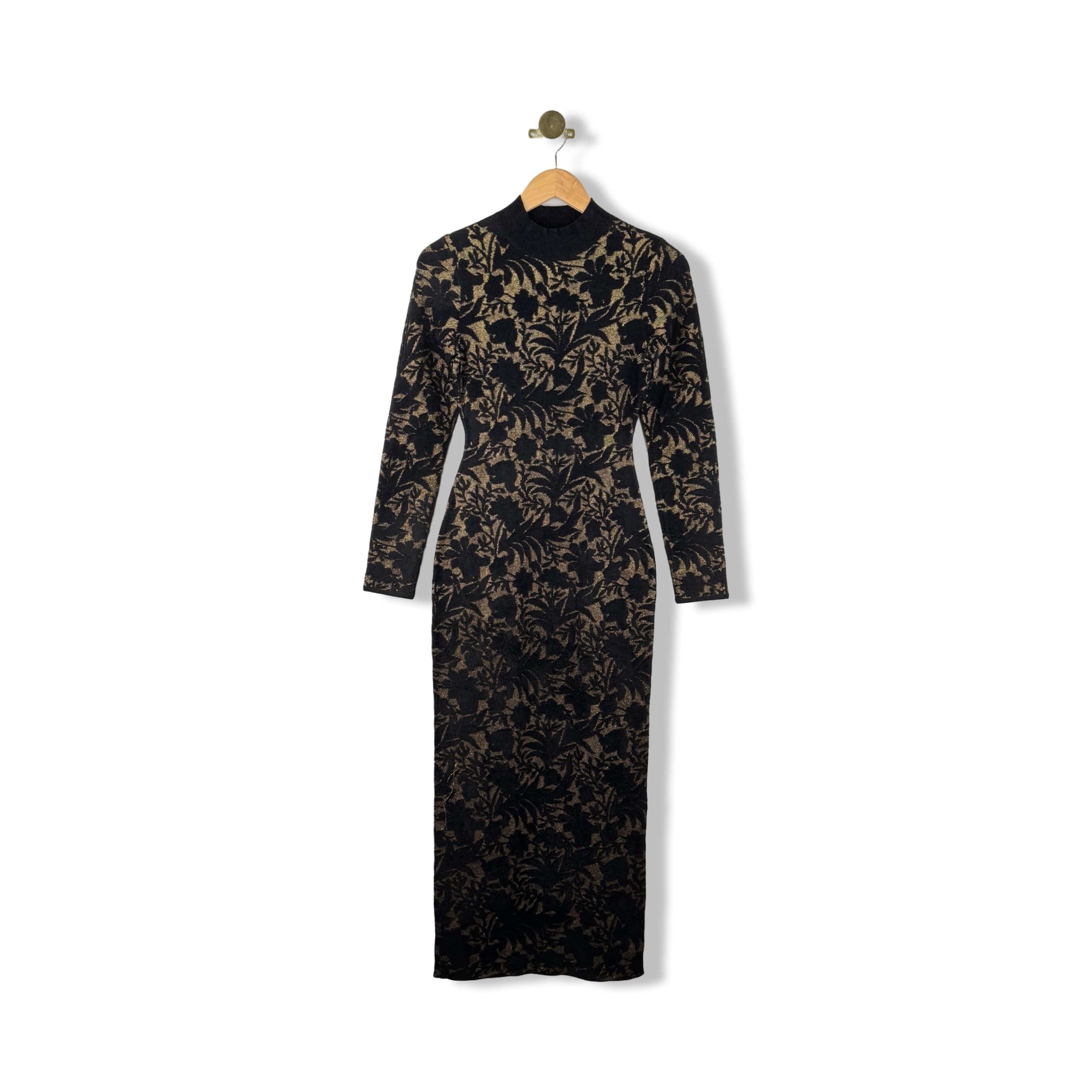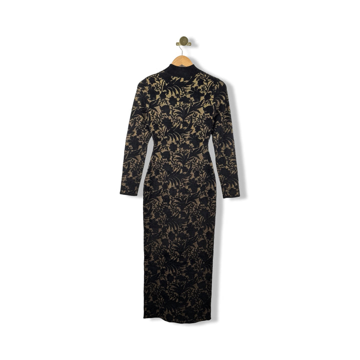- Long sleeve knit midi dress with floral print throughout.