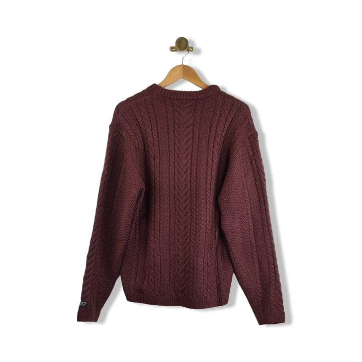 - Long sleeve cable knit sweater with rib trim.