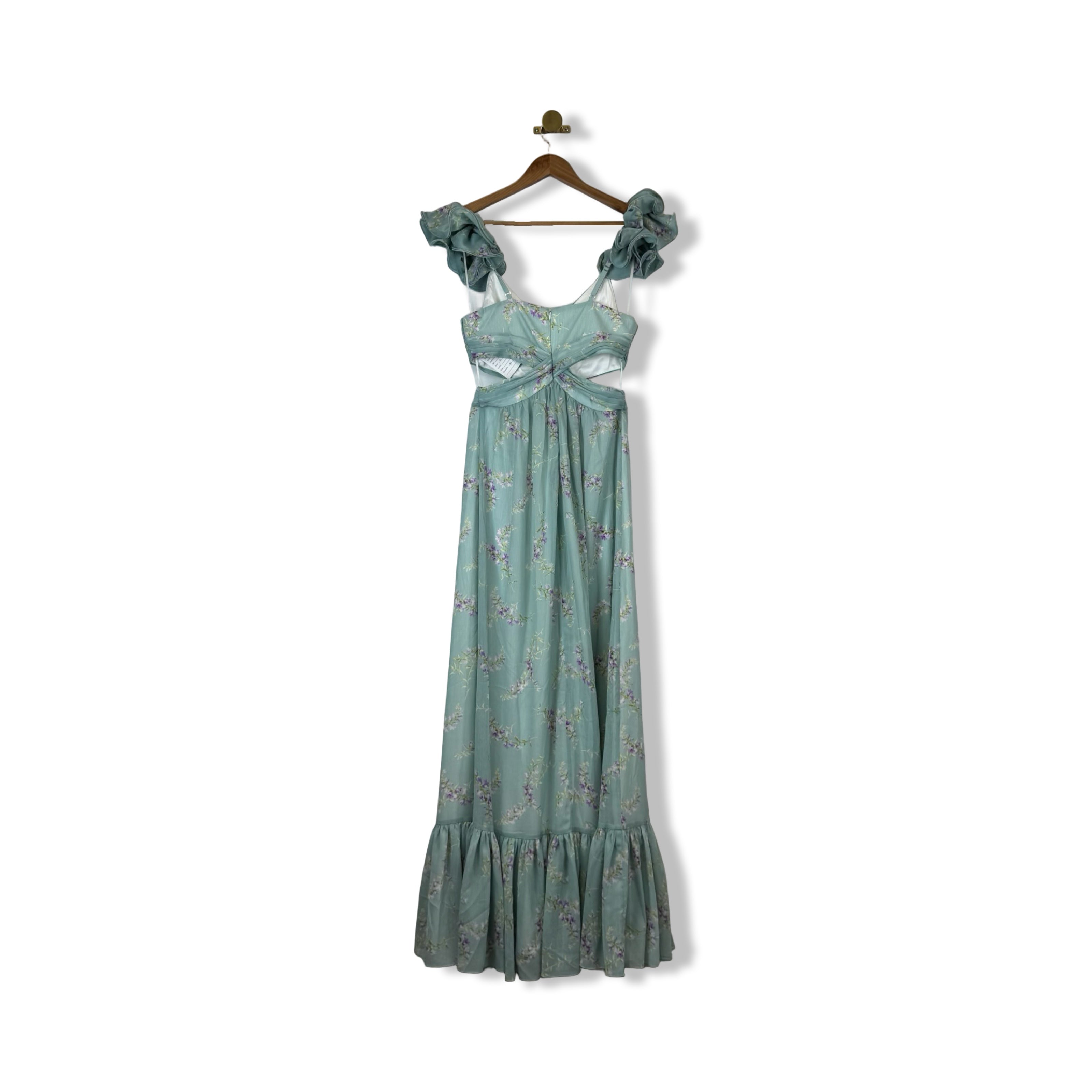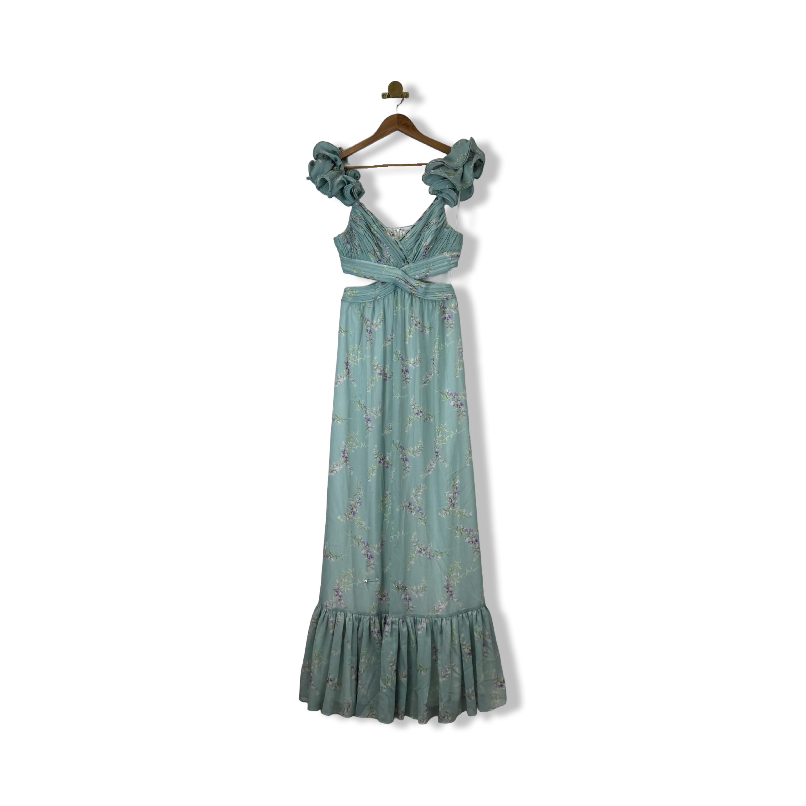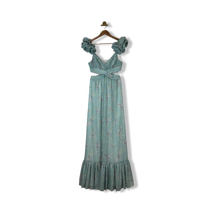 - This chiffon gown features a crisscross bodice and adjustable straps adorned with floral appliques, creating a textured and elegant look.