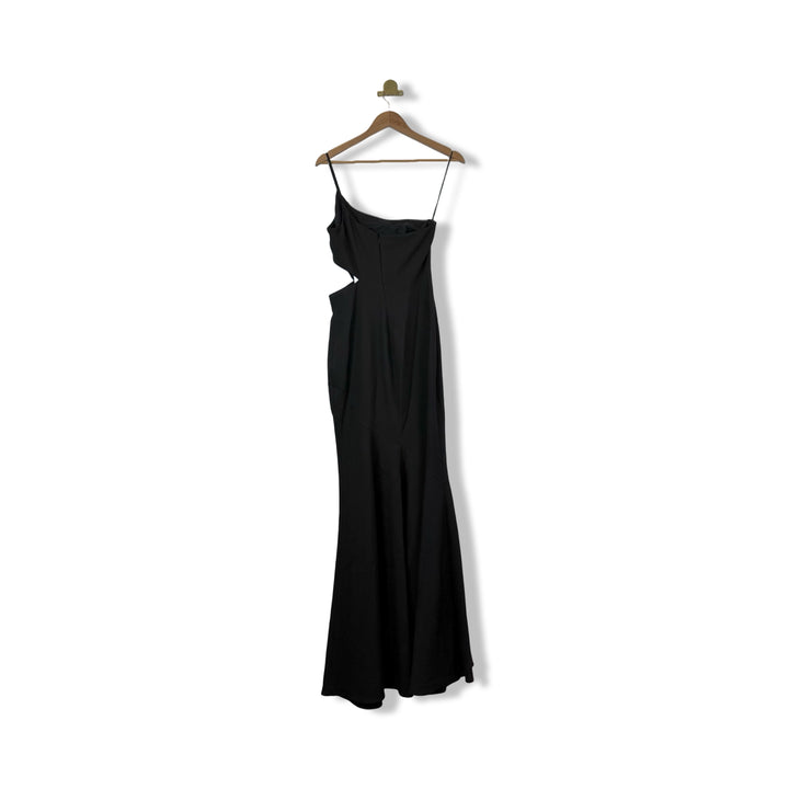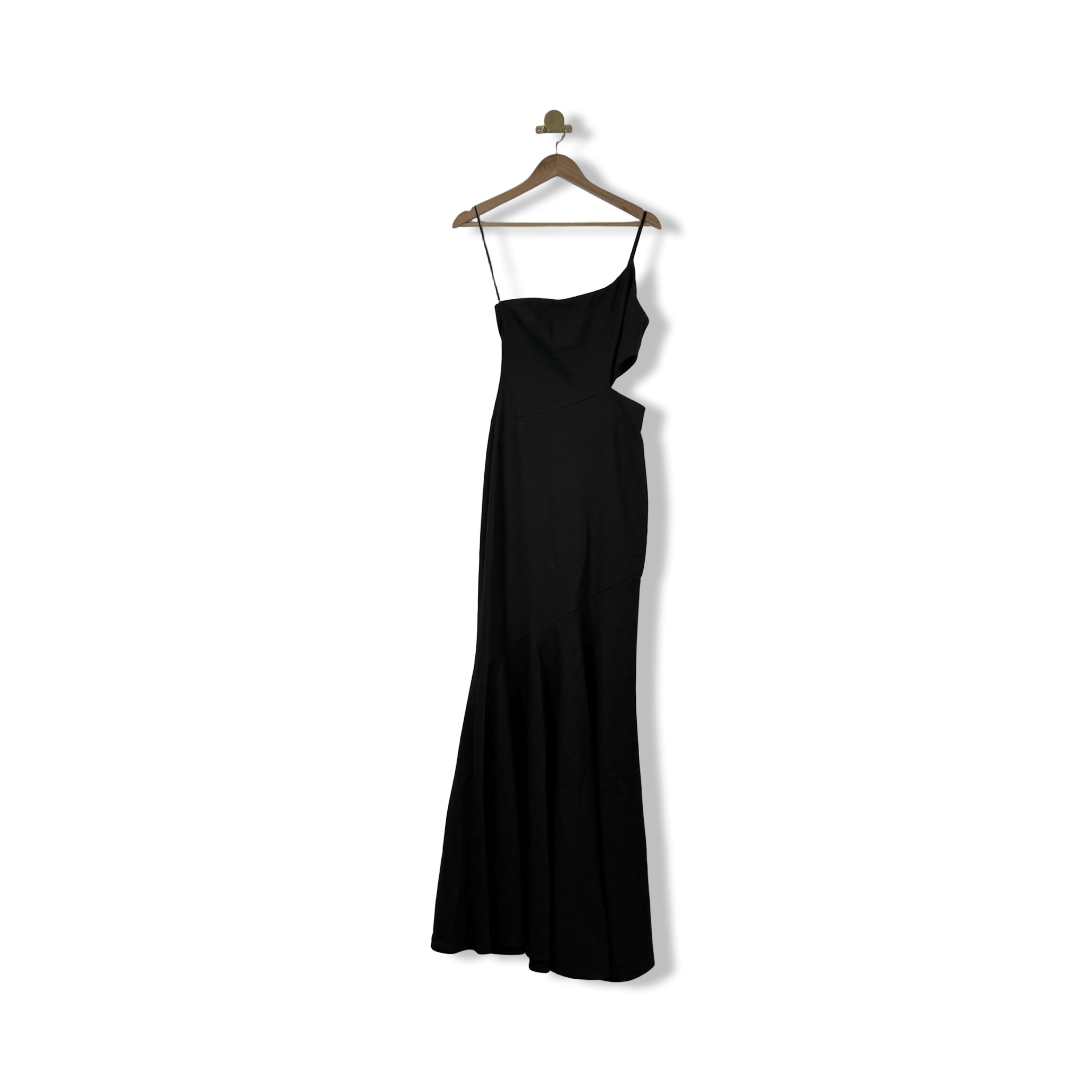 - A gown with an asymmetrical shoulder and a cutout bodice.