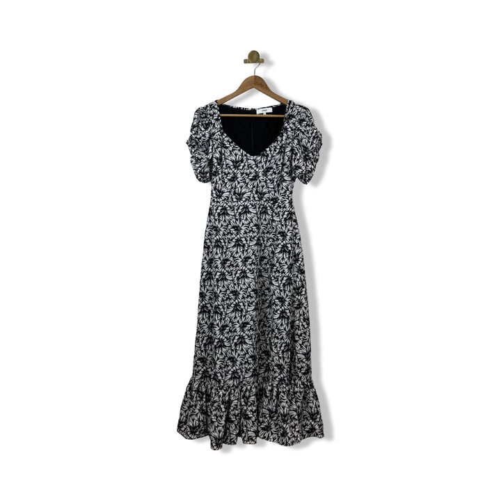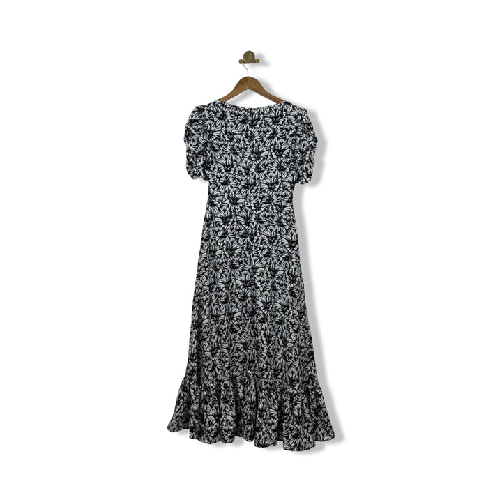 - The product features a floral pattern, puff sleeves, a button front detail, and a side slit.