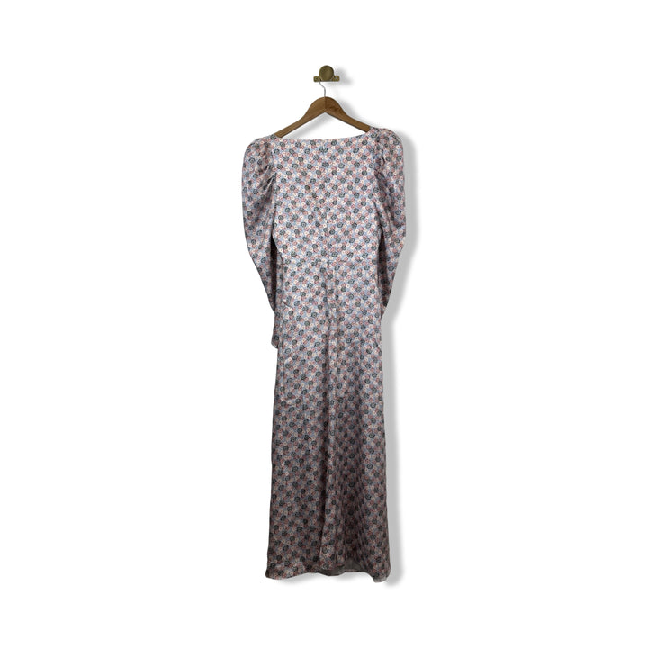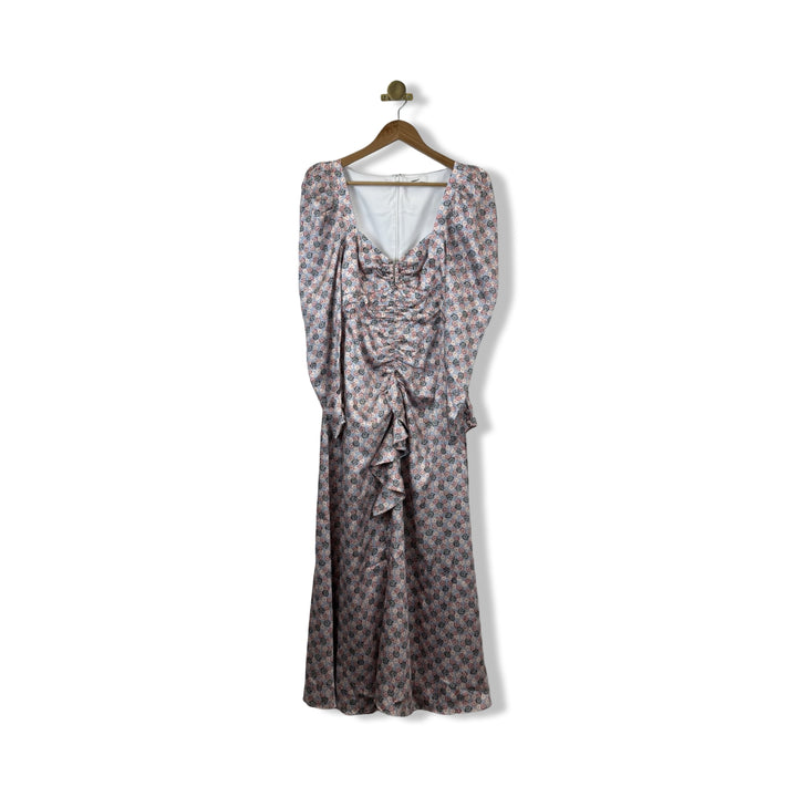 - This dress features puff sleeves, hardware detailing at the bust, a ruched seam at the bodice, and a ruffled front slit for added detail.