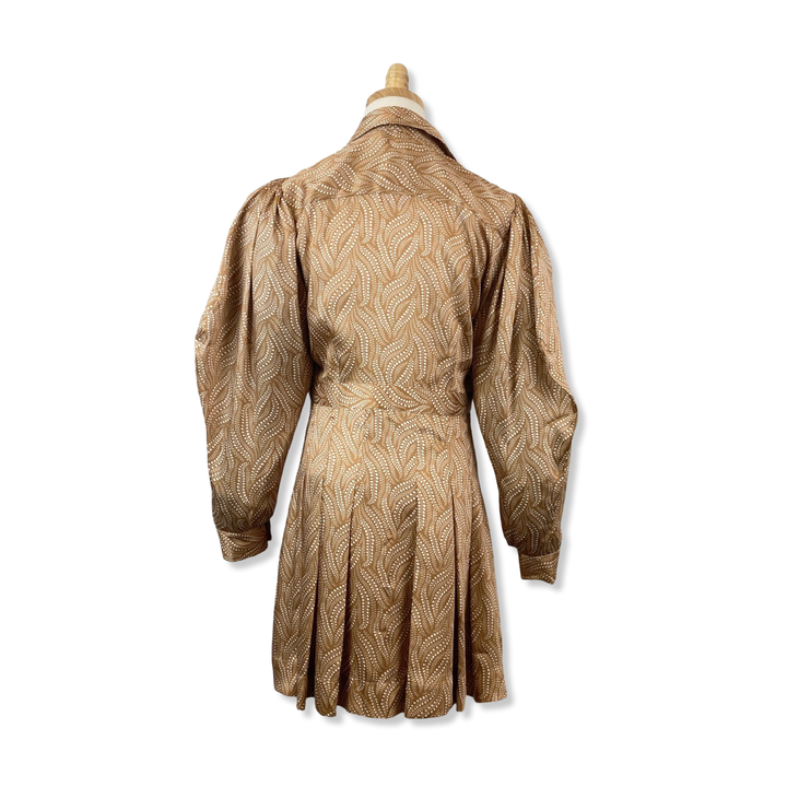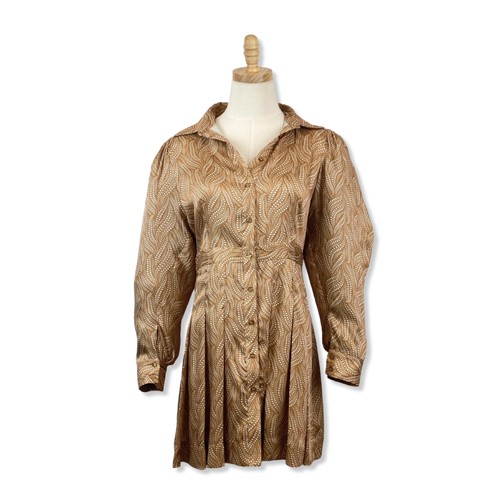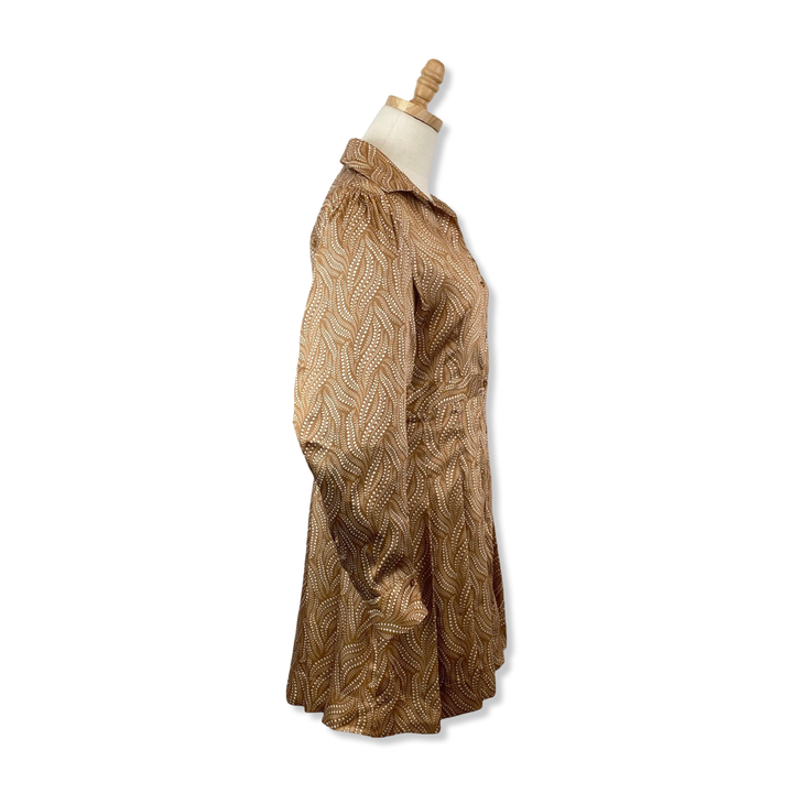- Patterned button down dress. Size label missing, looks like a Small. Please check measurements for accurate sizing.