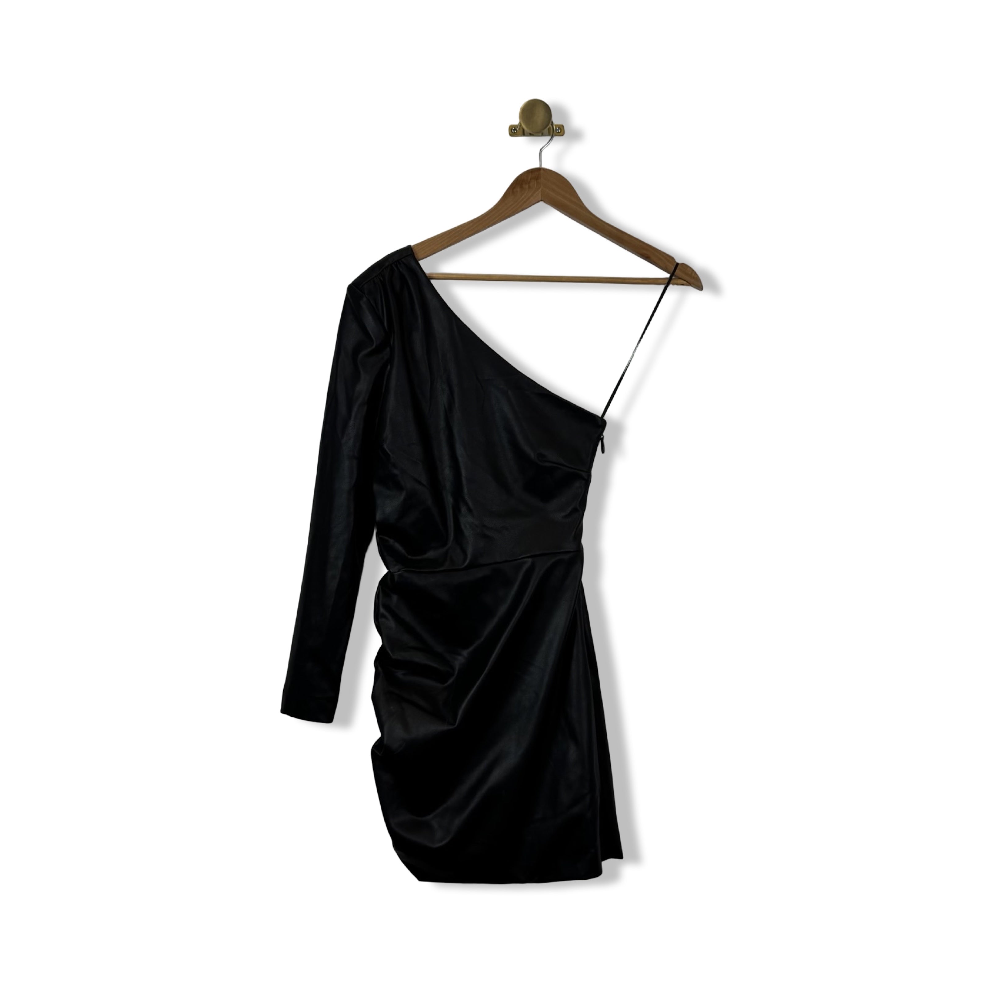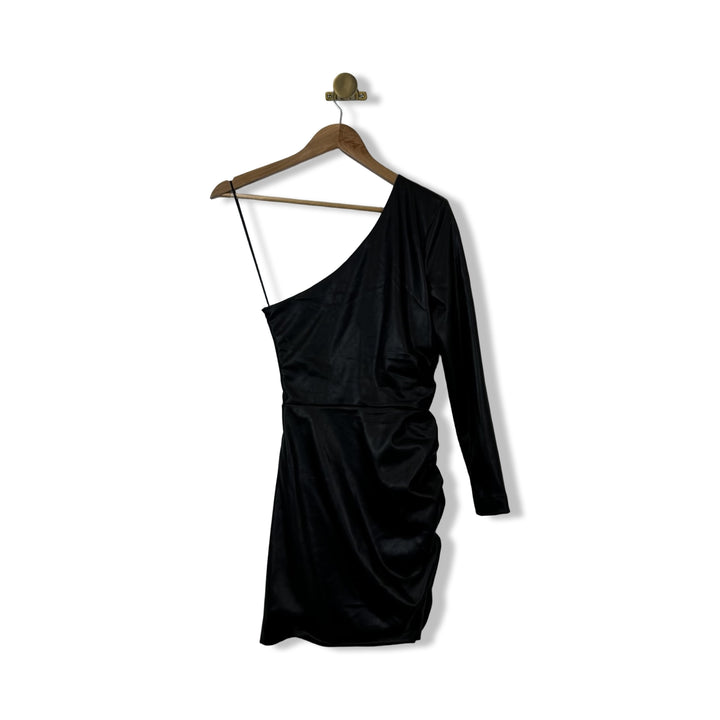 - This mini dress features ruched side seams and asymmetrical sleeves.