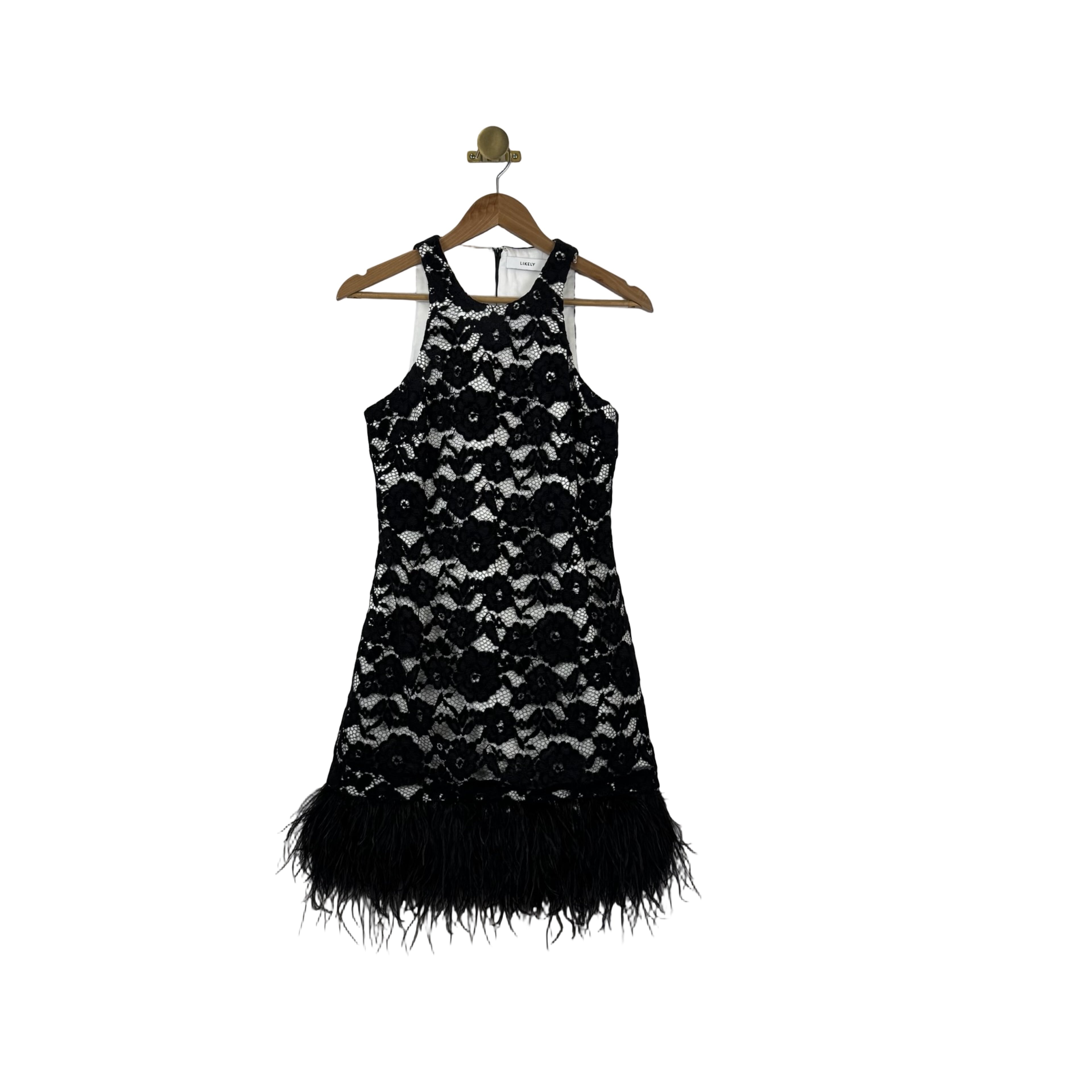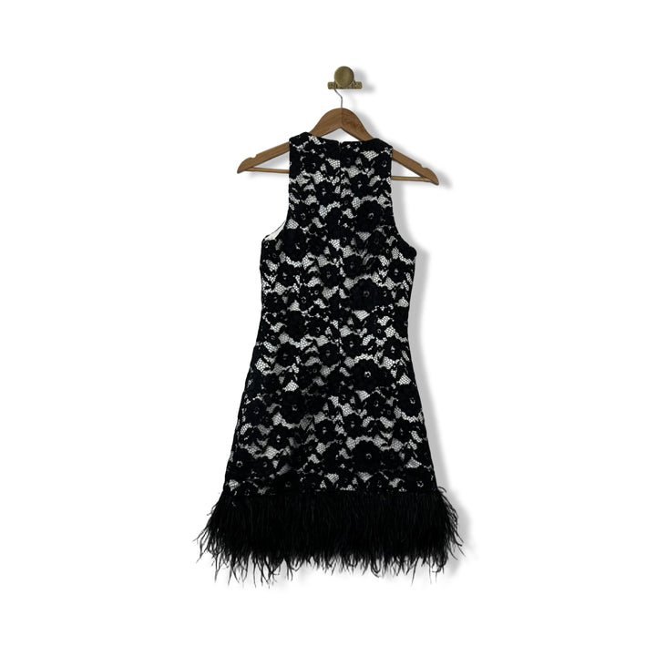 - This Aline mini dress features floral velvet applique lace and a feathered hem.