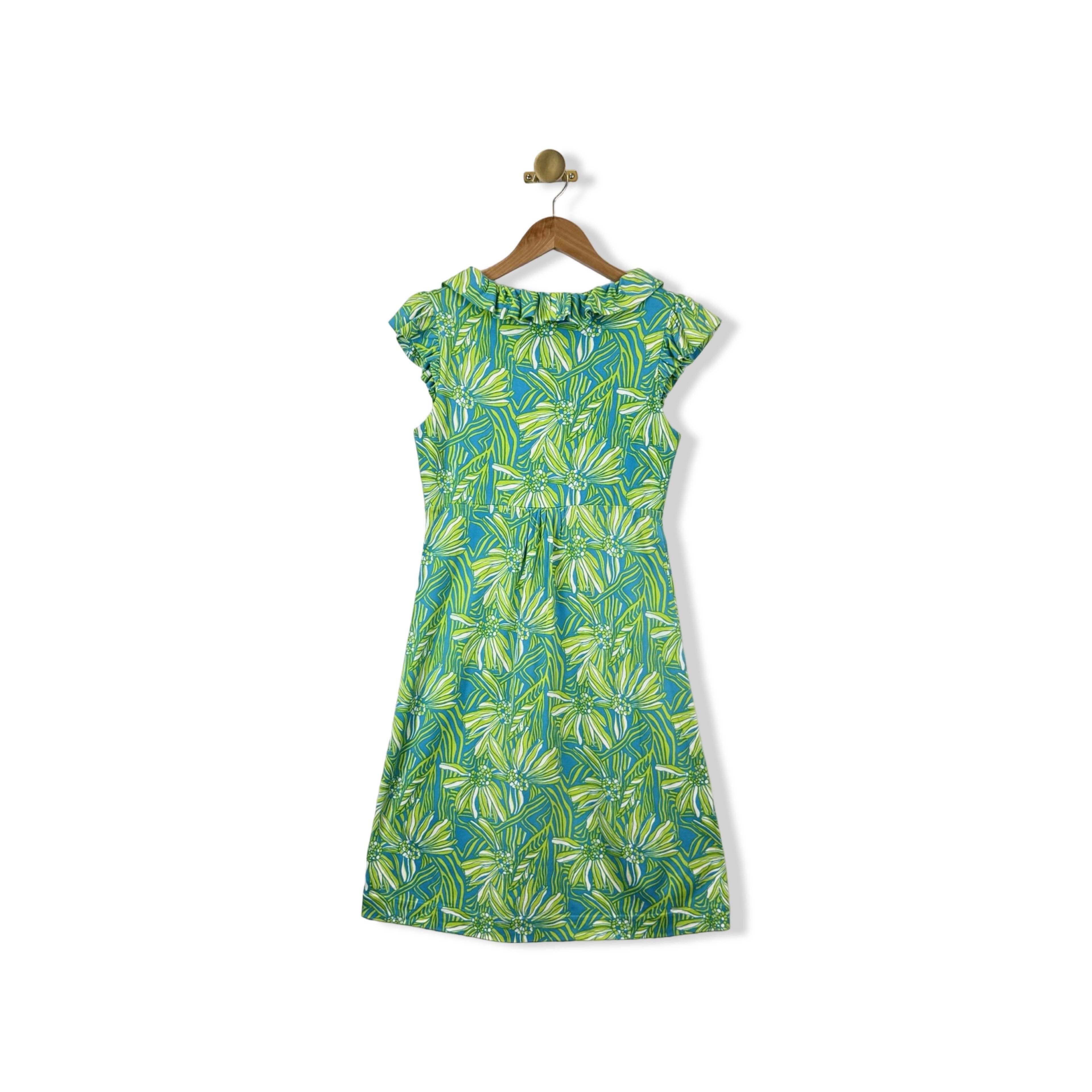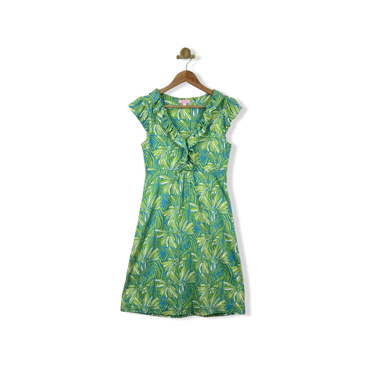 - This stunning dress boasts a front and sleeves adorned with beautiful ruffles, adding a touch of femininity to the beautiful floral design.