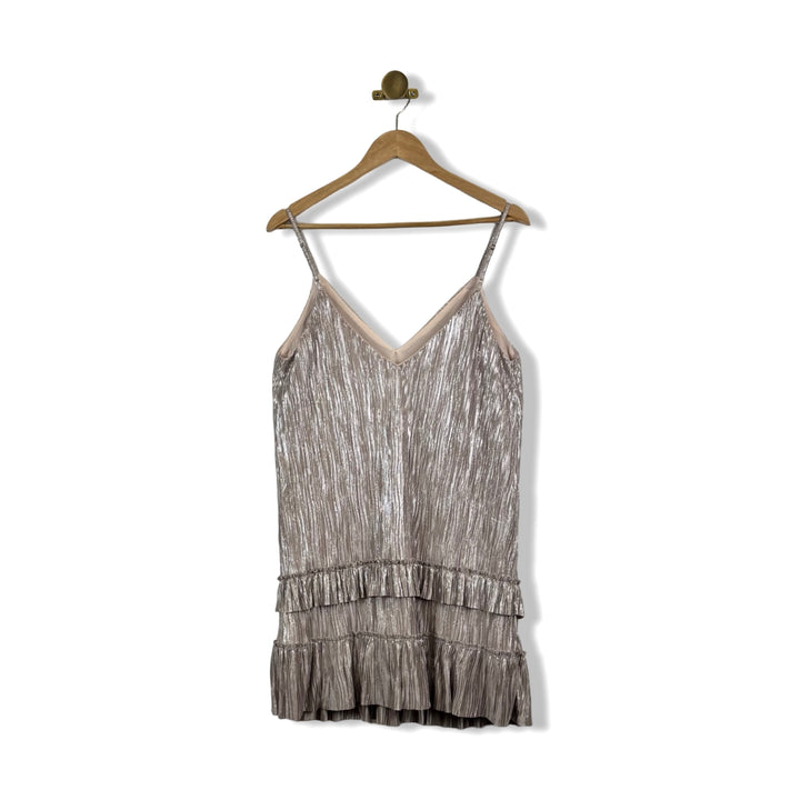 - Sleeveless metallic dress with ruffle hem and adjustable straps