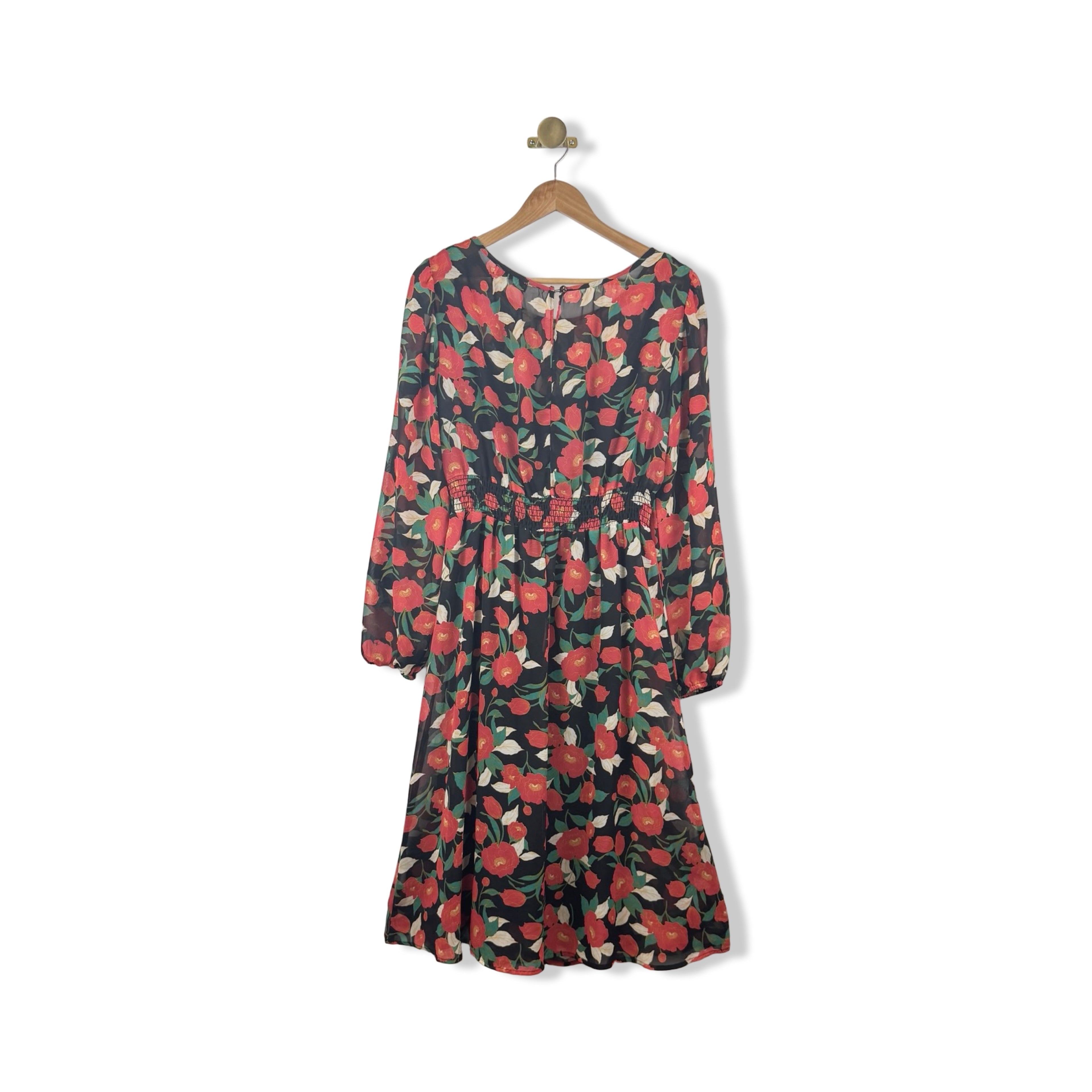 - This stunning dress boasts a sheer overlay adorned with bold, intricate floral patterns. Beneath lies a slip layer for added coverage and comfort.