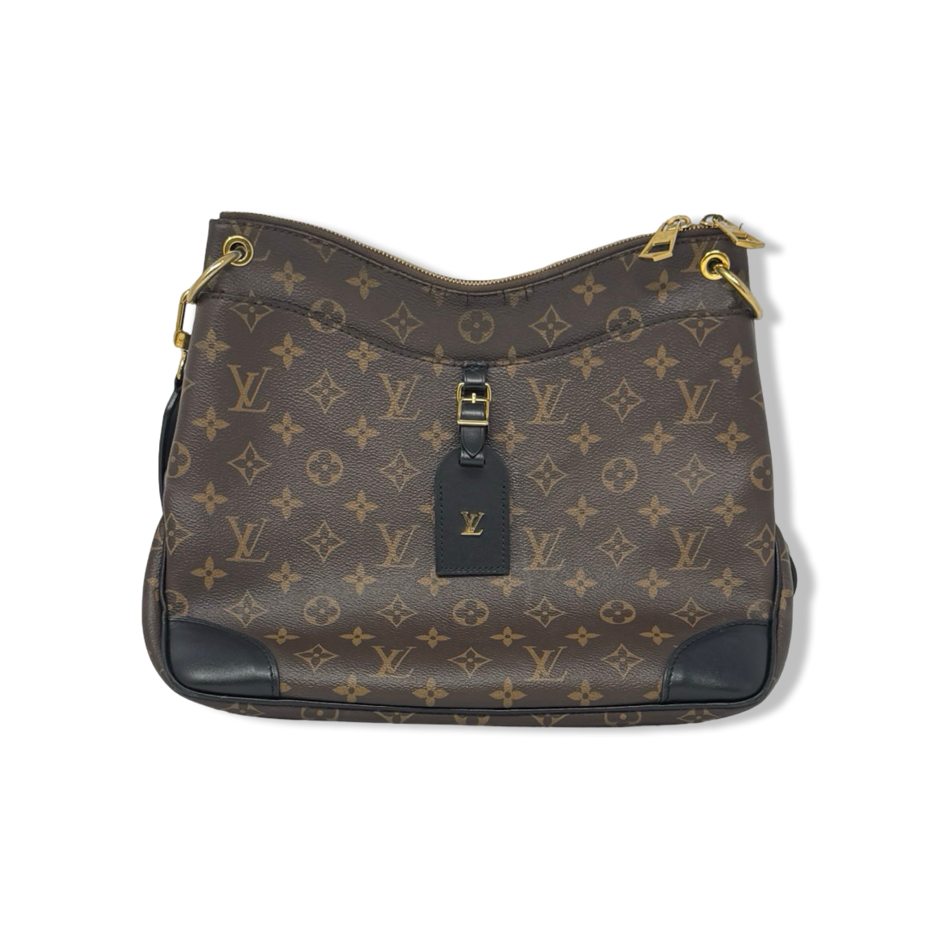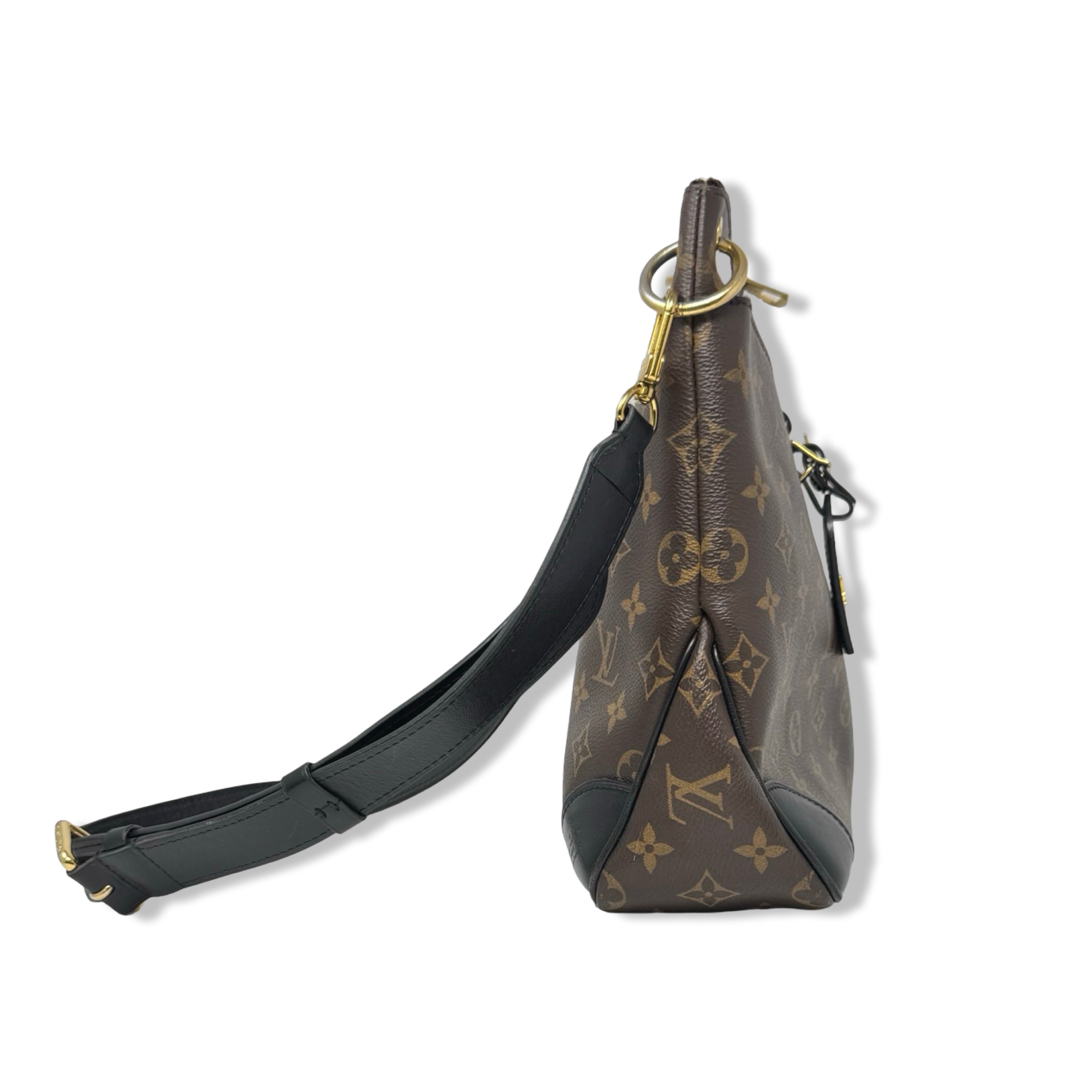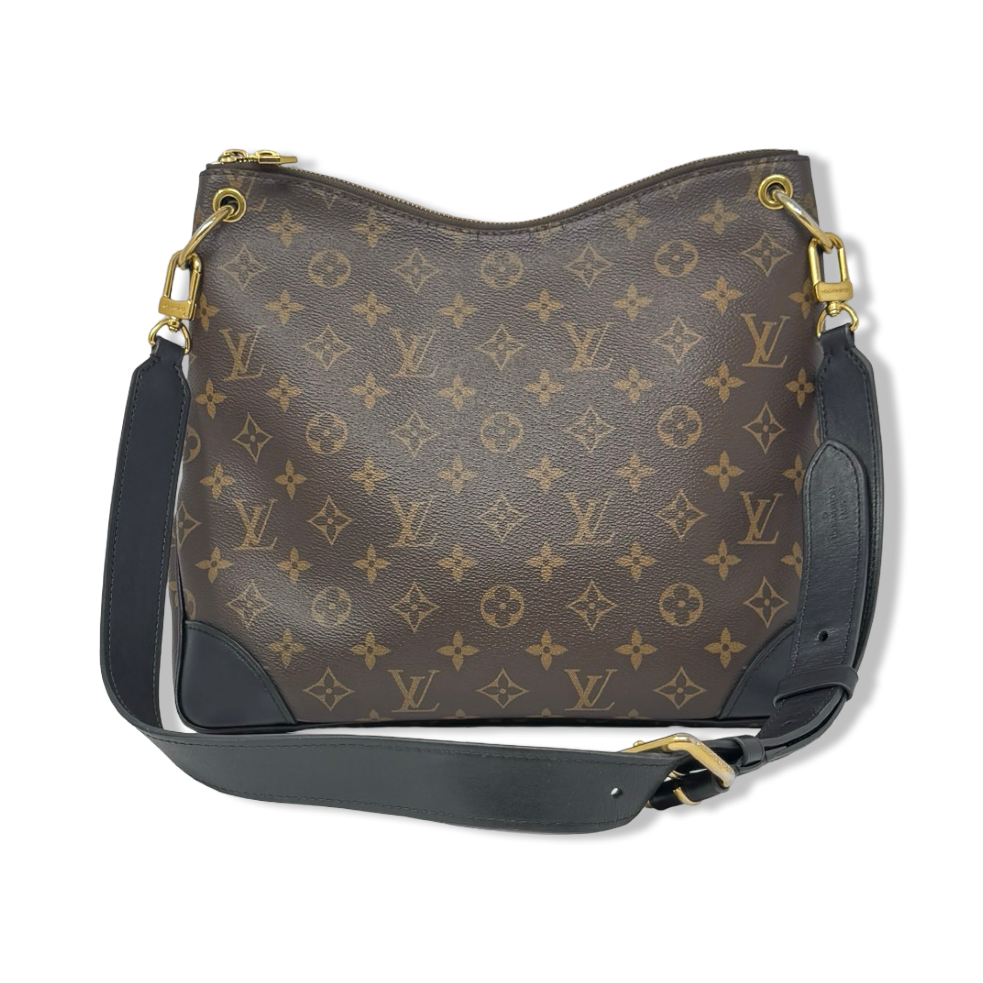 - This is an authentic LOUIS VUITTON Monogram Odeon MM in Black. This stylish messenger bag is crafted of signature Louis Vuitton monogram coated canvas with black leather trim. The bag features an adjustable shoulder strap with gold tone hardware and a flat front pocket for extra storage. The top zipper opens to a black fabric interior with a patch pocket. Designer dust bag included. Some wear throughout (Pictured)