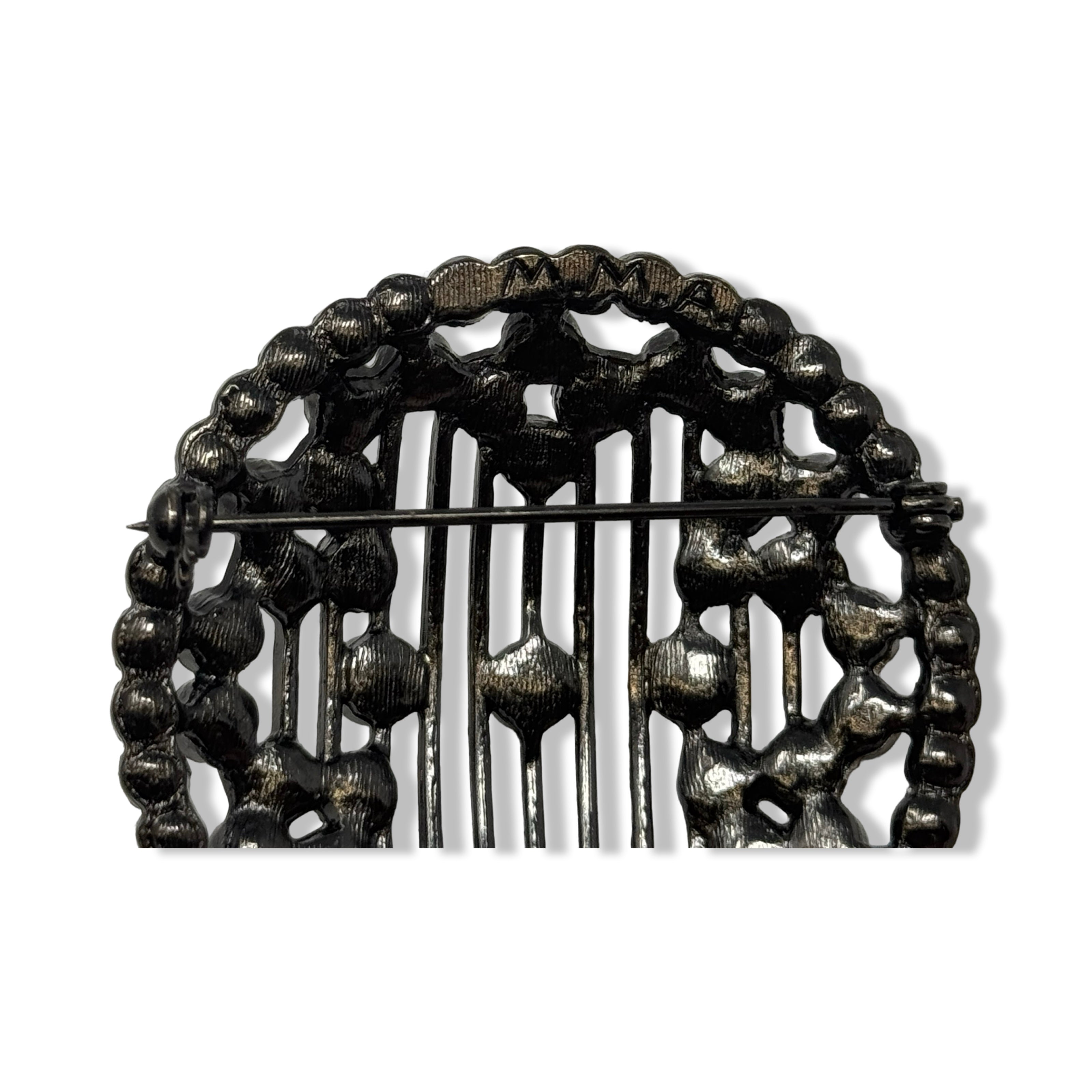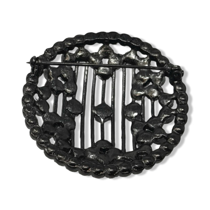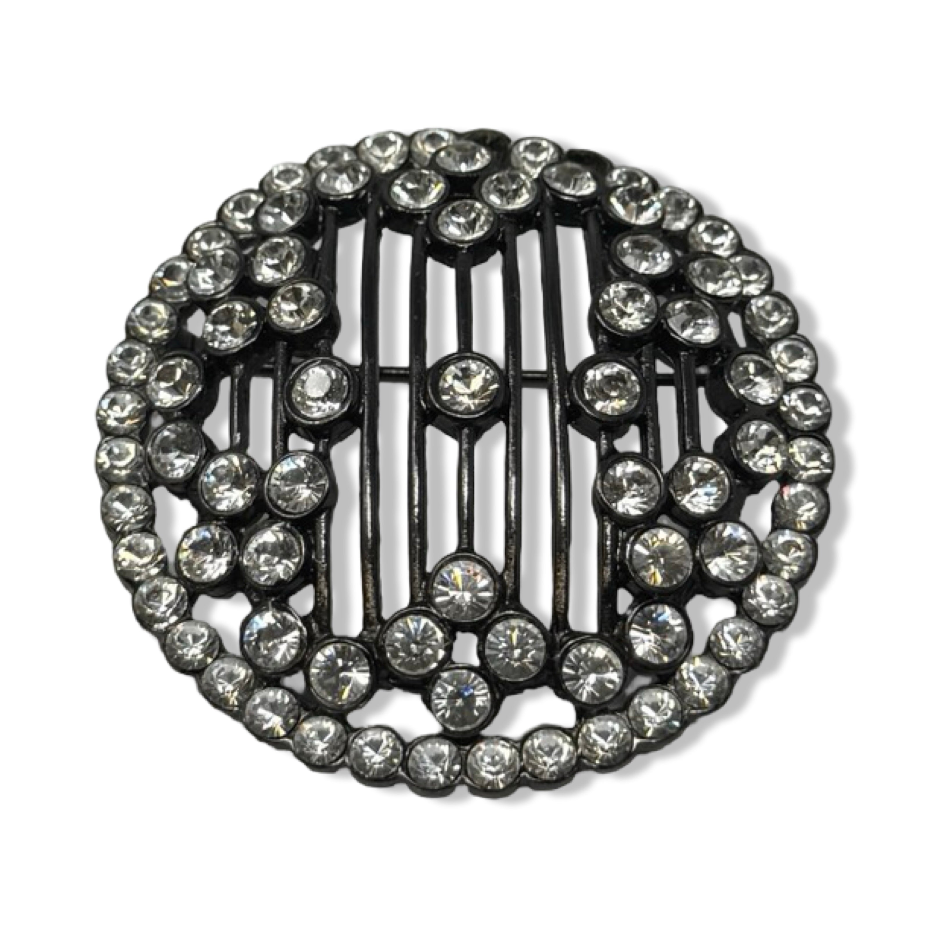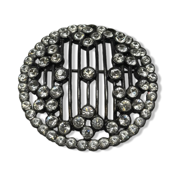 - Round brooch with rhinestone detail throughout and closure on back. Missing rhinestones.