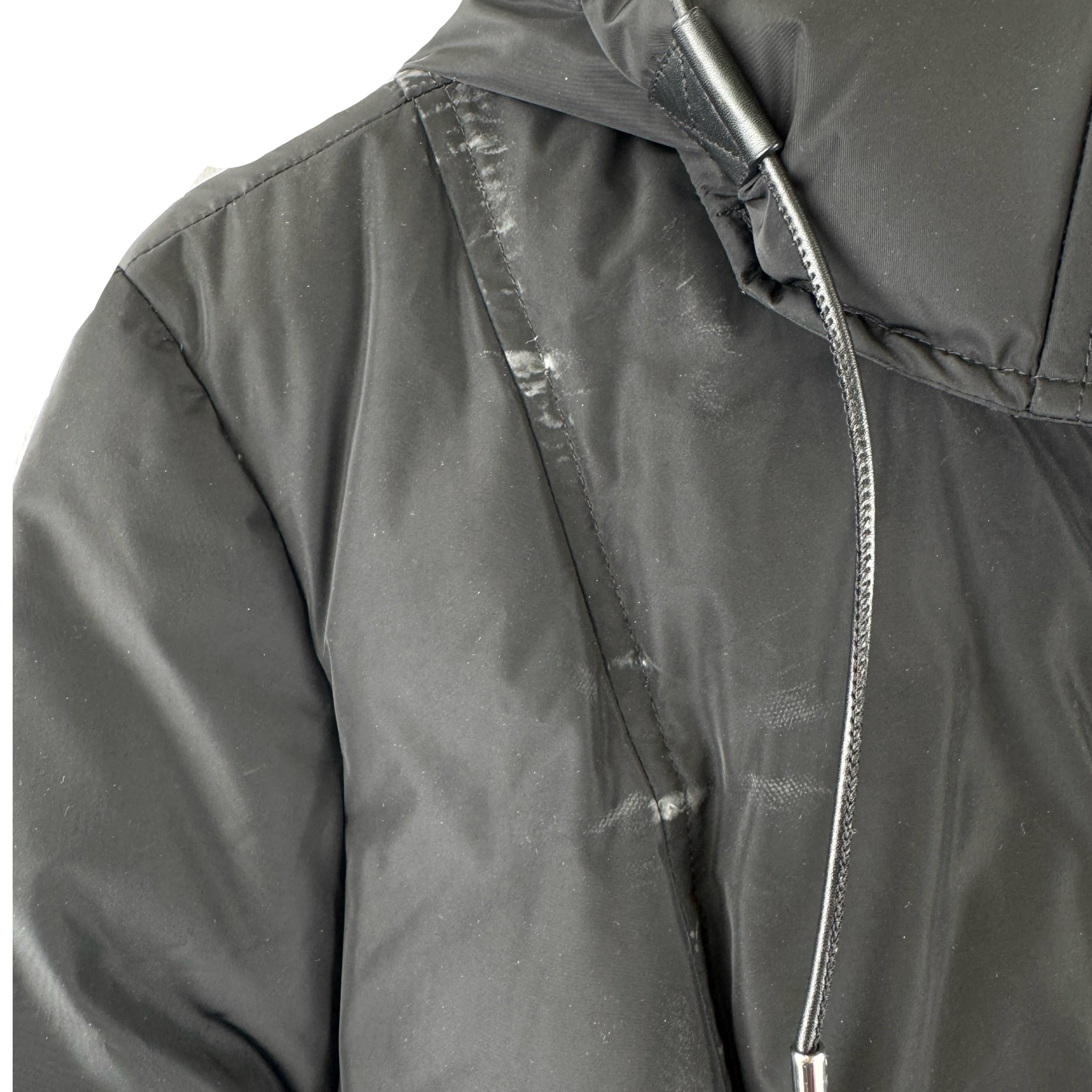 - Hooded coat with dual front pockets and snap button zip closure. Signs of wear, pictured