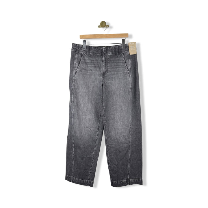 - Wide leg jeans with dual front pockets, faux back pockets, and hook and bar zip fly