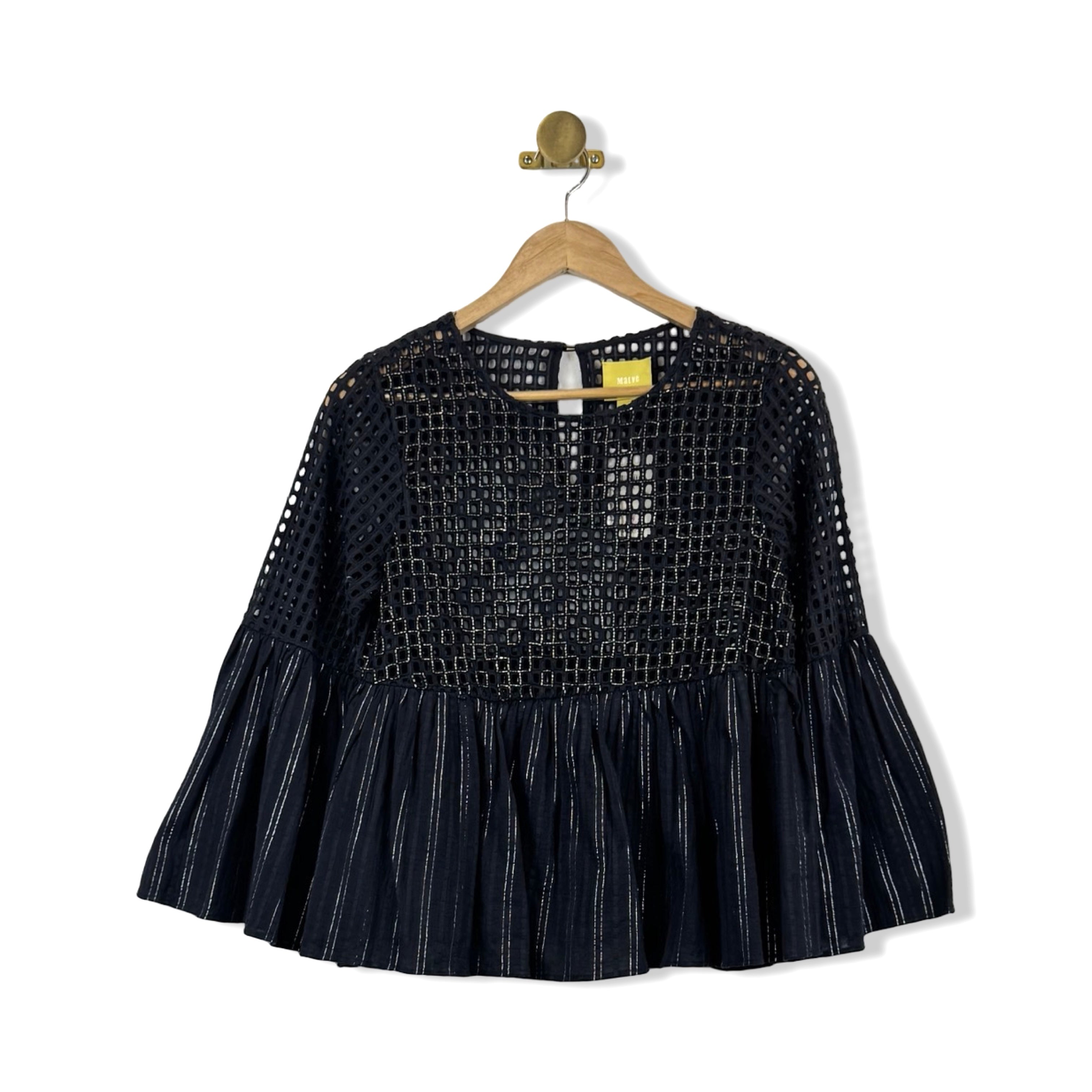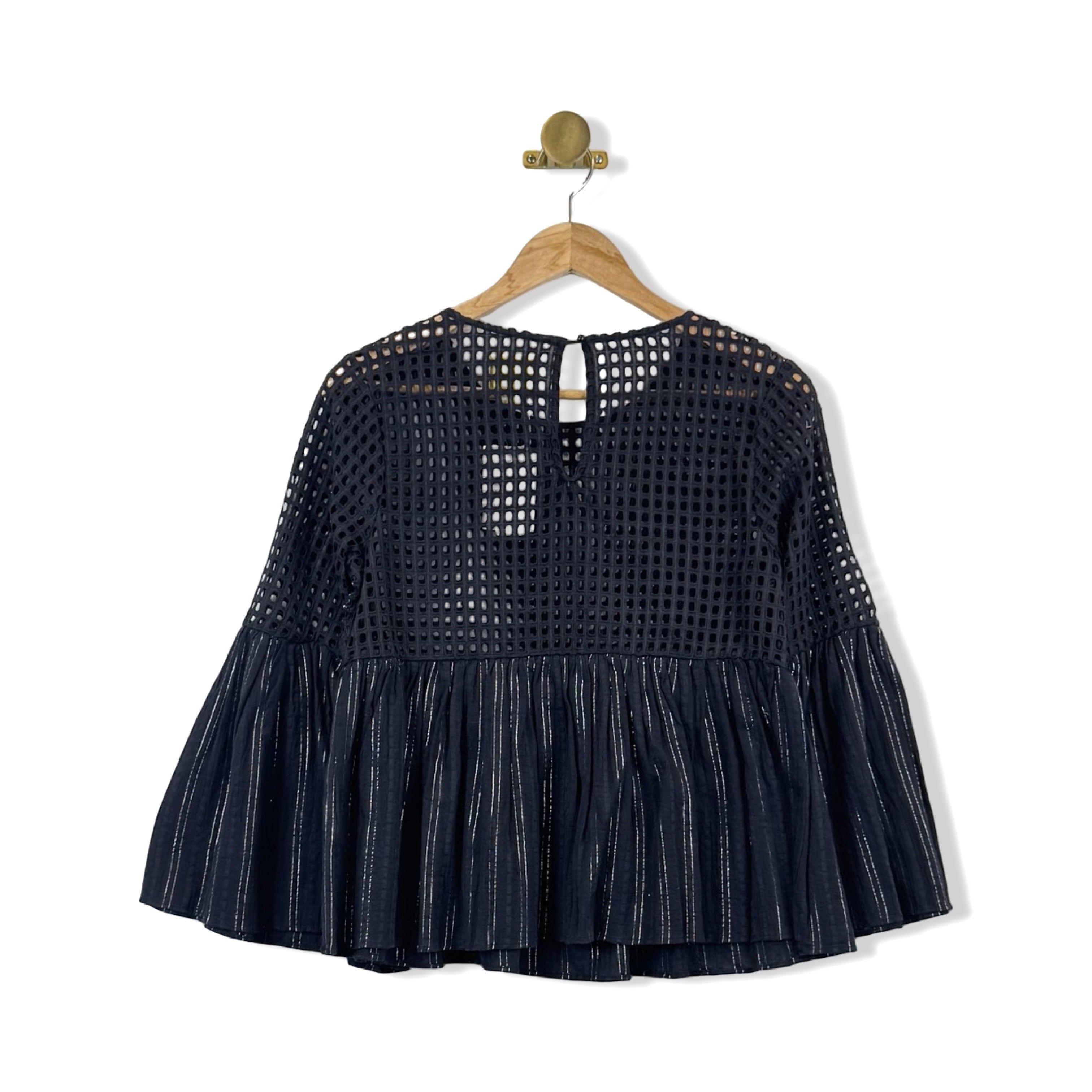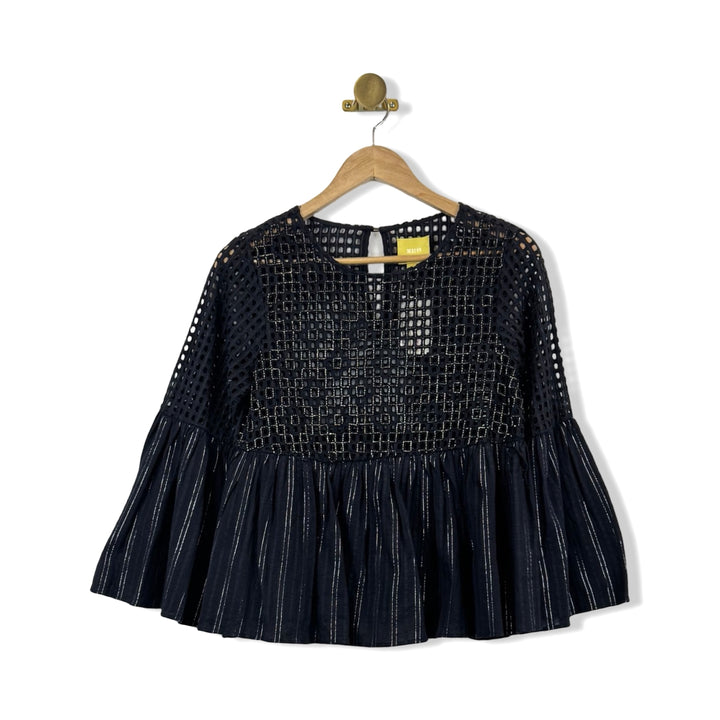 - Long sleeve peplum top with eyelet upper and metallic stripes.