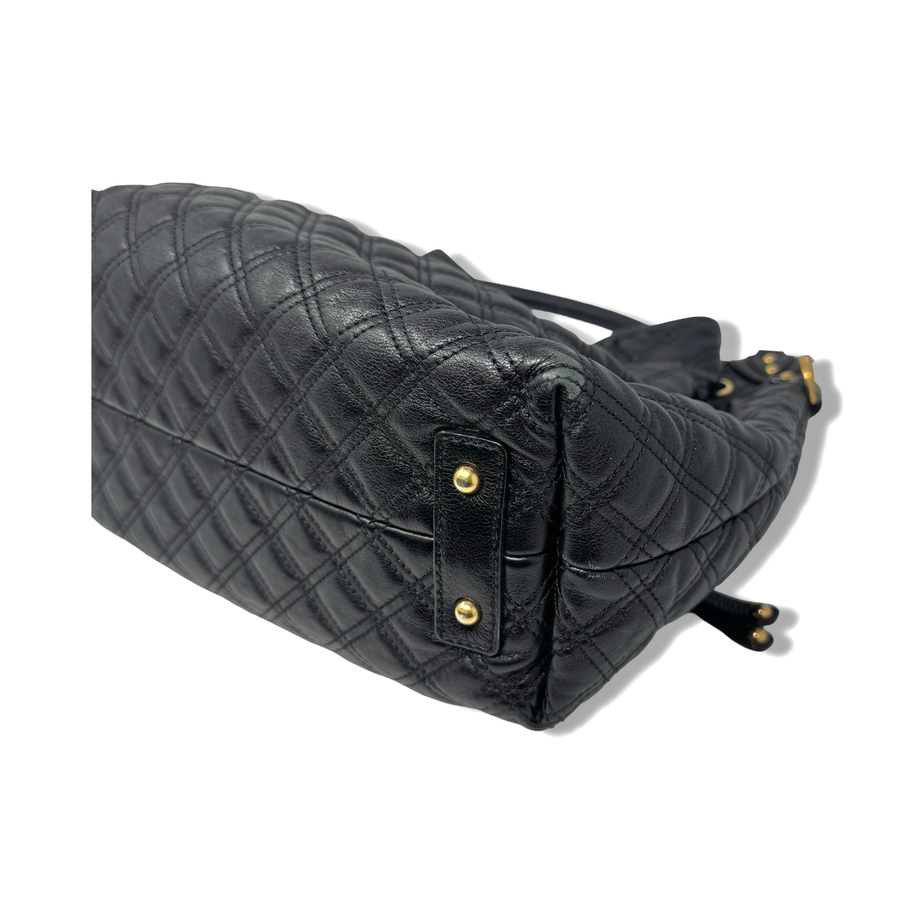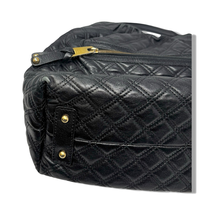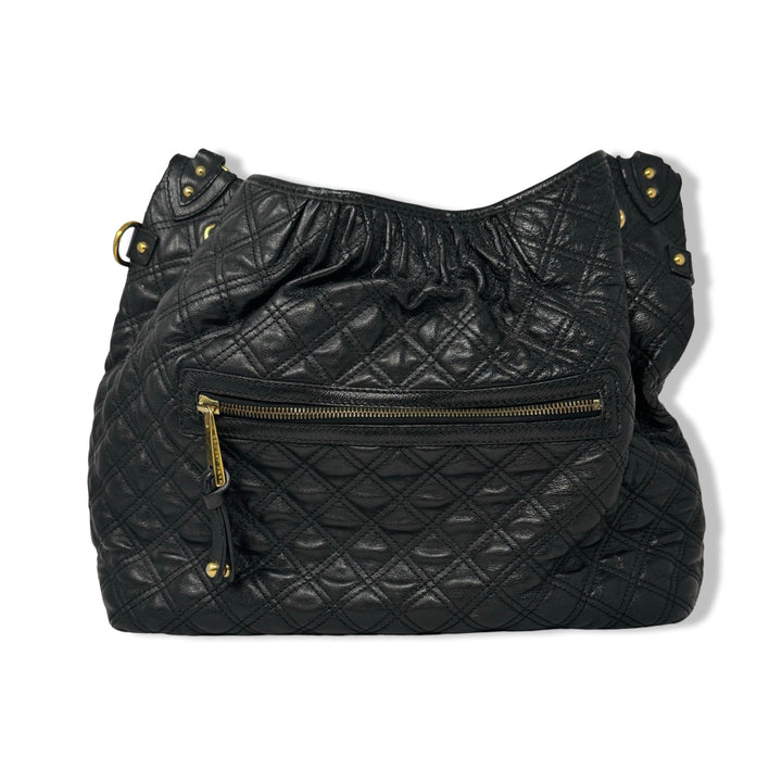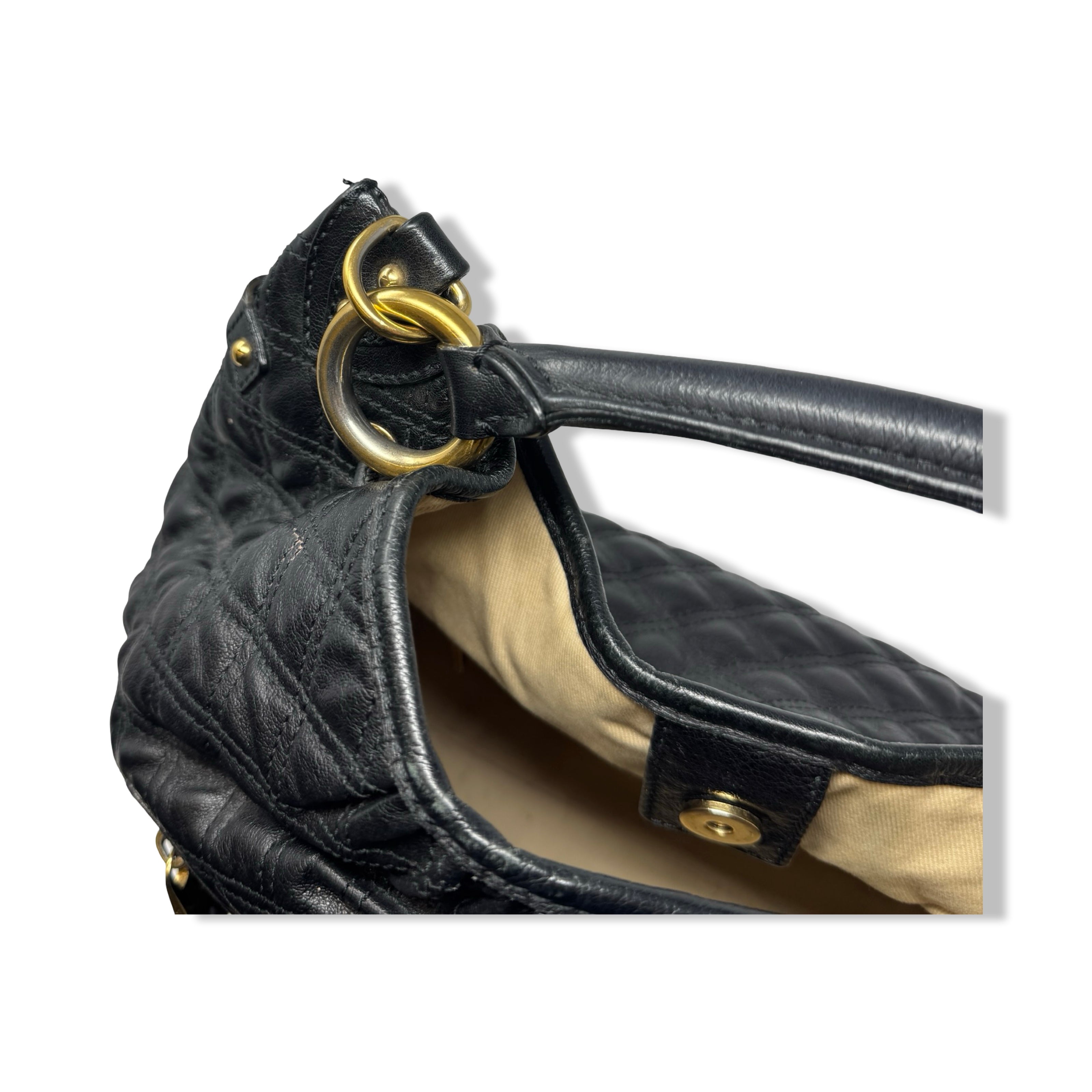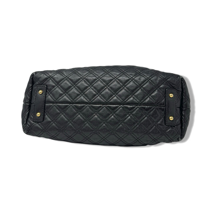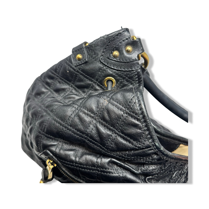 - Quilted leather handbag with gold hardware throughout and front zip closure. Open top with magnetic closure and interior zip closure pocket. Missing gold chain strap. Some signs of wear (pictured).