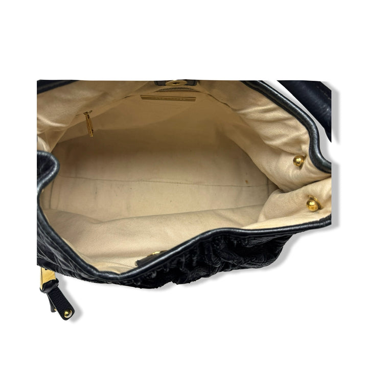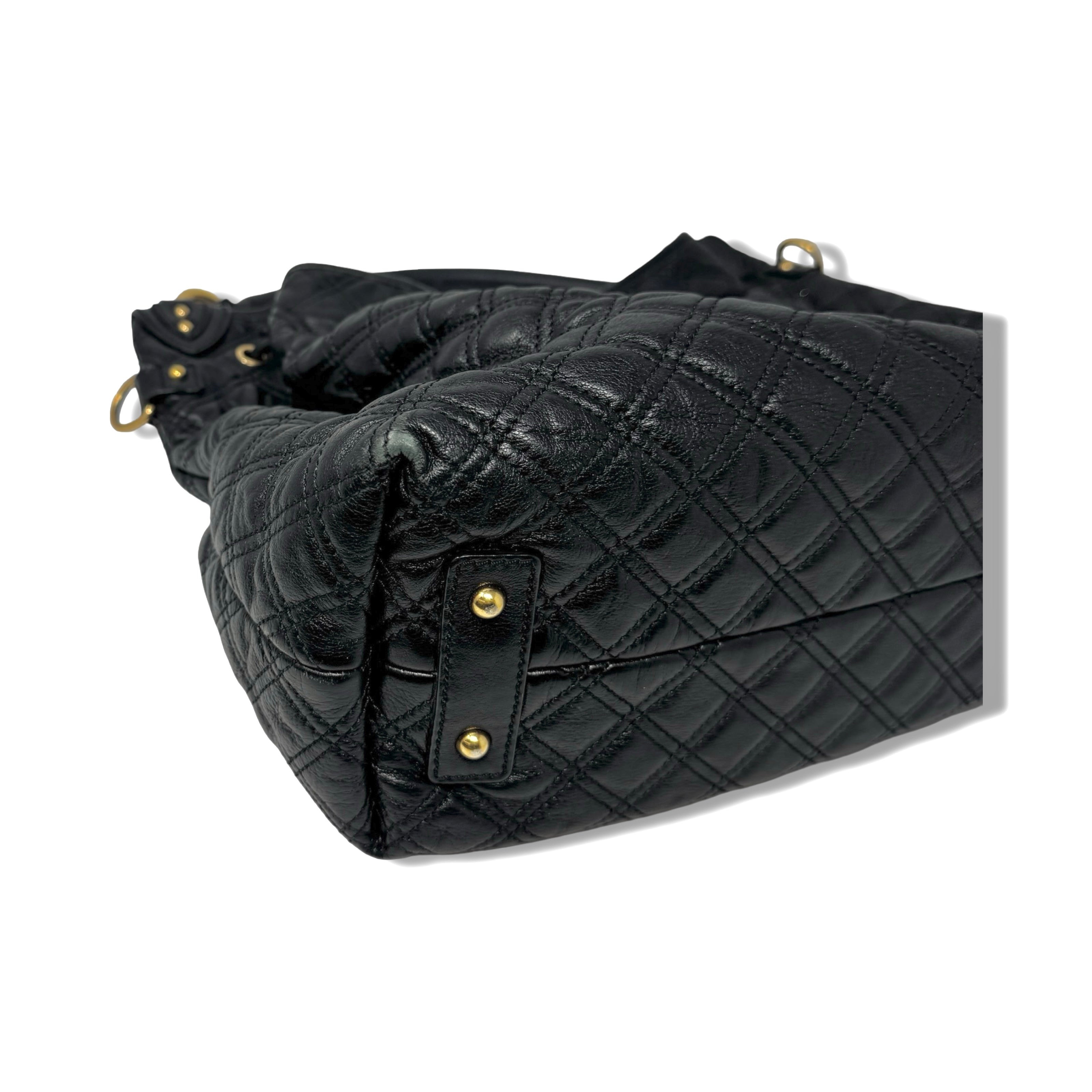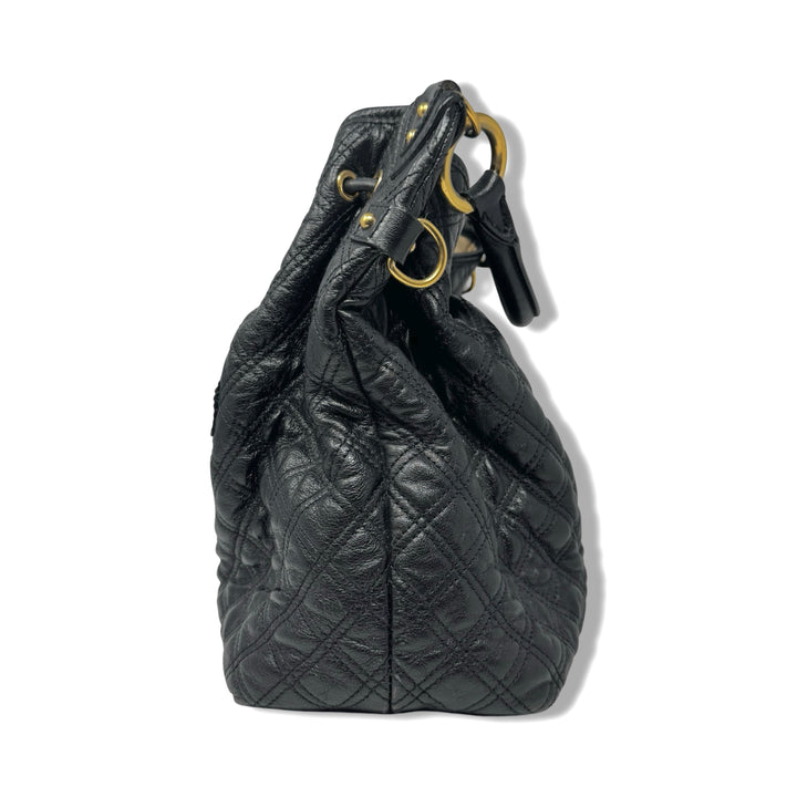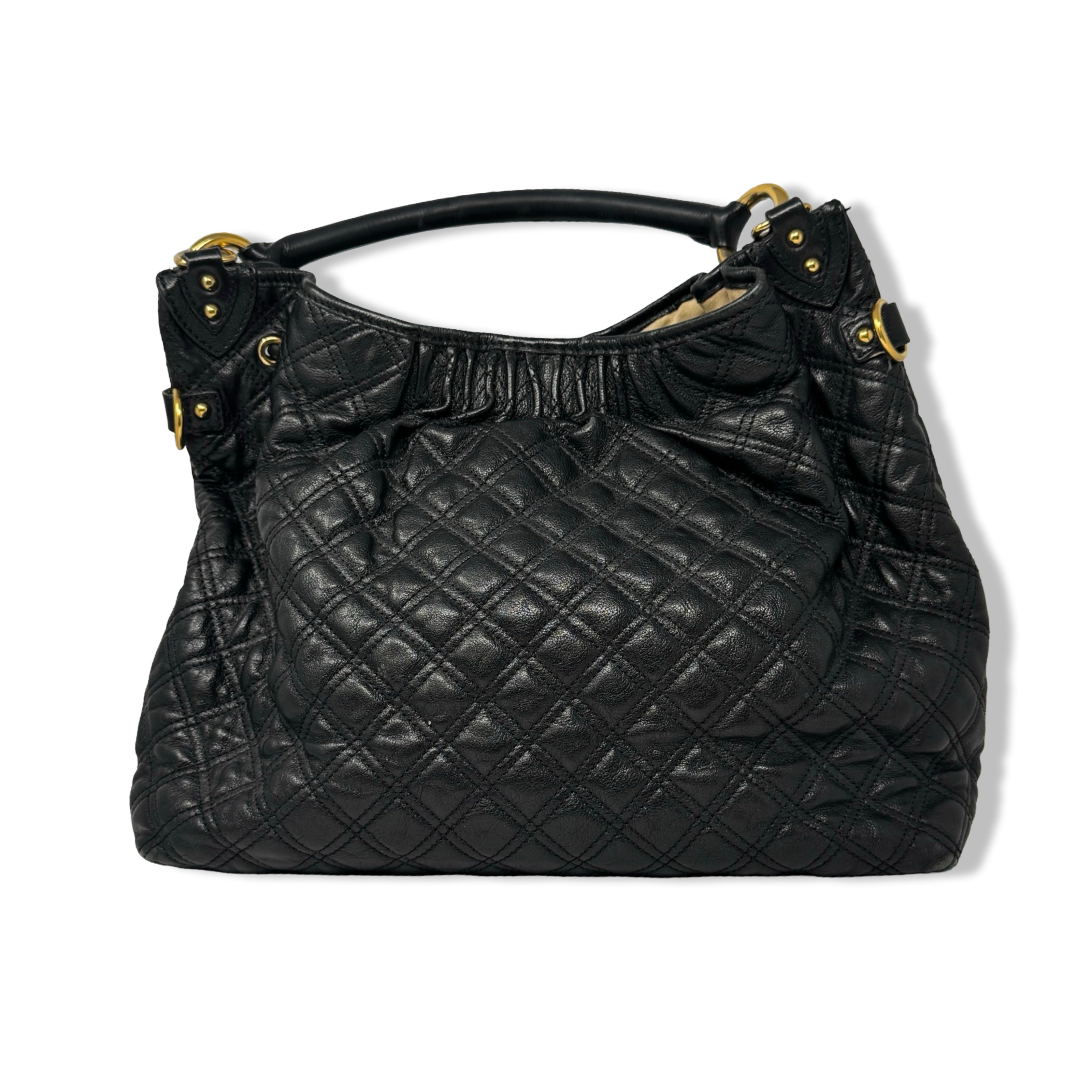 - Quilted leather handbag with gold hardware throughout and front zip closure. Open top with magnetic closure and interior zip closure pocket. Missing gold chain strap. Some signs of wear (pictured).