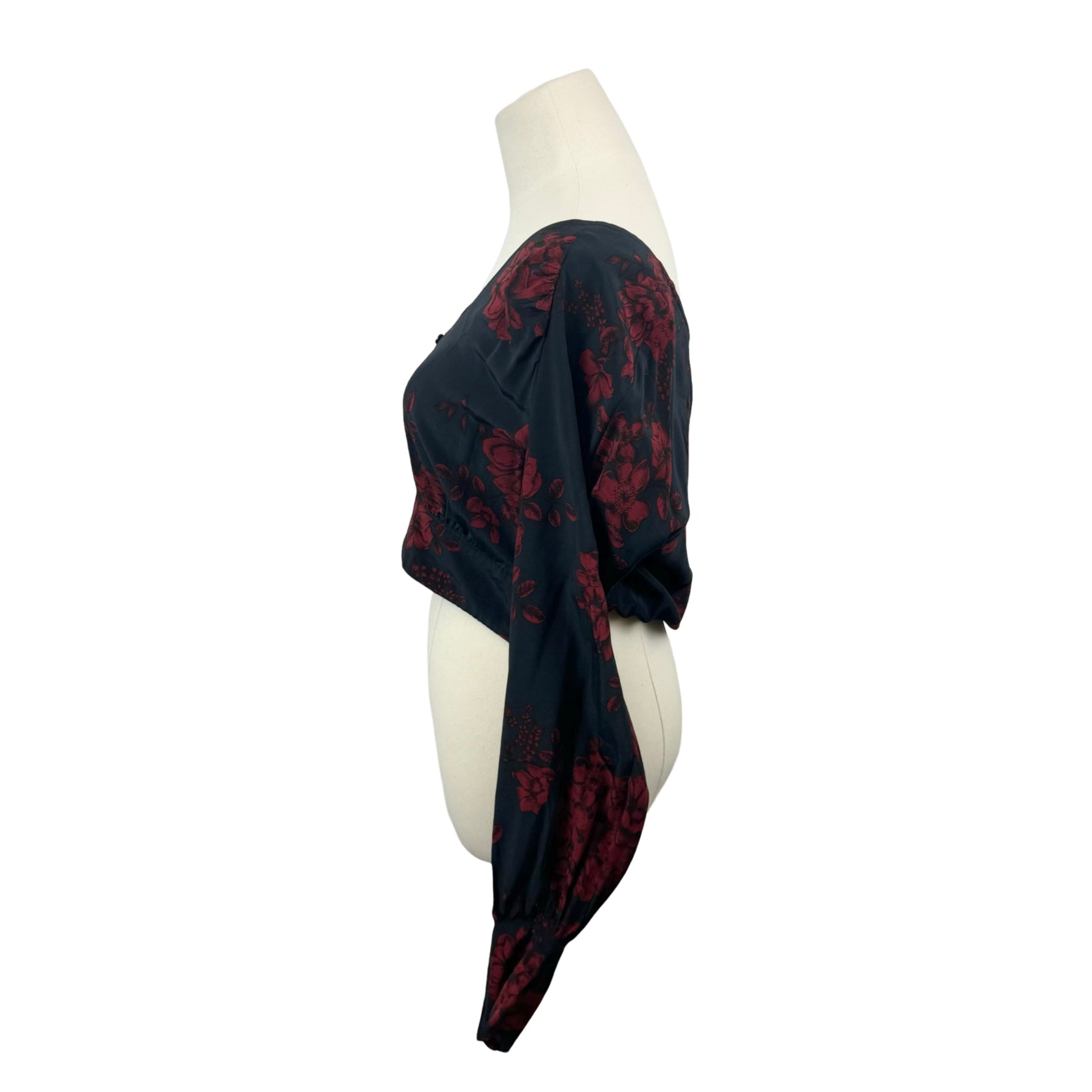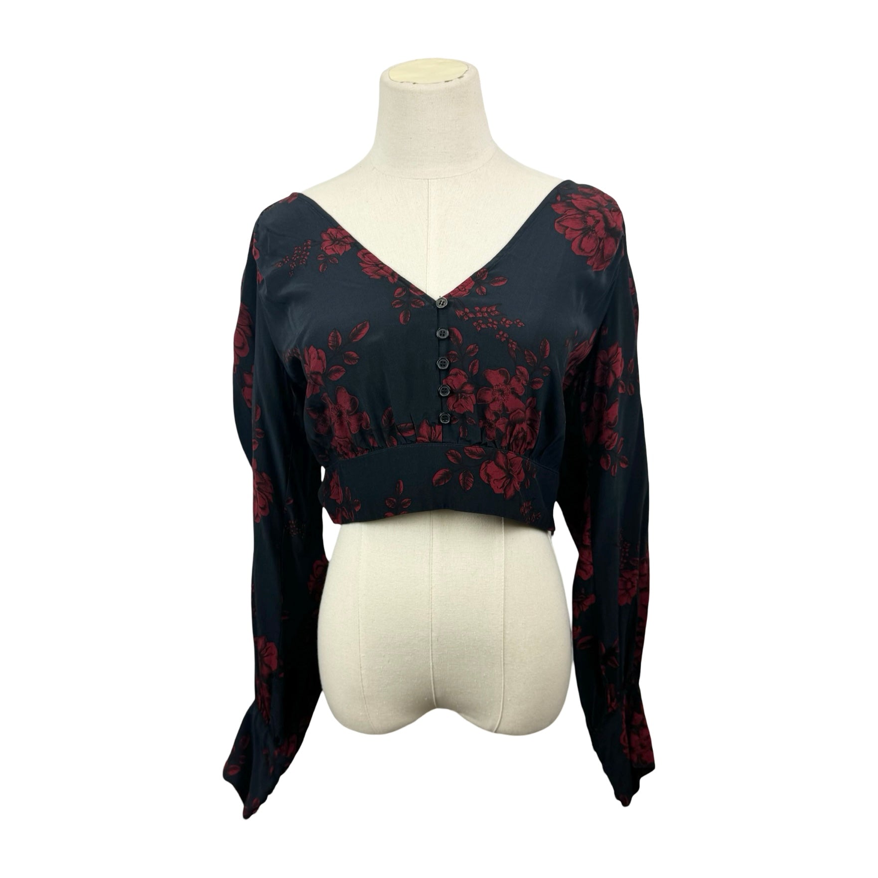 - Cropped long sleeve floral top with button up closure.