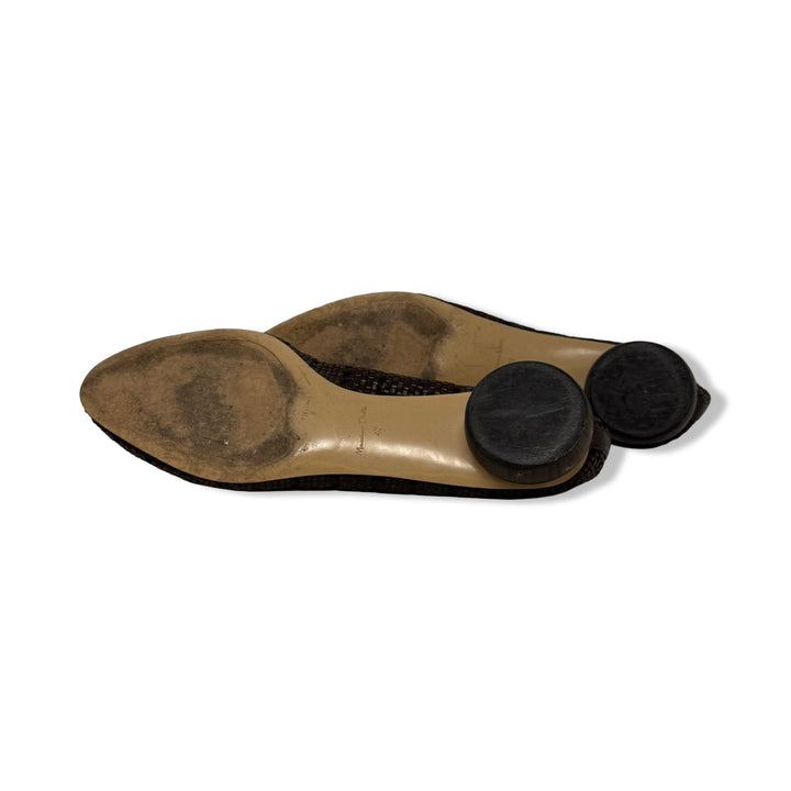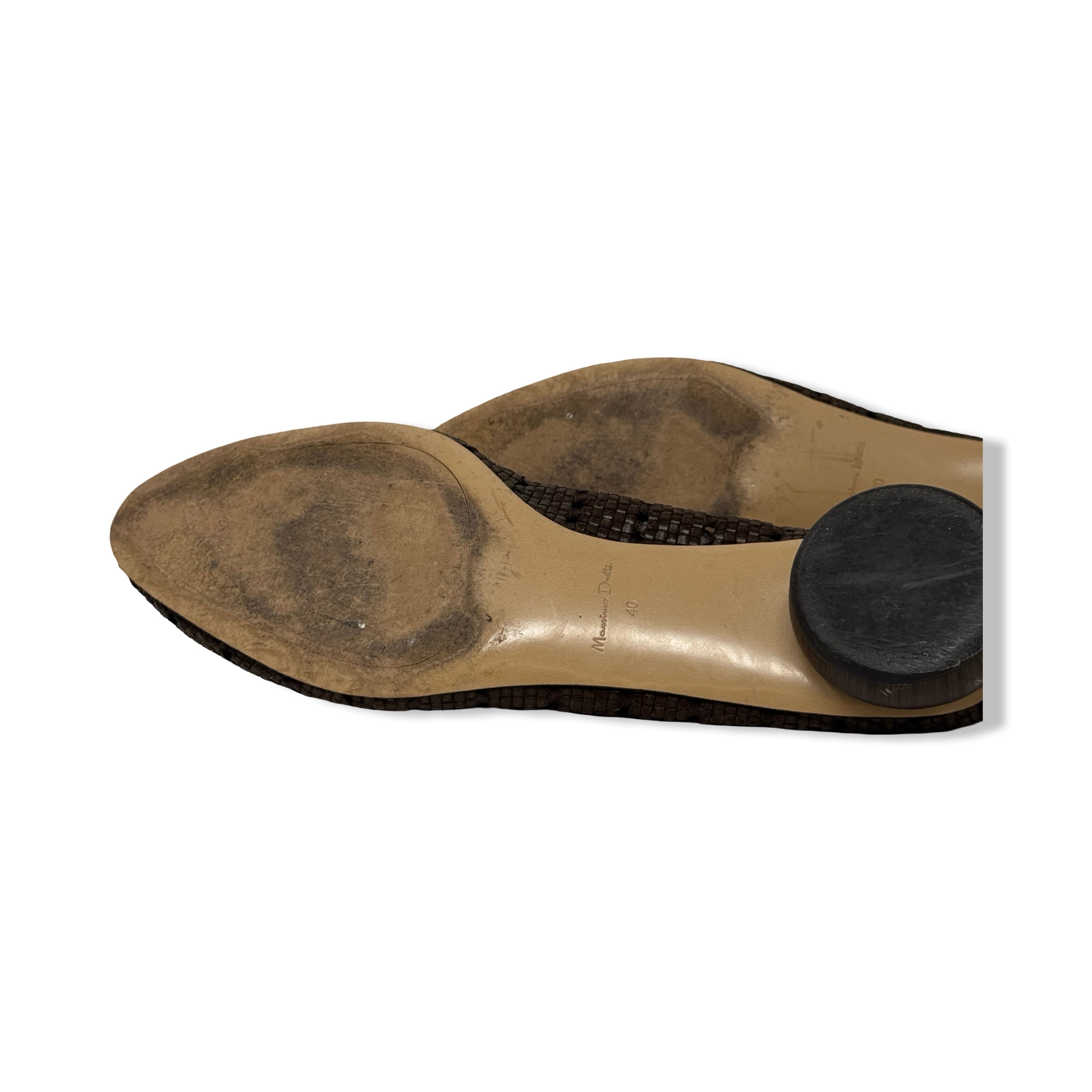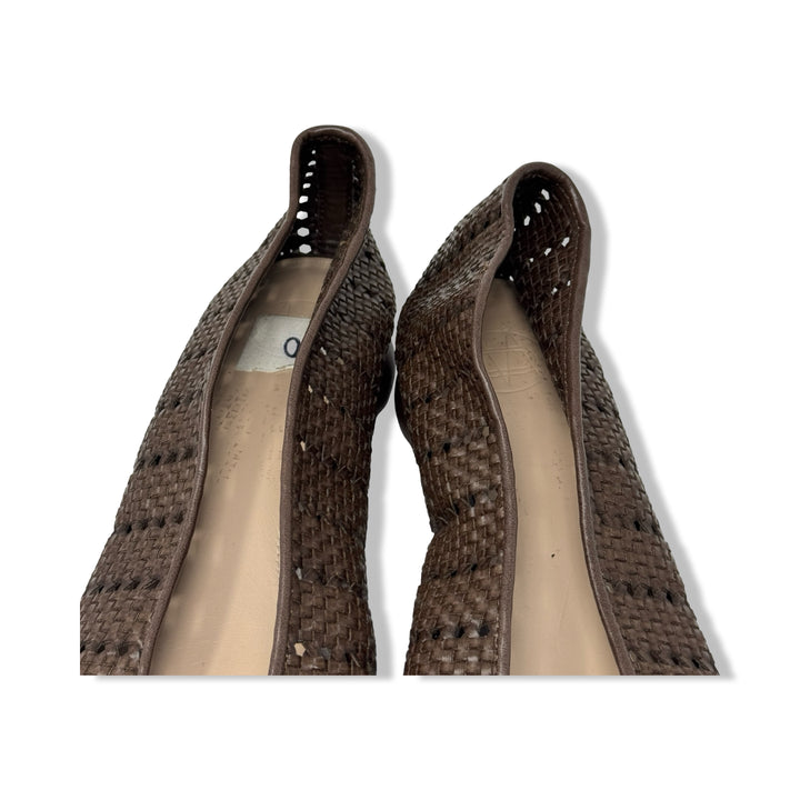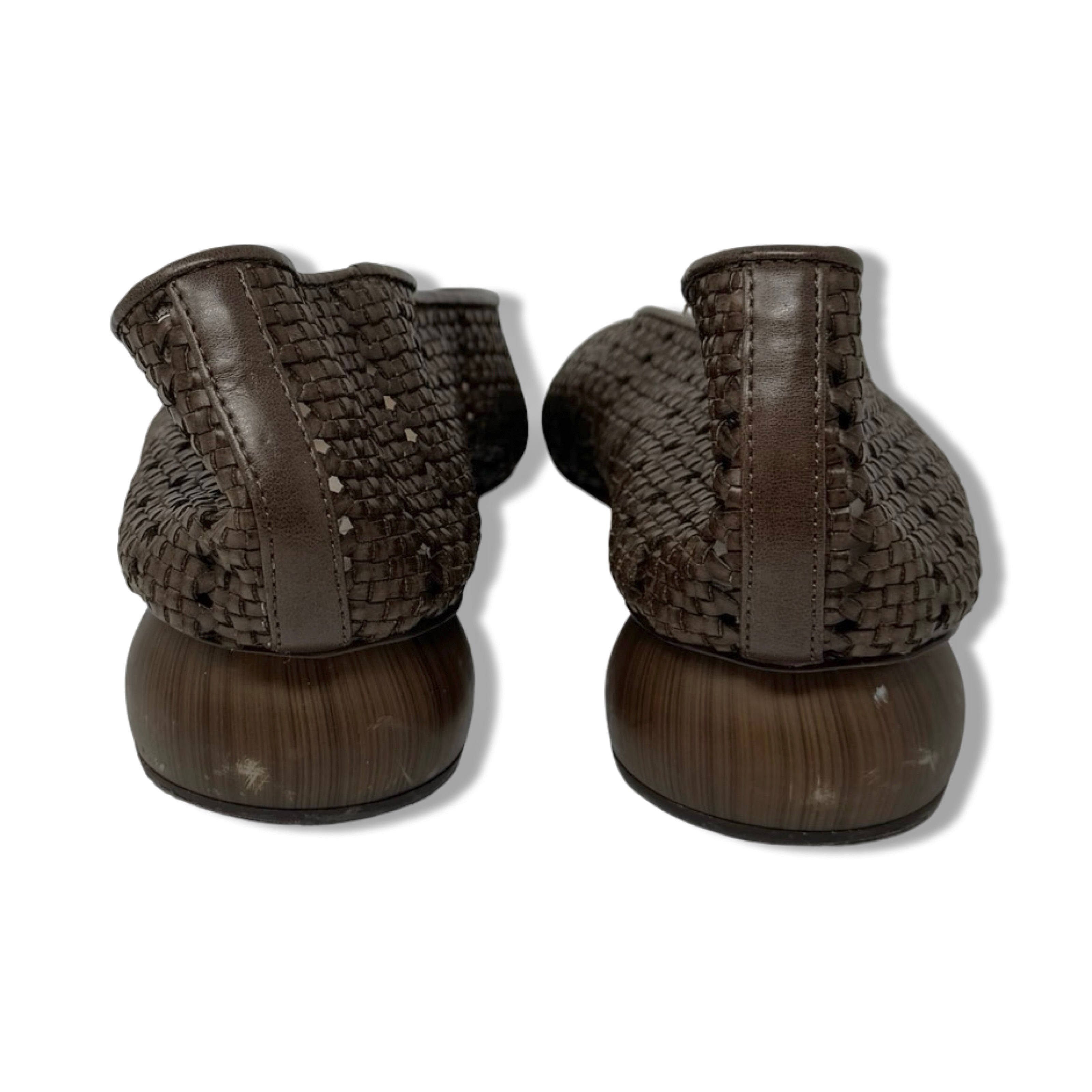- Slip on flats with woven leather detail throughout and wooden heel. Some signs of wear