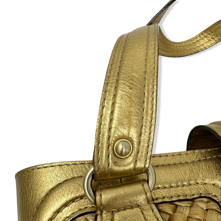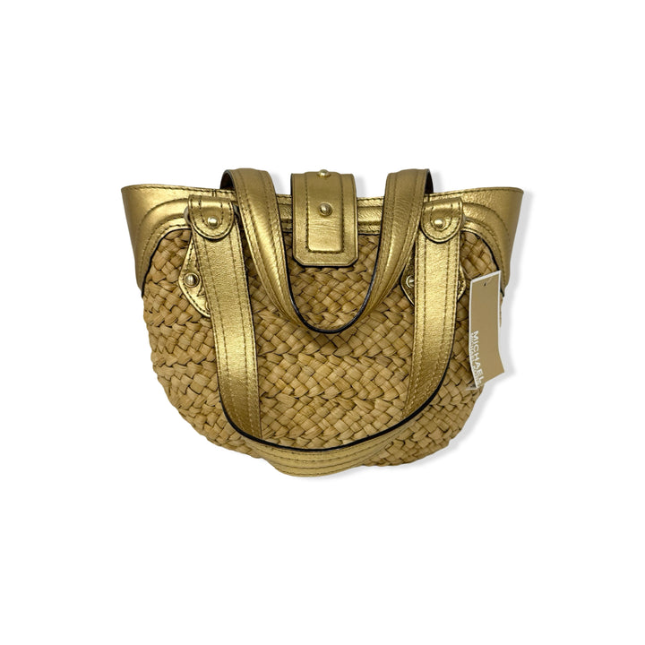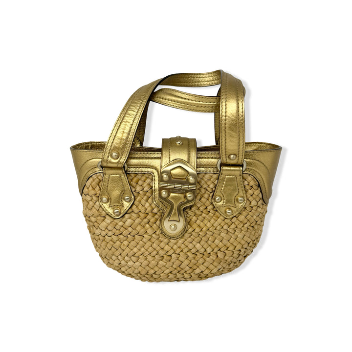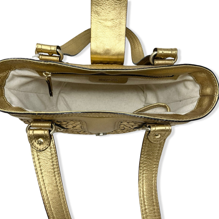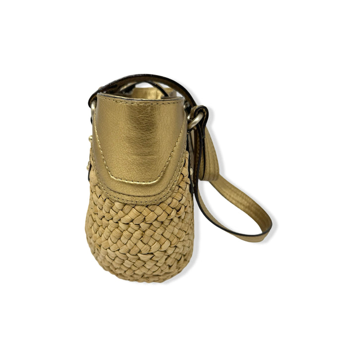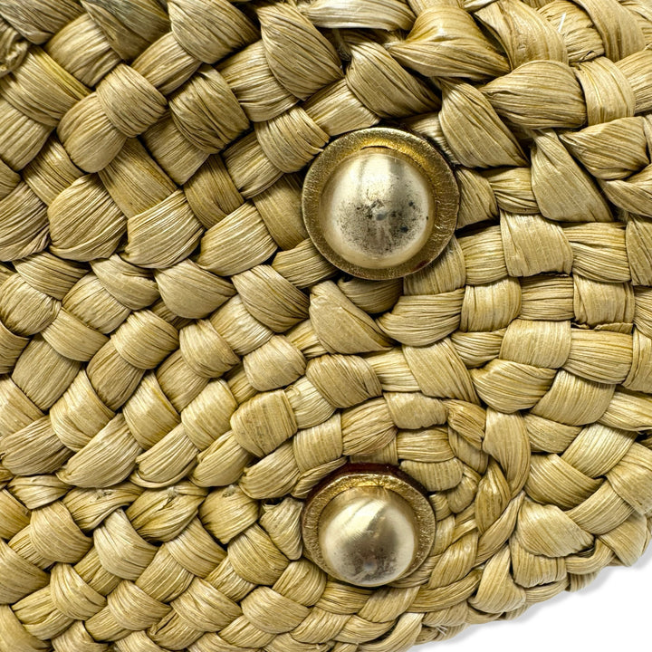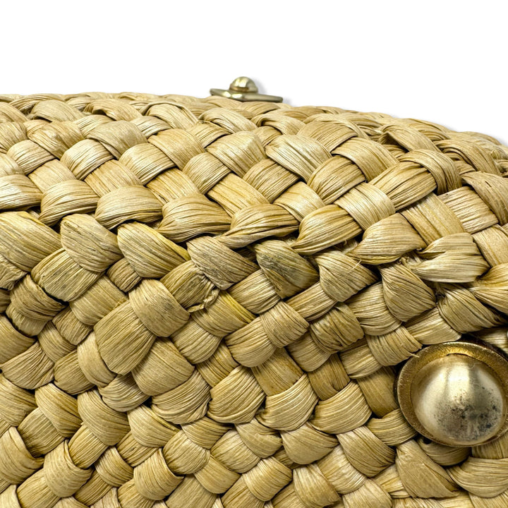 - Woven purse with metallic straps, one main inner compartment, and two smaller inner pockets.