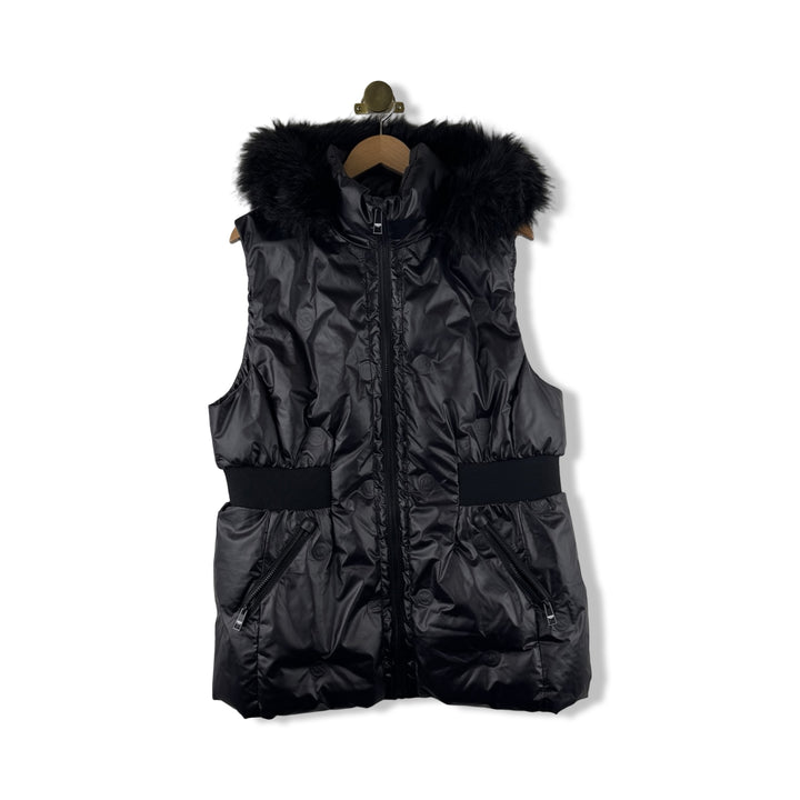 - Quilted puffer vest with fitted waist and faux fur collar