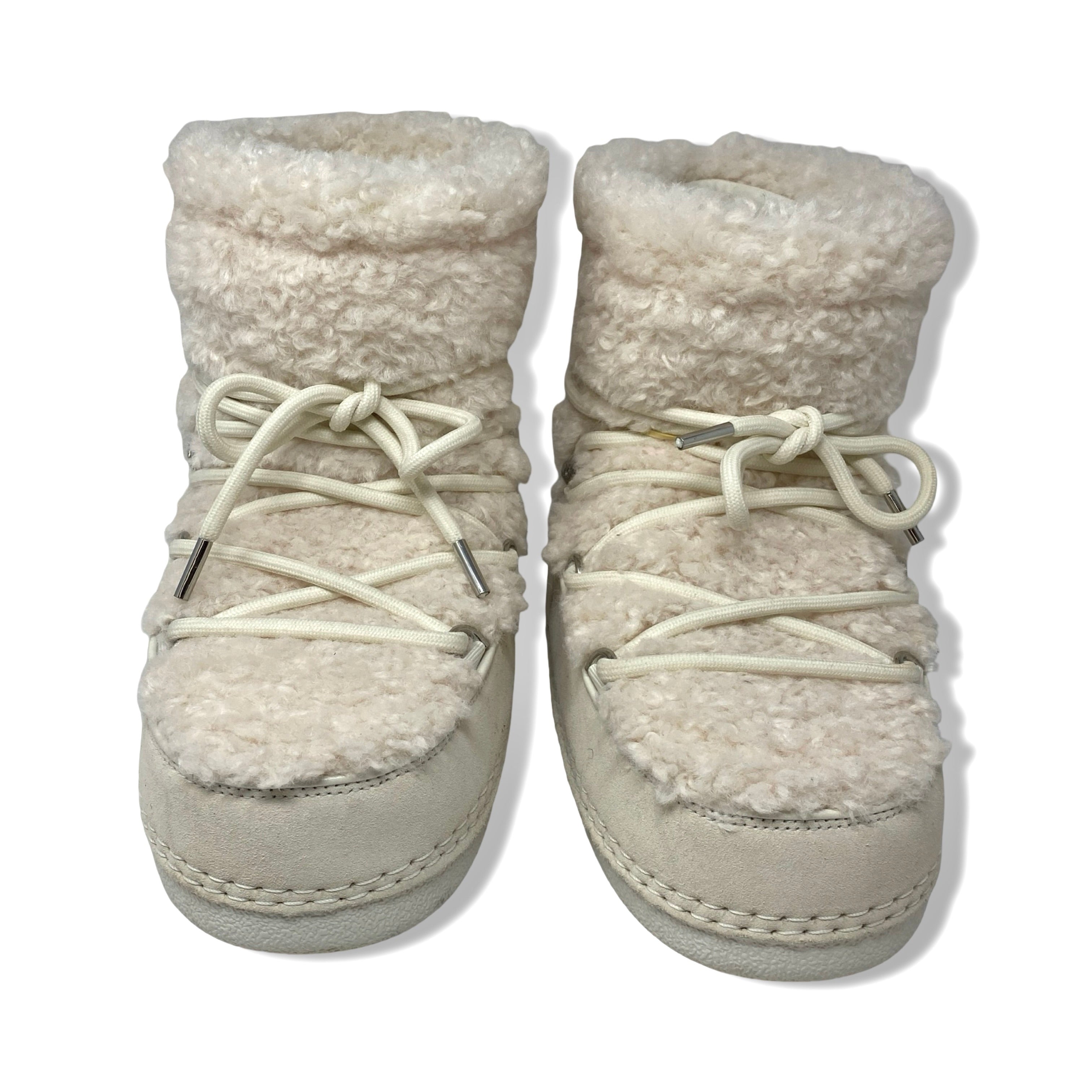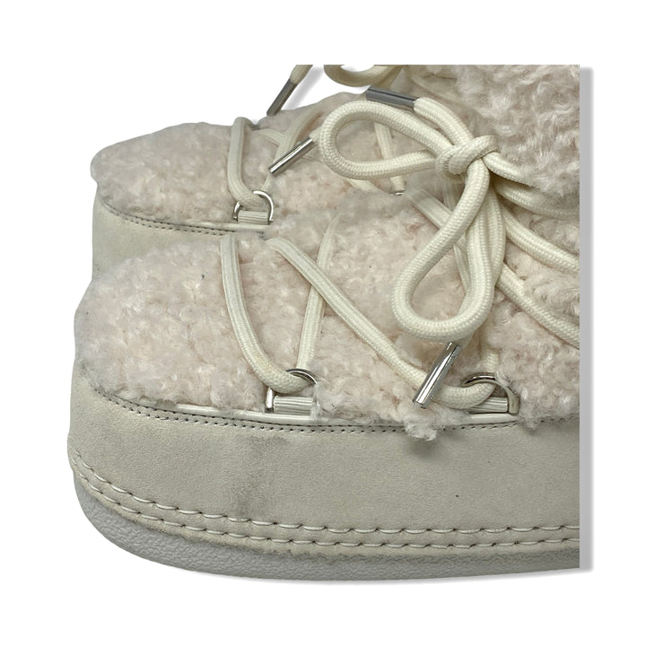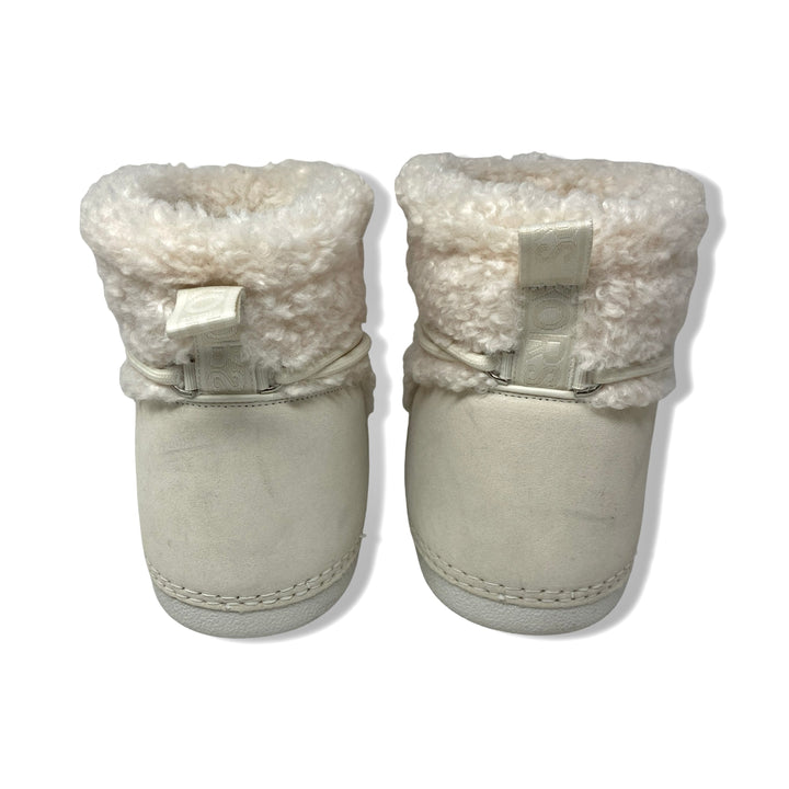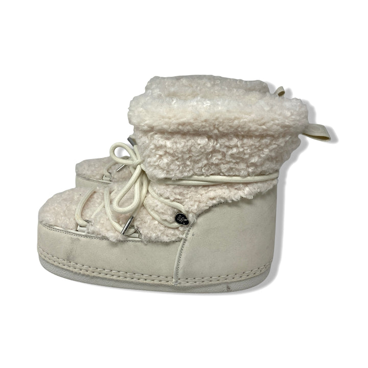 - Slip on boot made from panels of suede and sherpa with wrap-around laces for an extra-cozy fit. Pull tab on back.