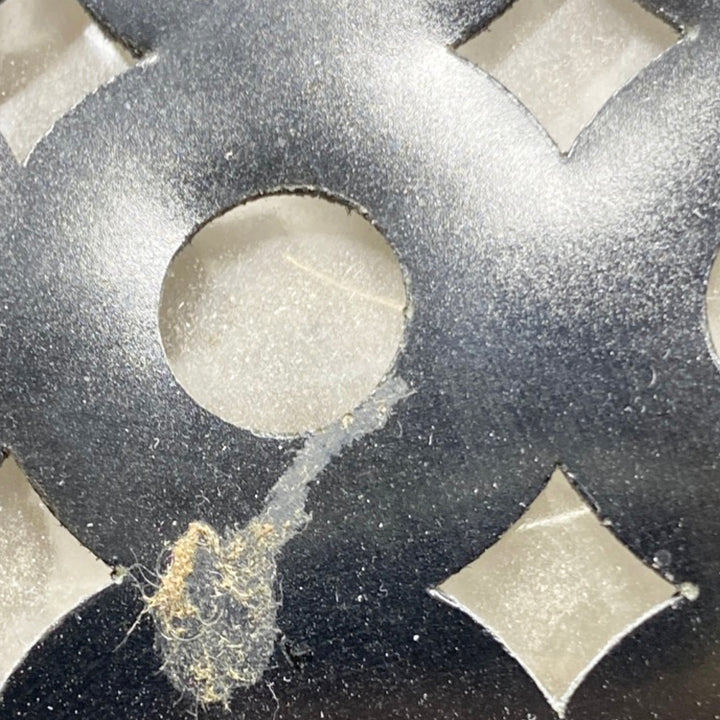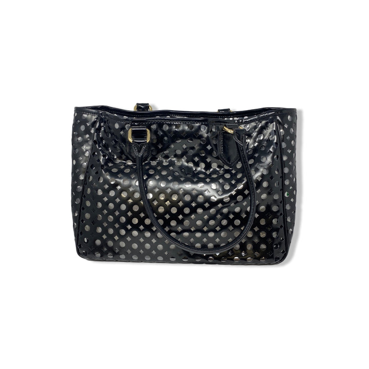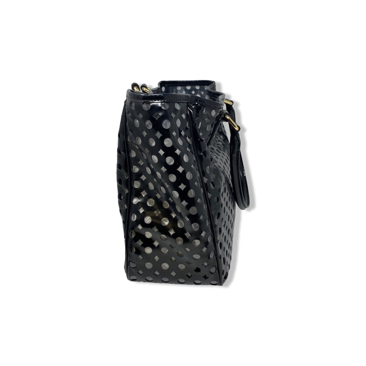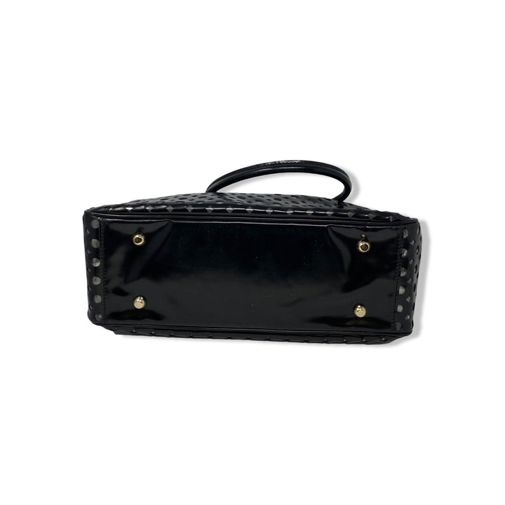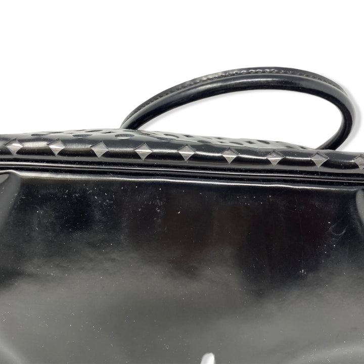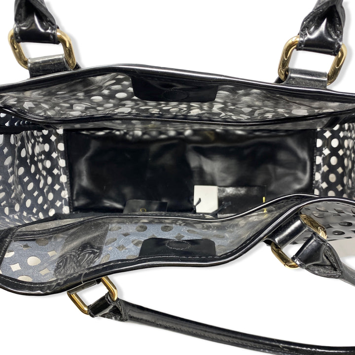 - Handbag with clear interior and shaped cut out exterior. One main inner compartment and two smaller inner pockets. Footed bottom. Signs of wear (pictured). Includes new tag