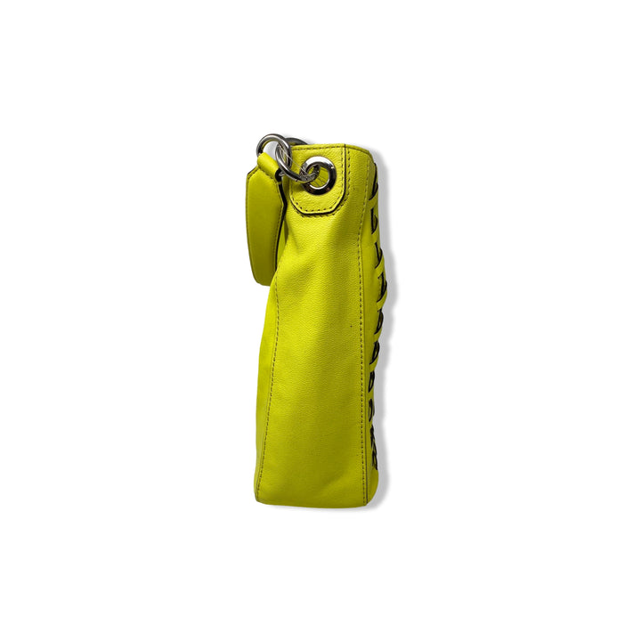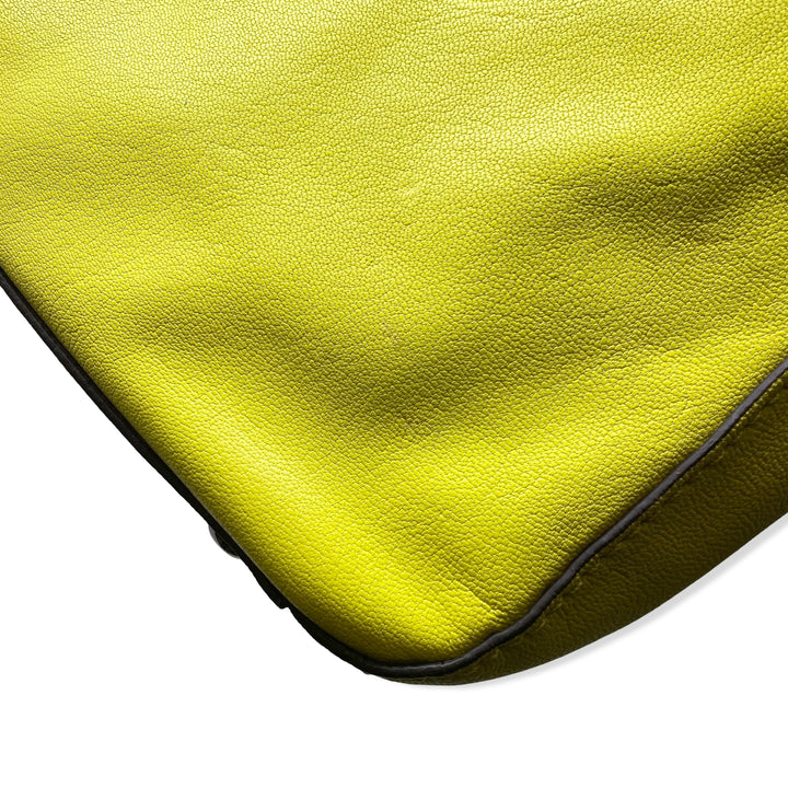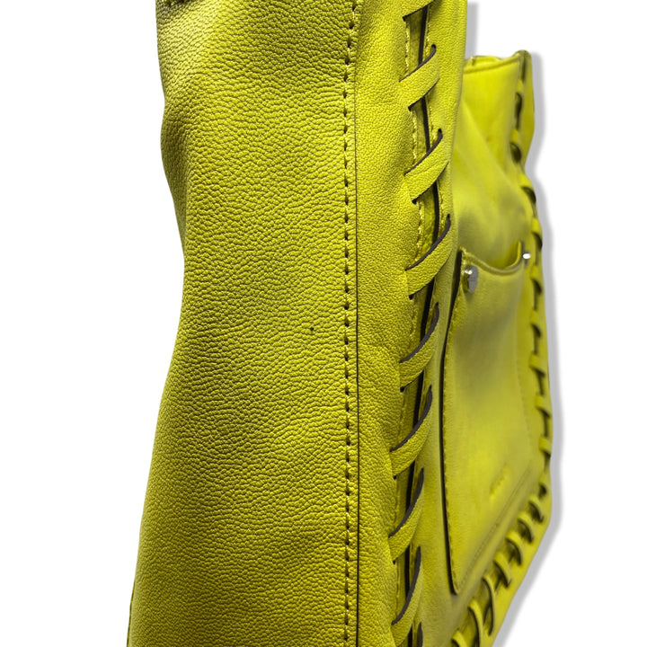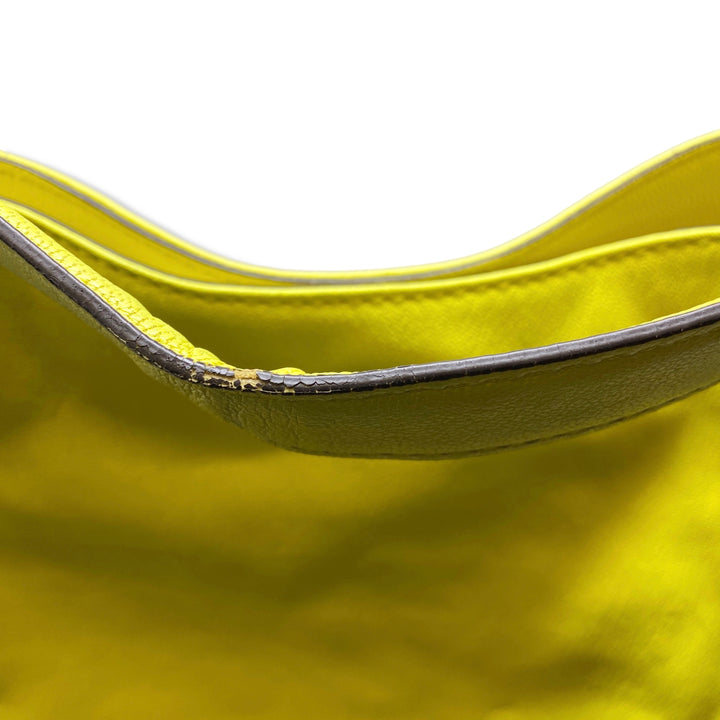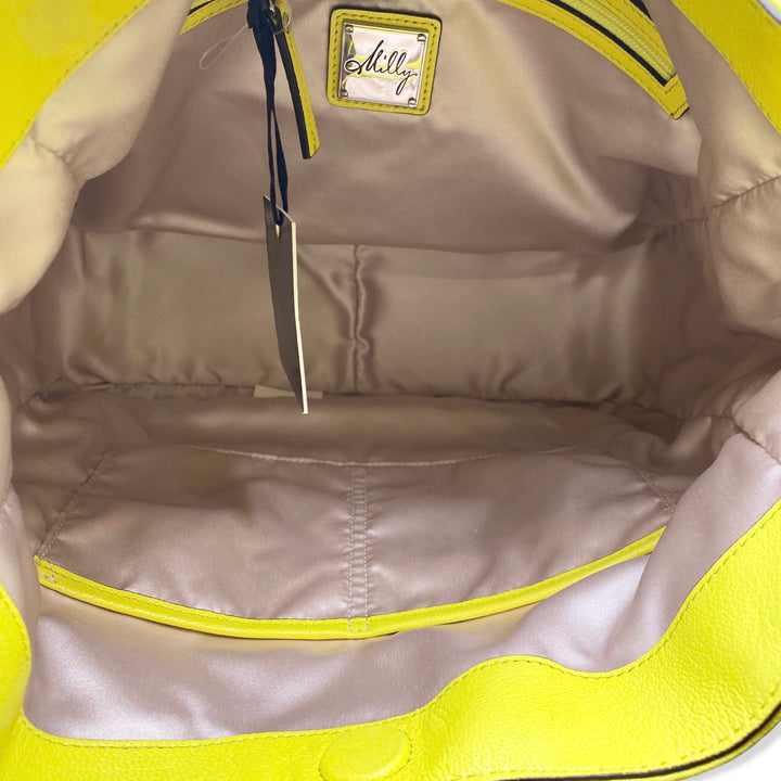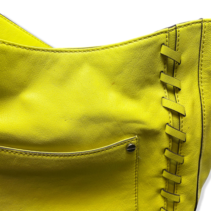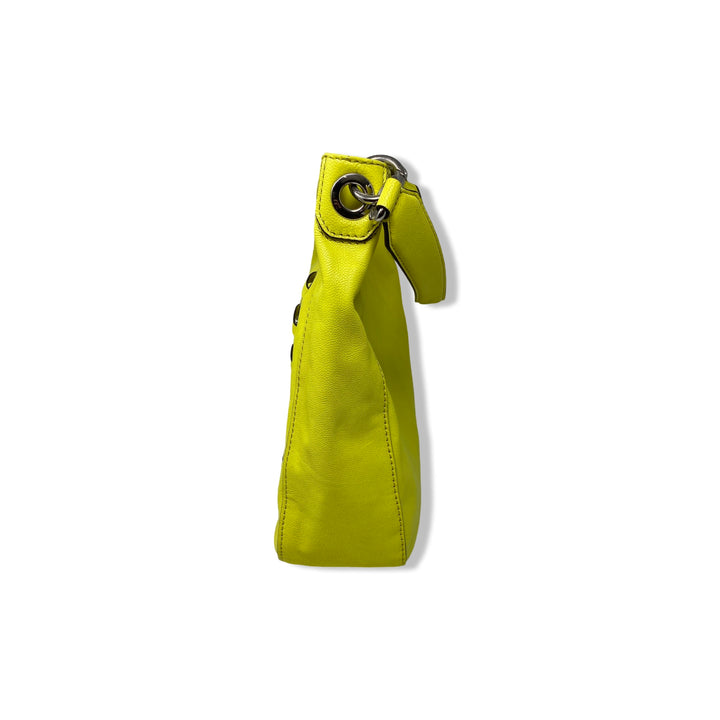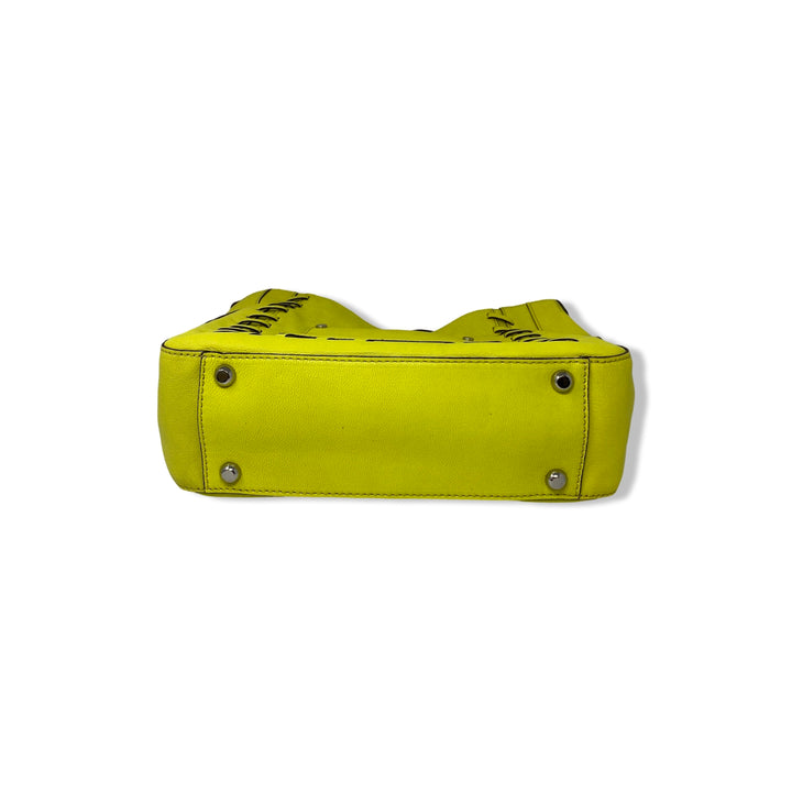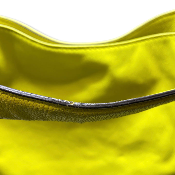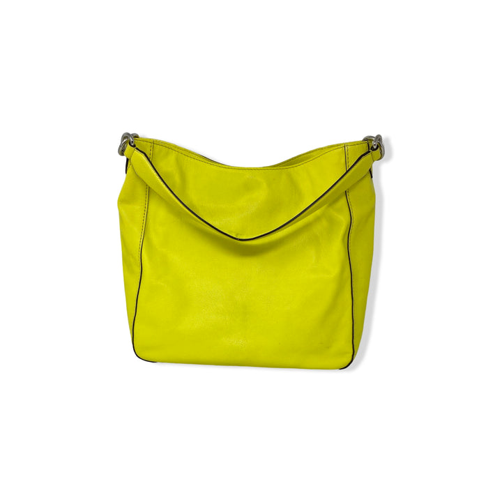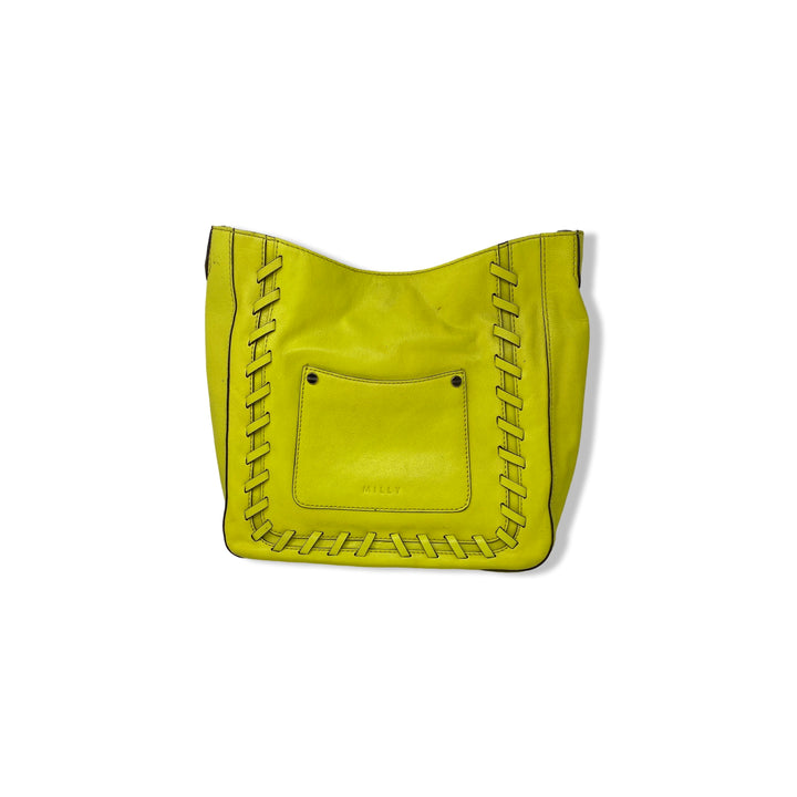 - Shoulder bag with exterior pocket, one main inner compartment, and two smaller inner pockets. Magnetic closure and footed bottom. Signs of wear (pictured)