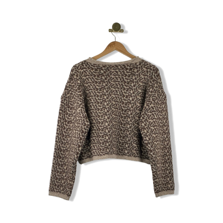 - Cheetah print button up sweater with a rolled neckline and rib knit trim.