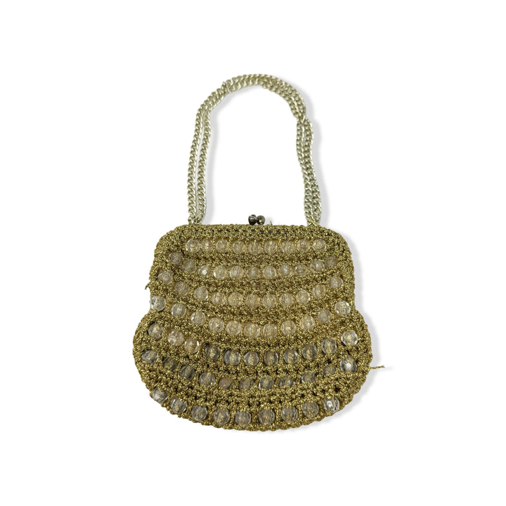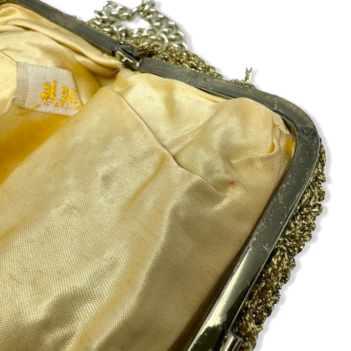 - Mini purse with metallic beaded exterior and kiss clasp closure. Some signs of wear.