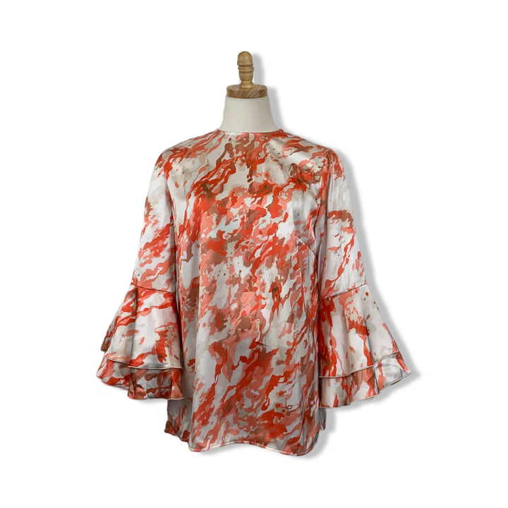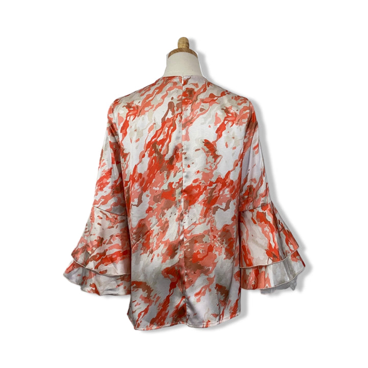 - Pullover top with an abstract pattern, flutter sleeves and zip closure on back.