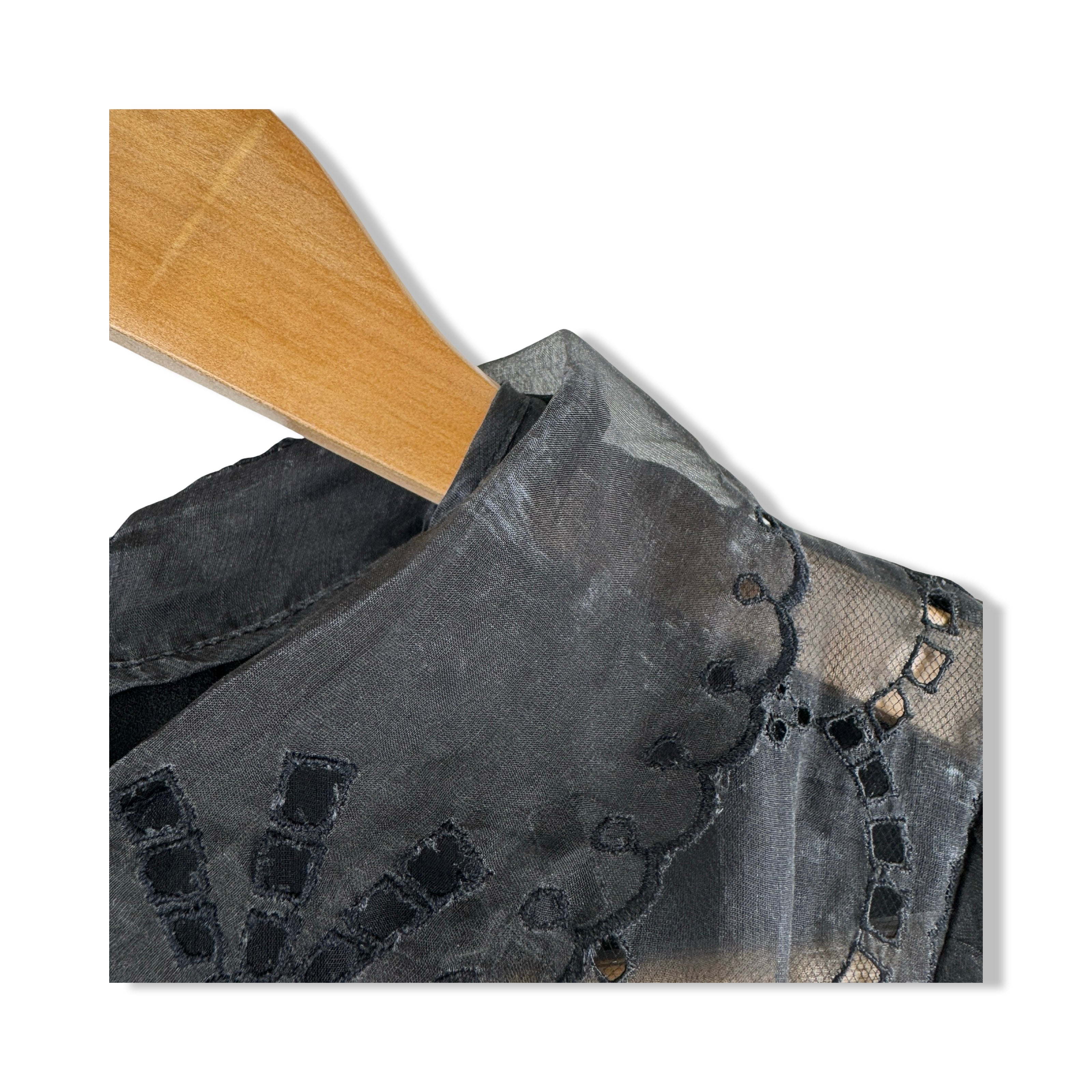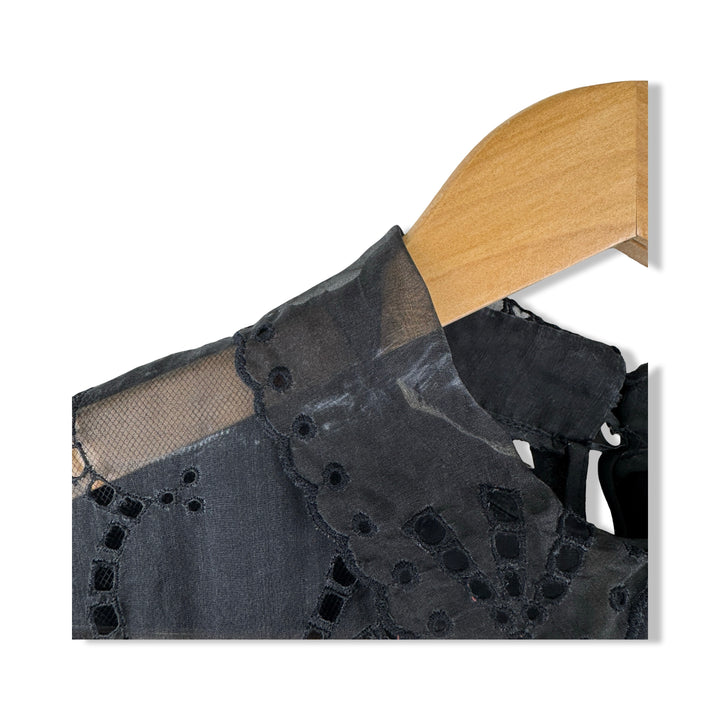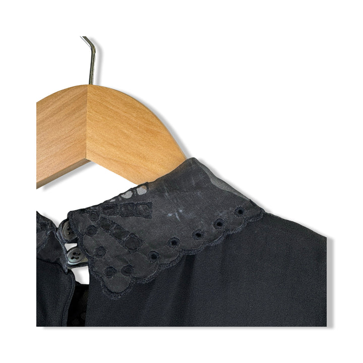 - Sleeveless collared blouse with lace yoke detail. Some signs of wear.