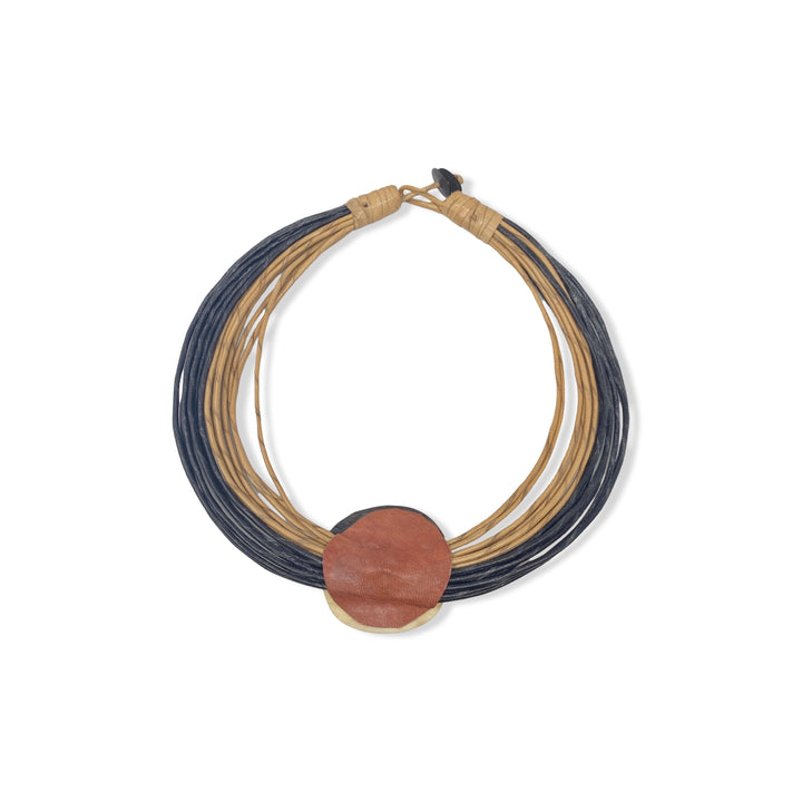 - This necklace features multiple strands of cord, with a pendant centered in the design.