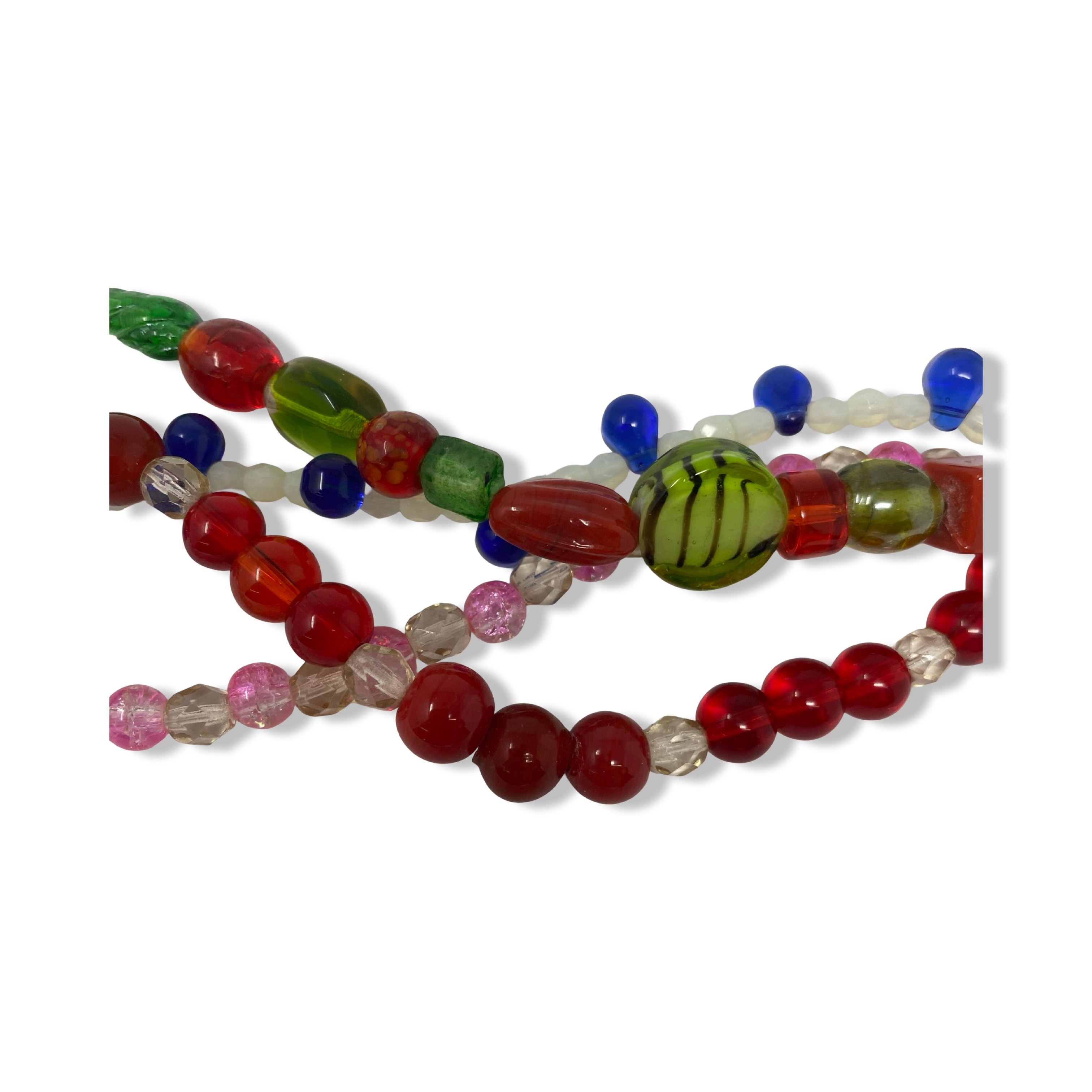 - Layered bracelet with multi-shaped bead strands and a toggle closure