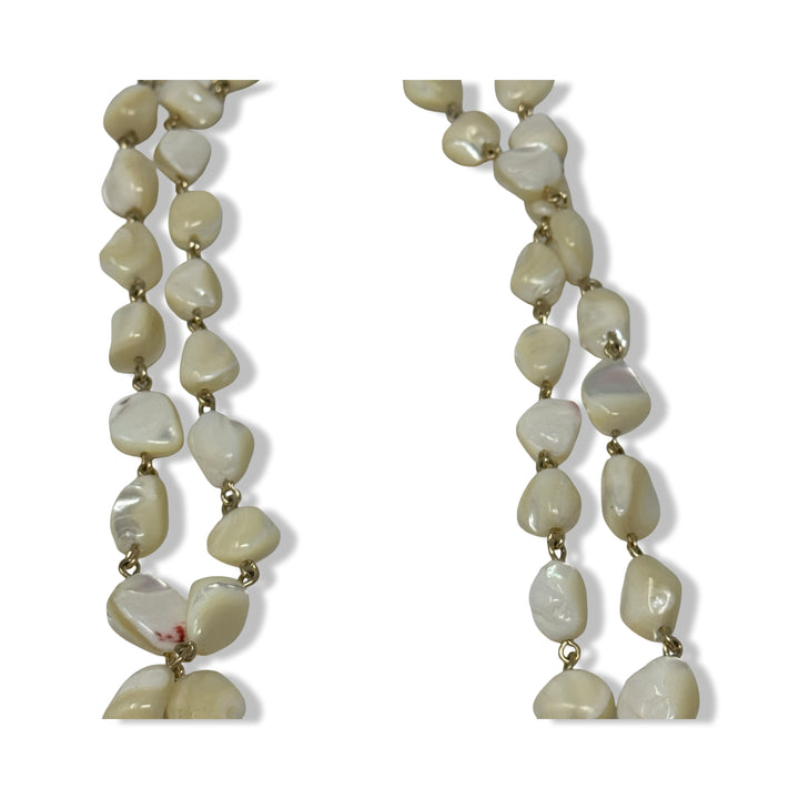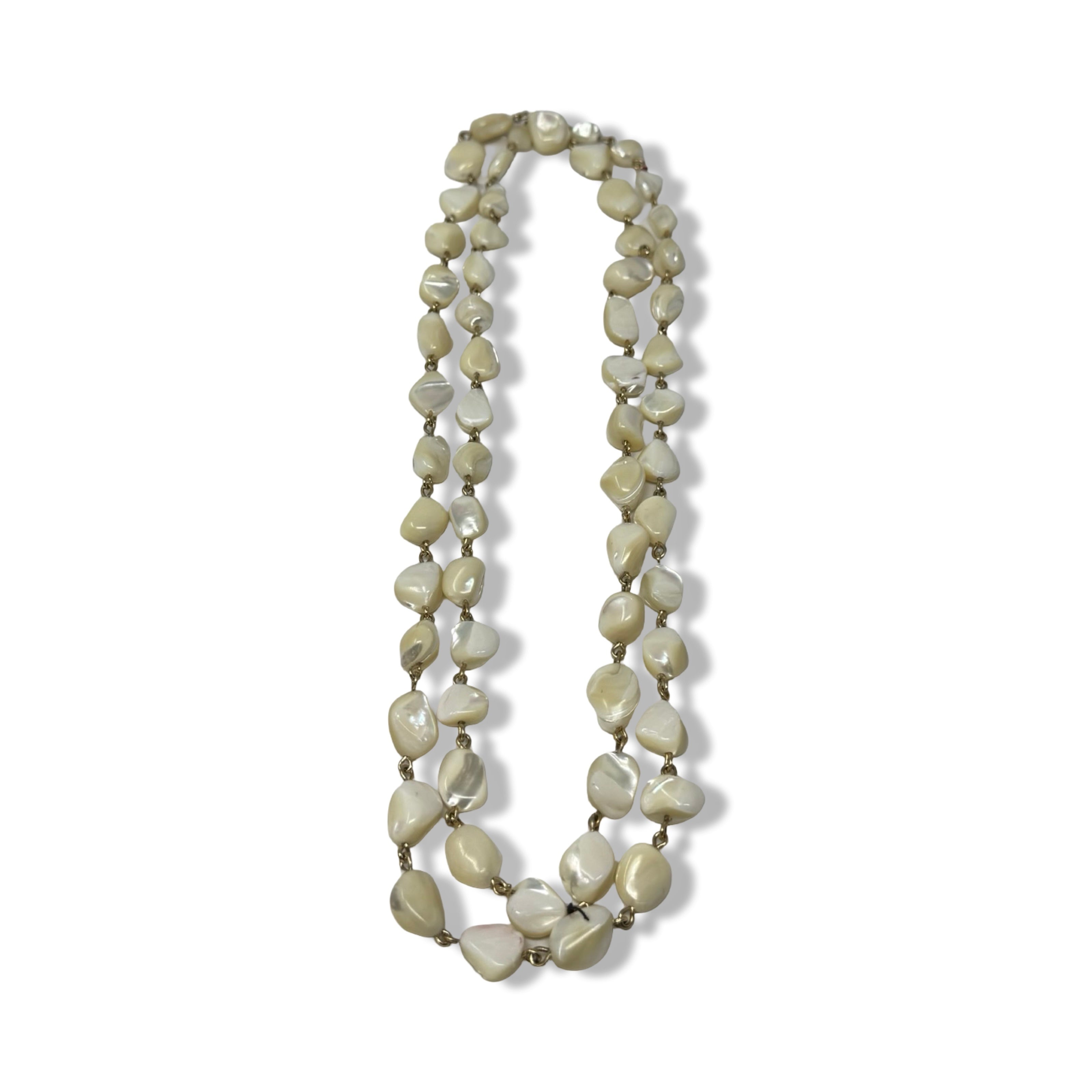 - Long necklace with iridescent beads throughout.