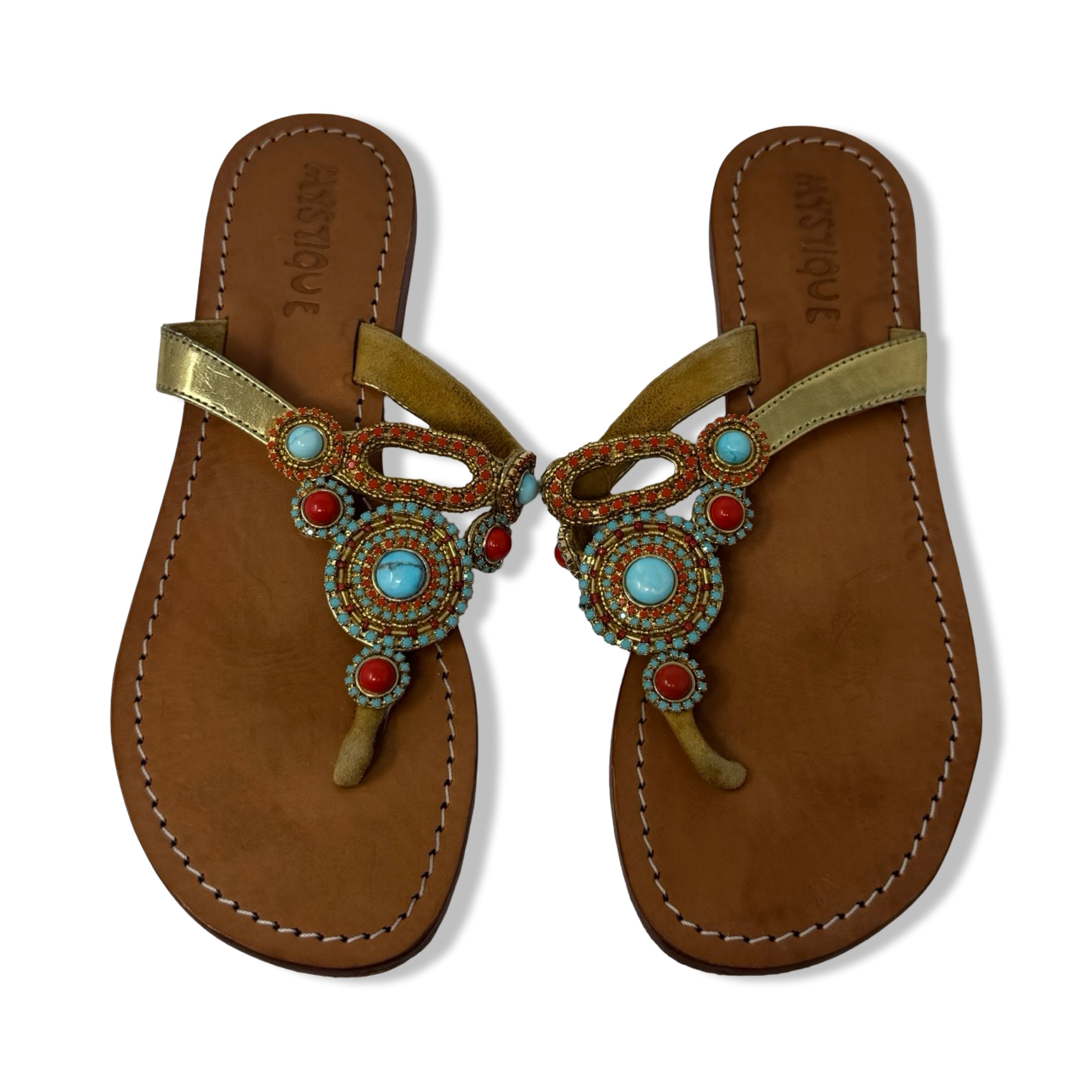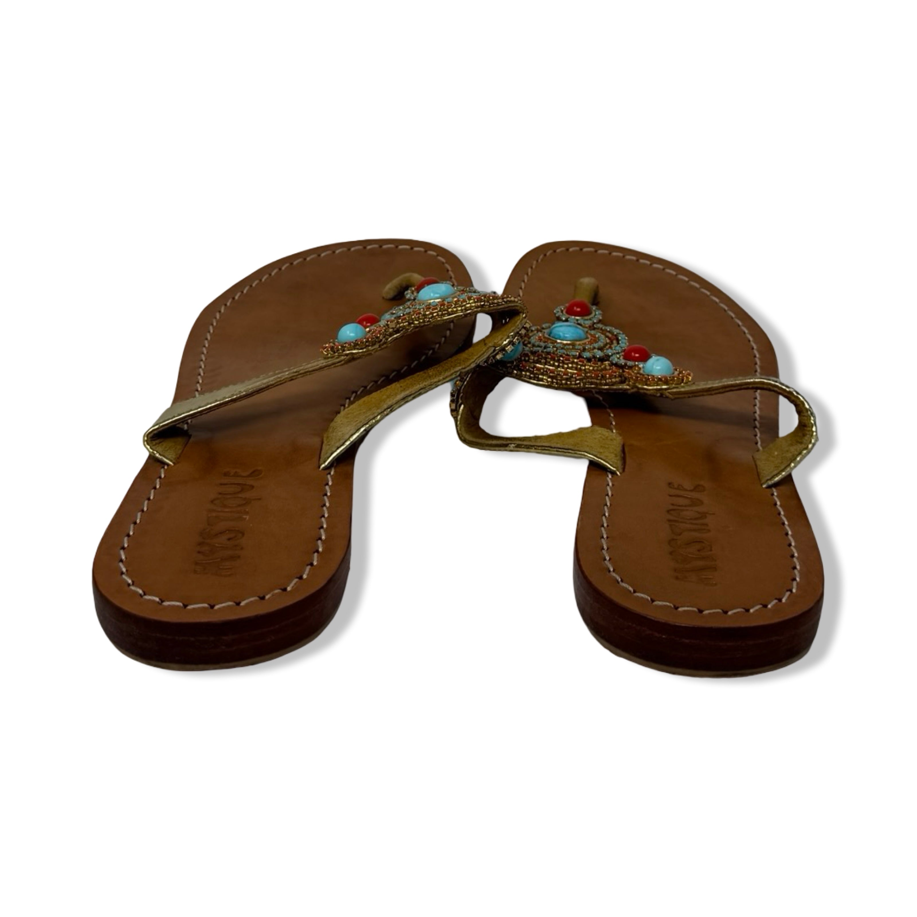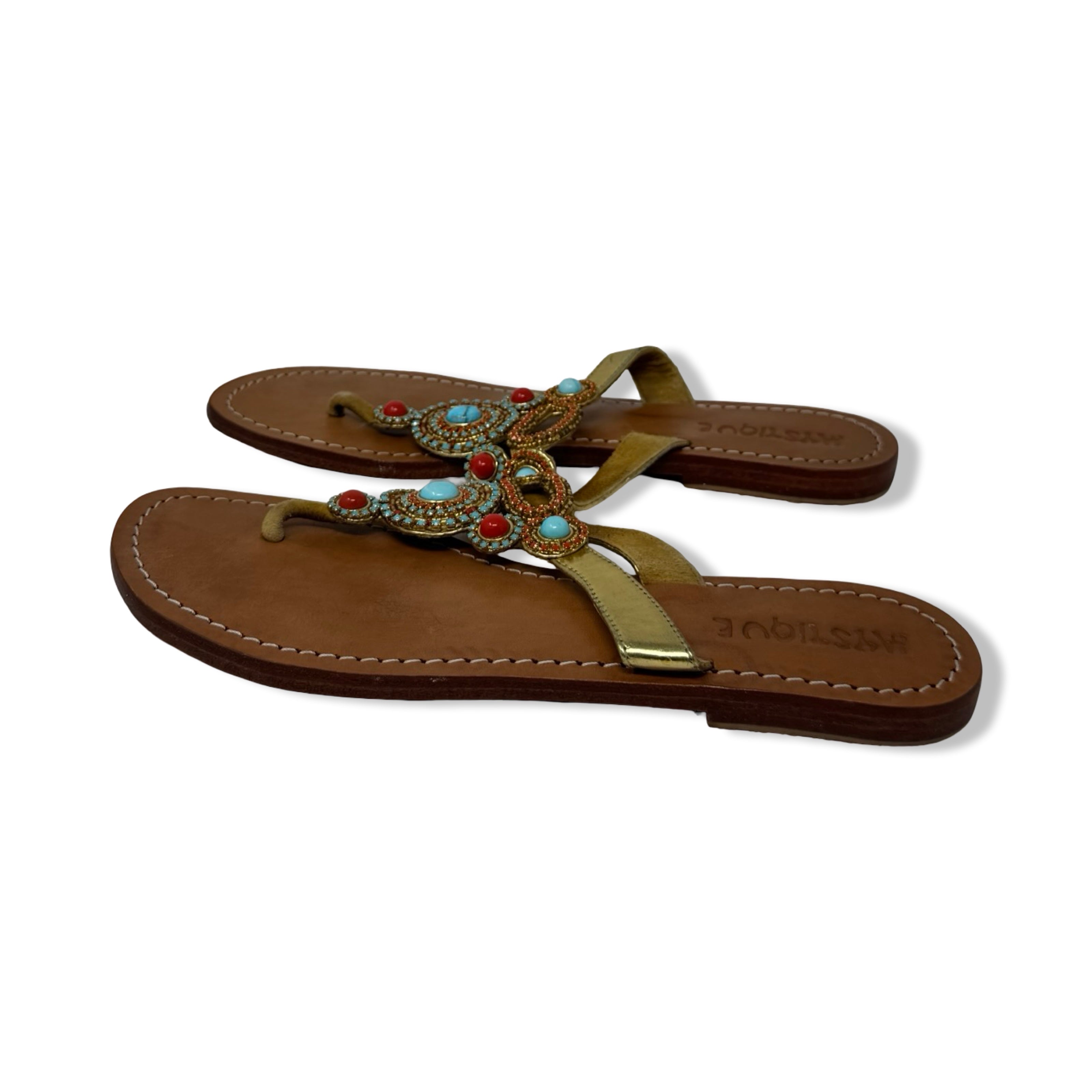 - Leather flat sandal with embellished detail on front.