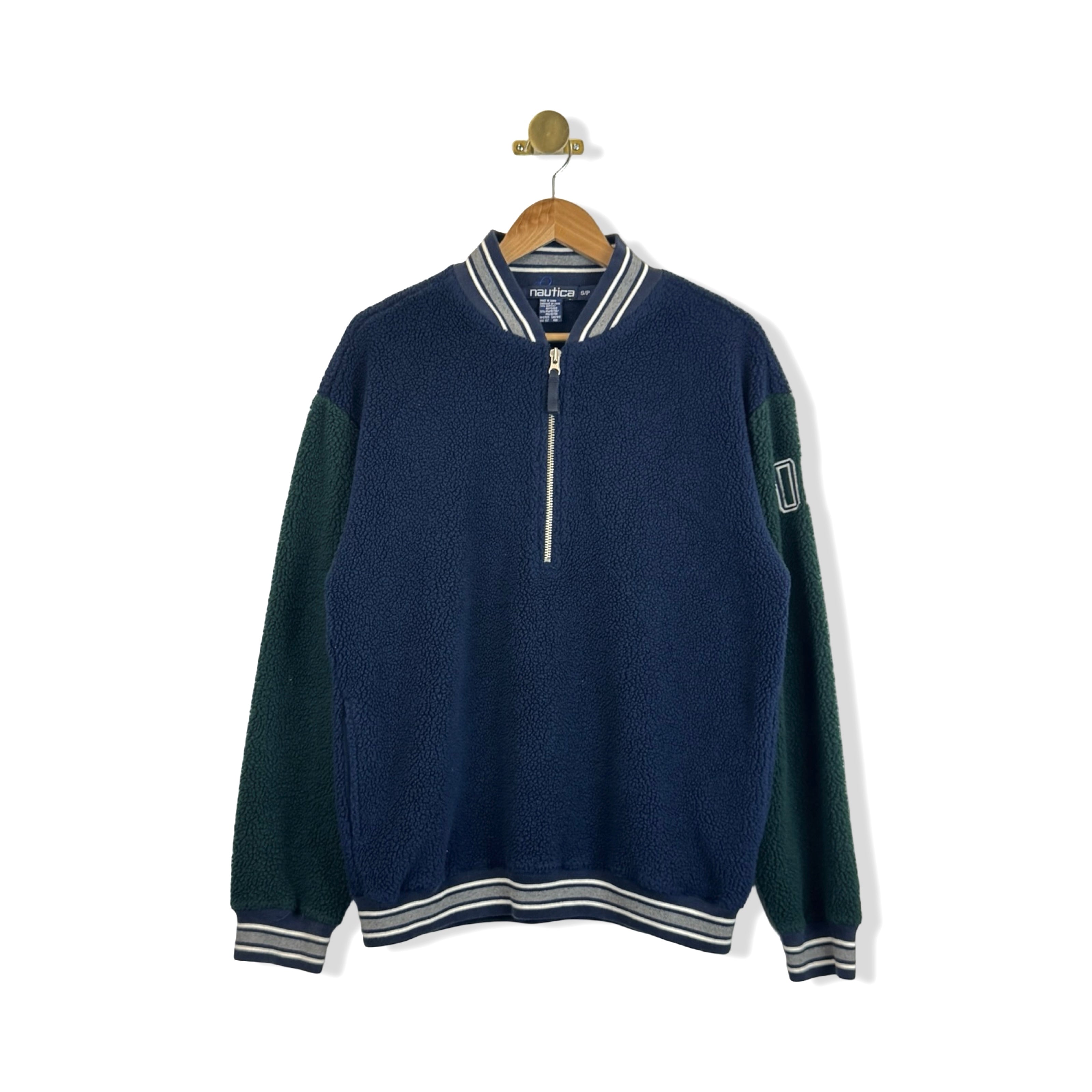 - Pullover sweater with half zip closure, side seam pockets, logo on back and rib knit collar and hem.