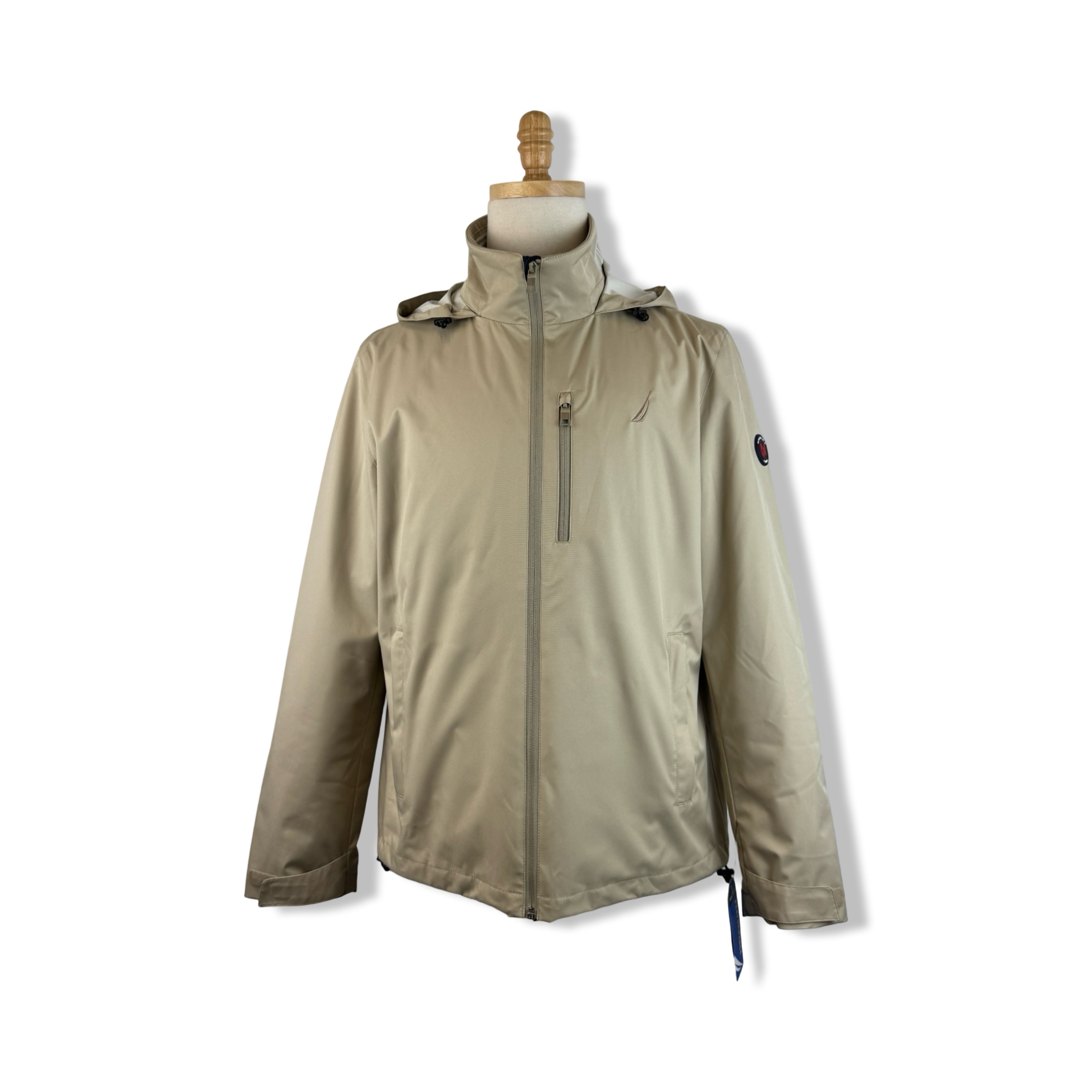- Zip up jacket with front zip pockets, hidden hood, and drawcords on hem.