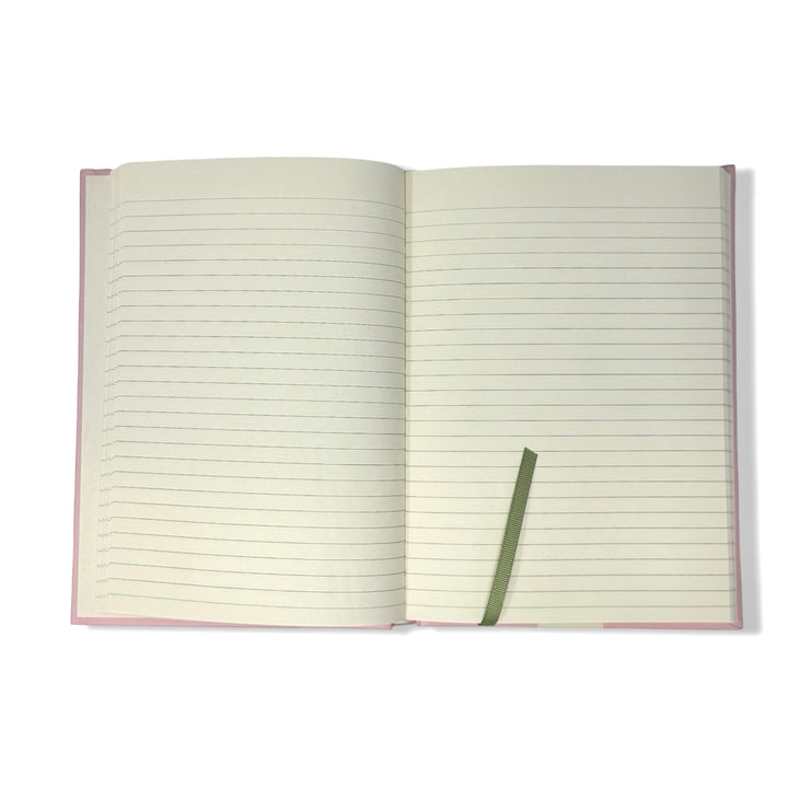- Hardcover lined notebook. Includes attached ribbon bookmark.